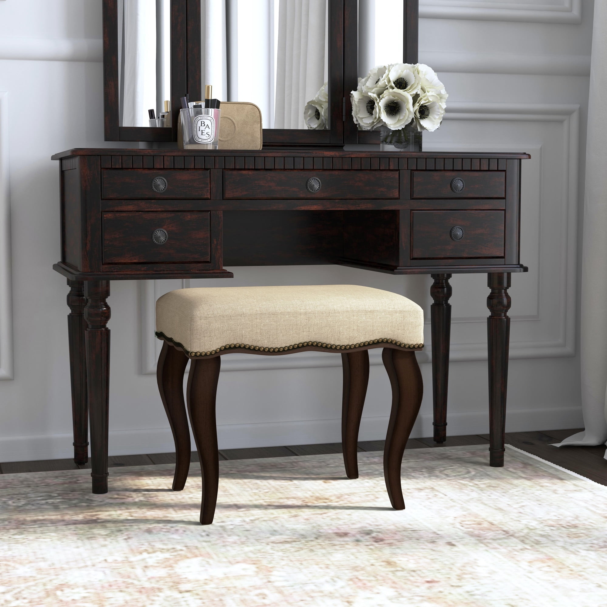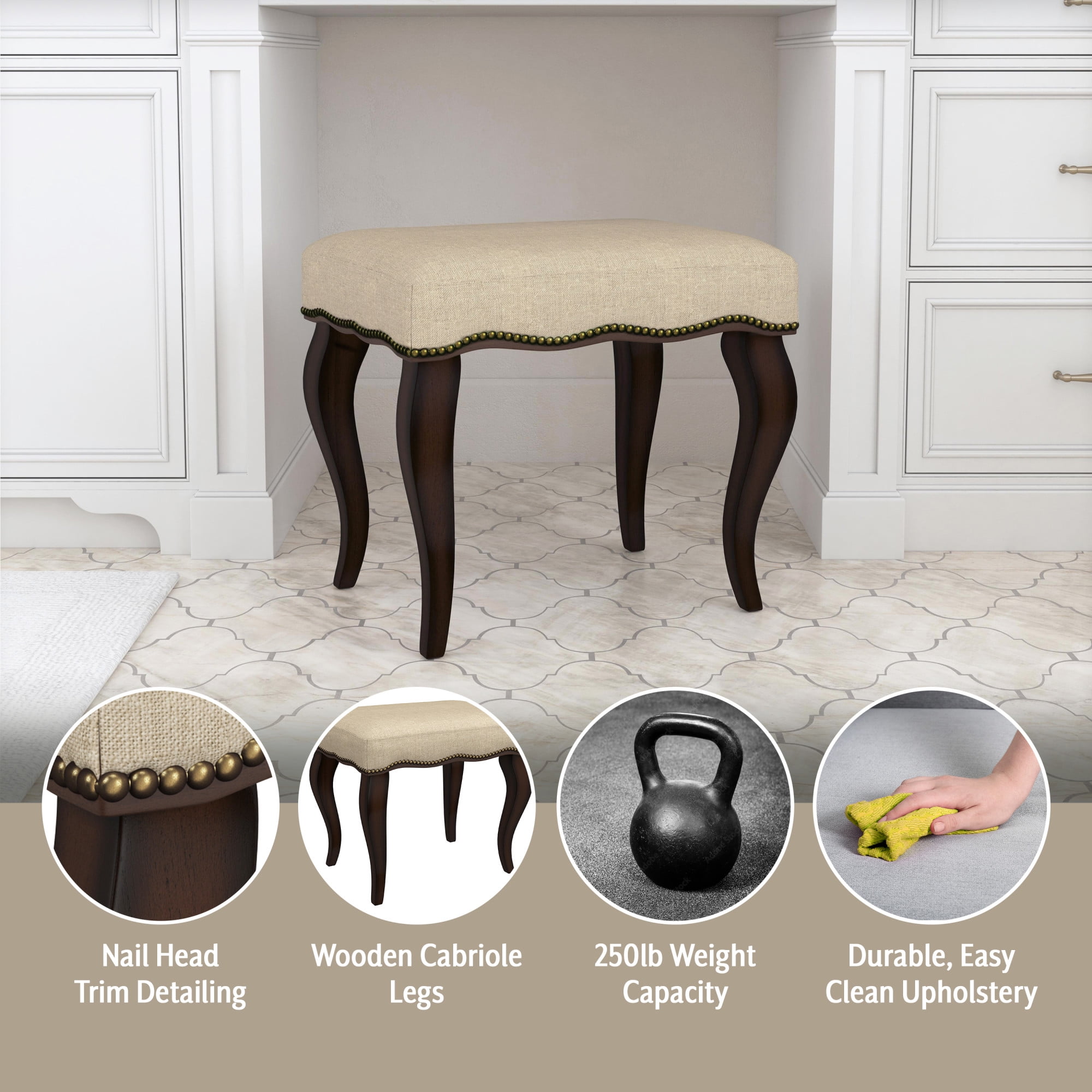 Sophistication never goes out of style. Drawing inspiration from eighteenth century opulence, this backless vanity stool brings a breath of fresh air to the grandeur of the Queen Anne era with traditional-but-modern design. Undulating nail head trim and burnished oak cabriole legs come together with durable creamy, cotton-blend fabric to lend a stately air to any room. Grand enough for a palace yet classic enough for the modern home, this vanity seat fits seamlessly into any design. Assembly required. Features: Finish: Cream/Burnished Oak Material: Wood and Fabric (90% Polyester, 10% Cotton) Stately backless rectangle vanity stool with nail head trim detailing Strong padded cream polyester linen blend cushioned seat for durability and comfort Solid rubberwood legs in rich, on-trend burnished oak finish Classic, clean style complements any room as accent seating or ottoman Spot or wipe clean For residential use only Specifications: Stool Dimensions: 19″H x 20.5″W x 15.8″D Product Weight: 10 lbs Weight Capacity: 250 lbs Assembly Required: Yes