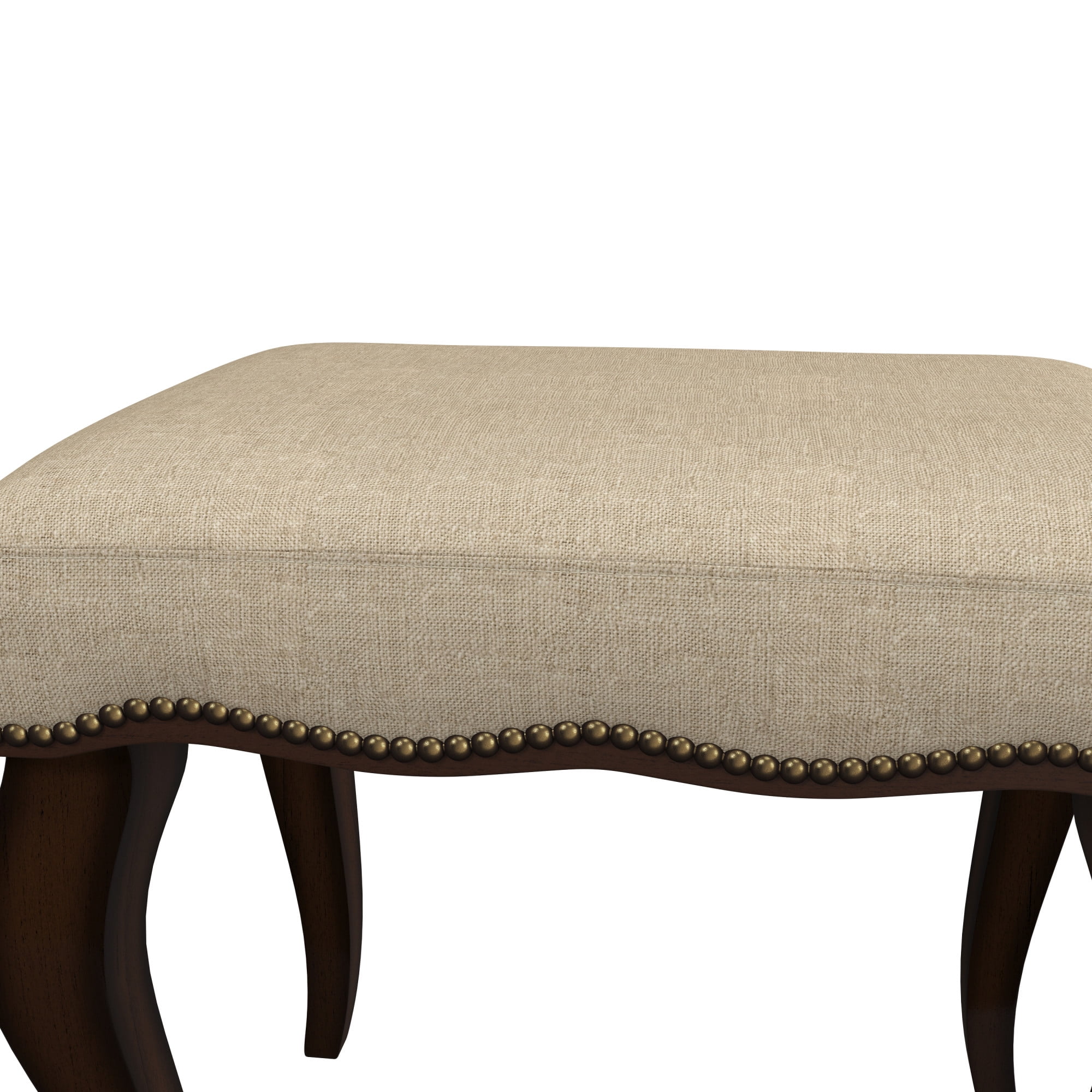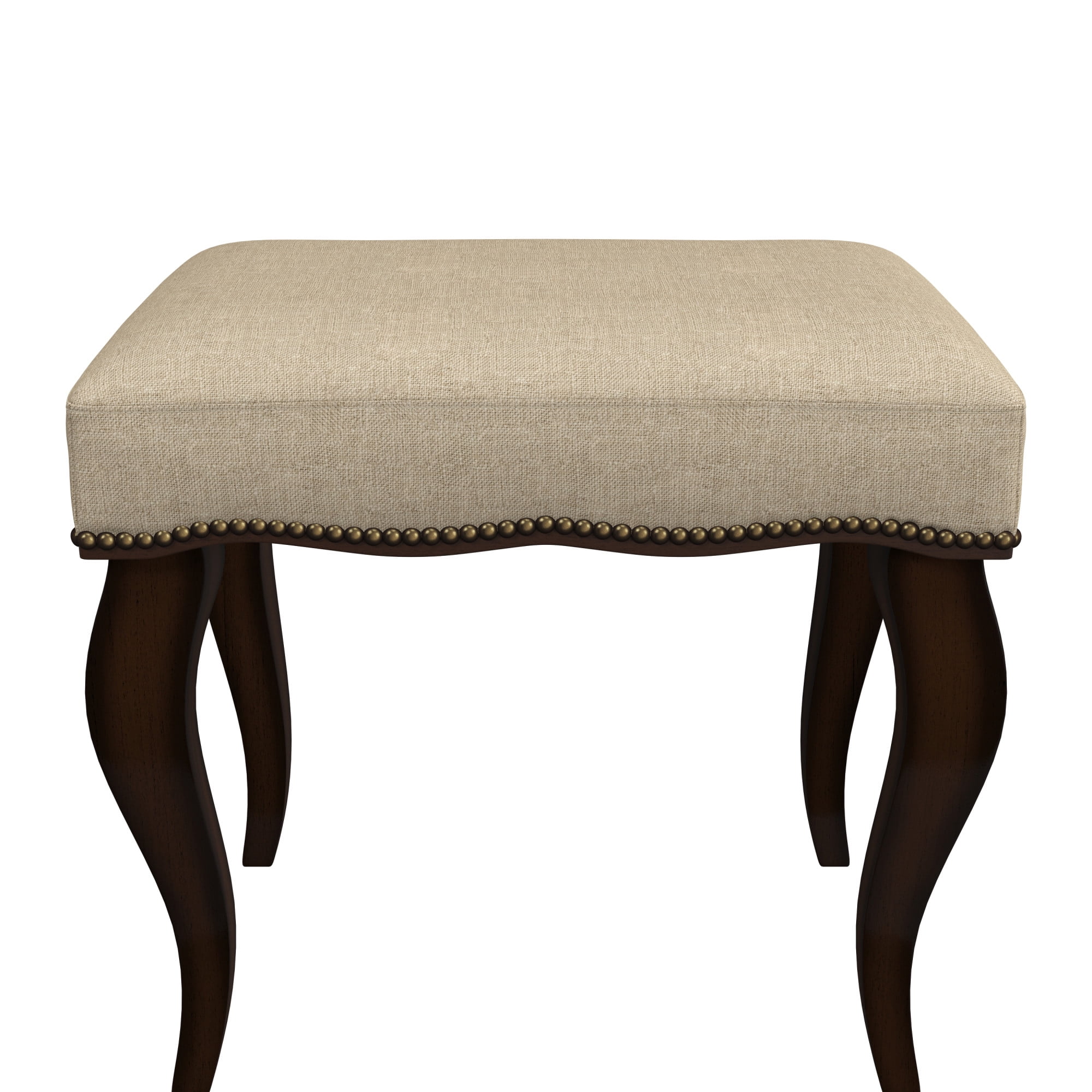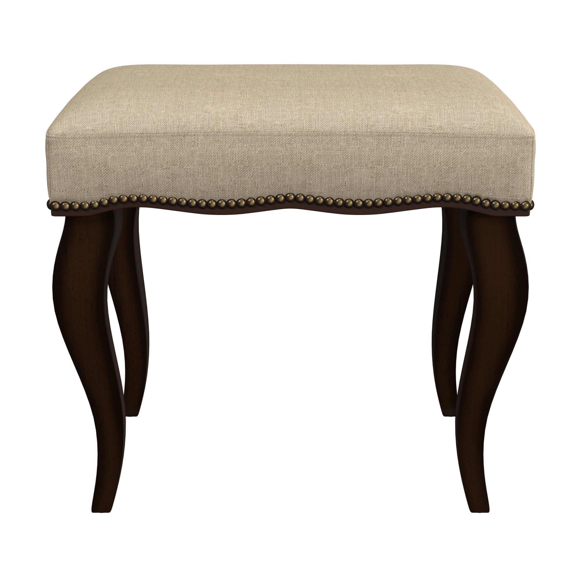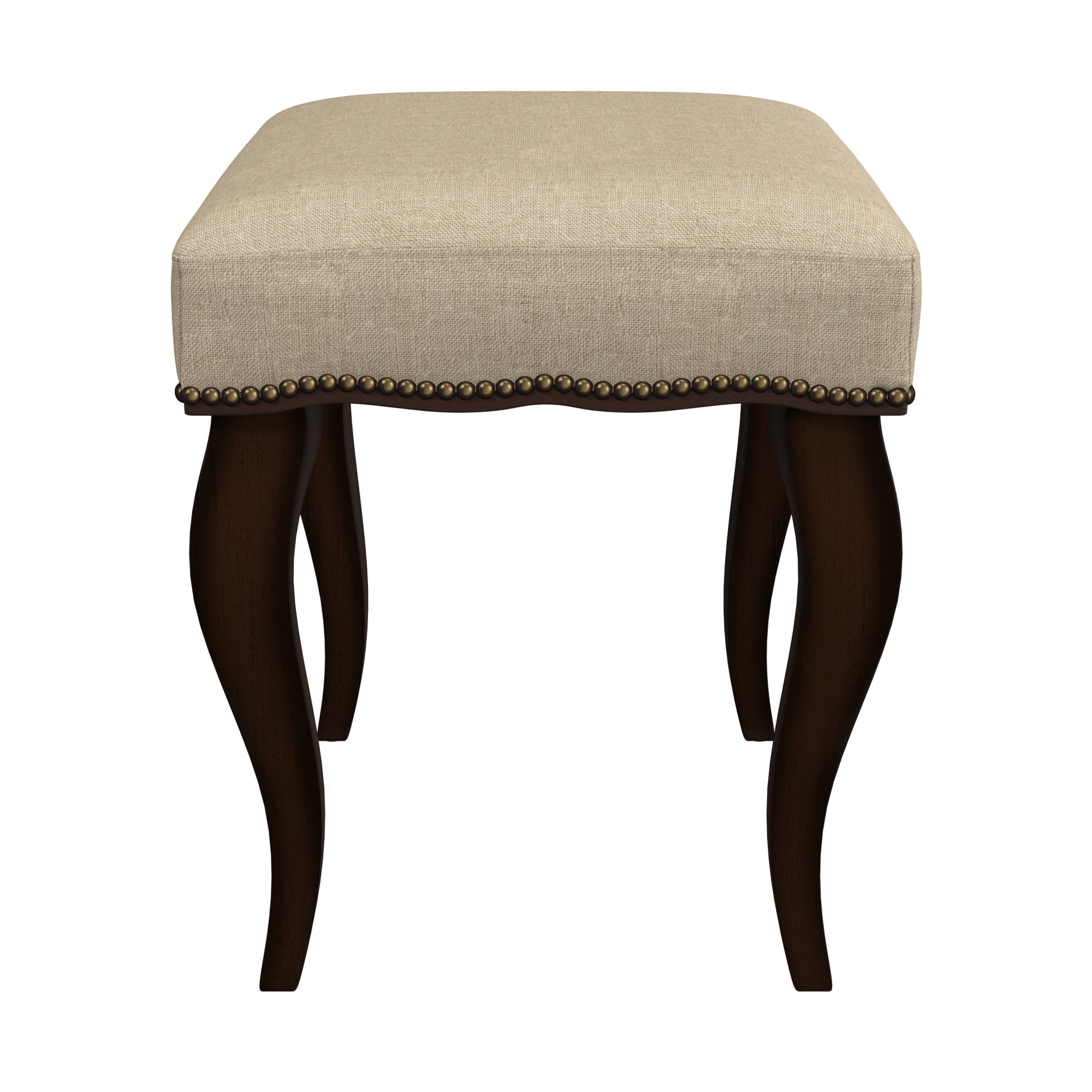 Finish: Cream/Burnished Oak Material: Wood and Fabric (90% Polyester, 10% Cotton) Stately backless rectangle vanity stool with nail head trim detailing Strong padded cream polyester linen blend cushioned seat for durability and comfort Solid rubberwood legs in rich, on-trend burnished oak finish Classic, clean style complements any room as accent seating or ottoman Spot or wipe clean For residential use only