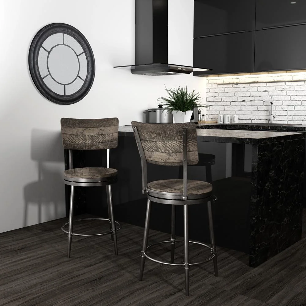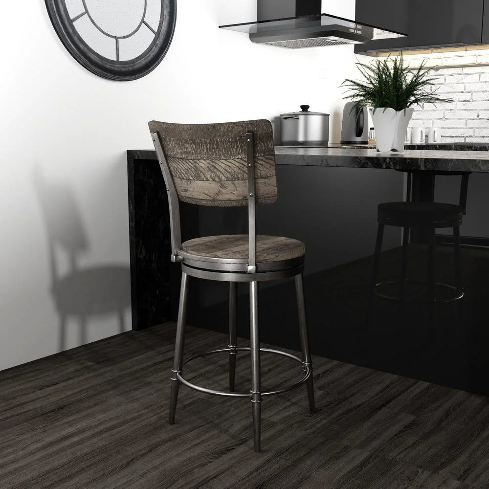 Material: Metal, Wood Finish: Gray Metal and wood counter height stool with 360-degree swivel The beauty of the contrasting woodgrain is finished in weathered gray Sturdy steel constructed frame in rubbed pewter adds longevity for years to come Ships one stool in one box Works best with counters or tables that are 34-38 inches in height Assembly required