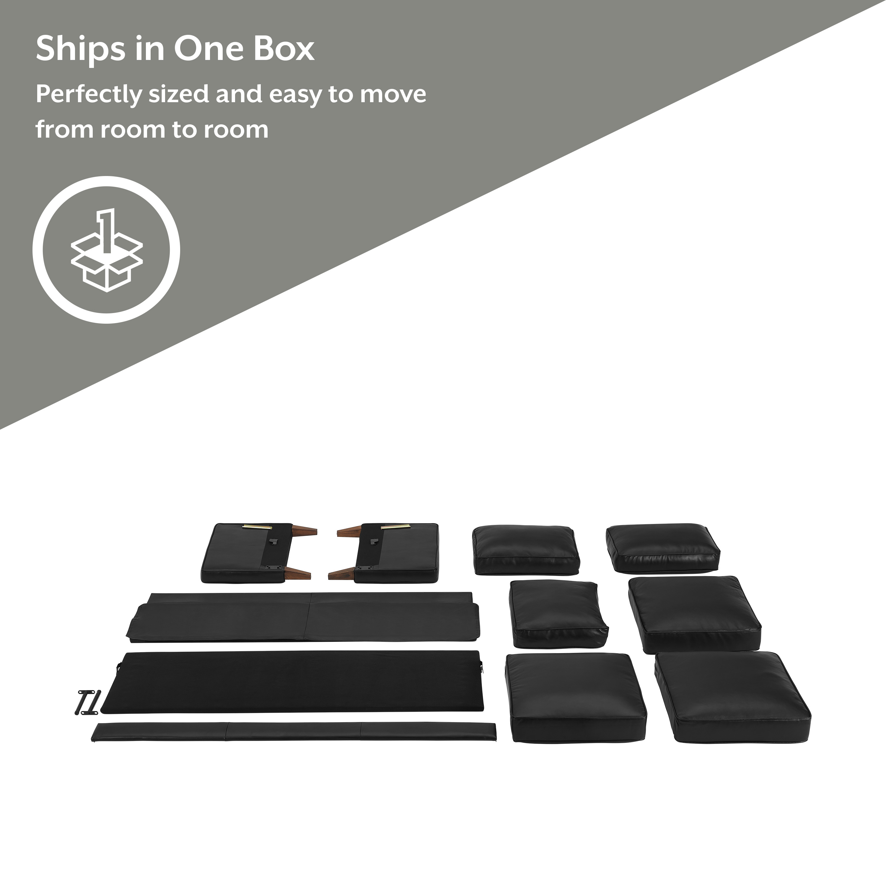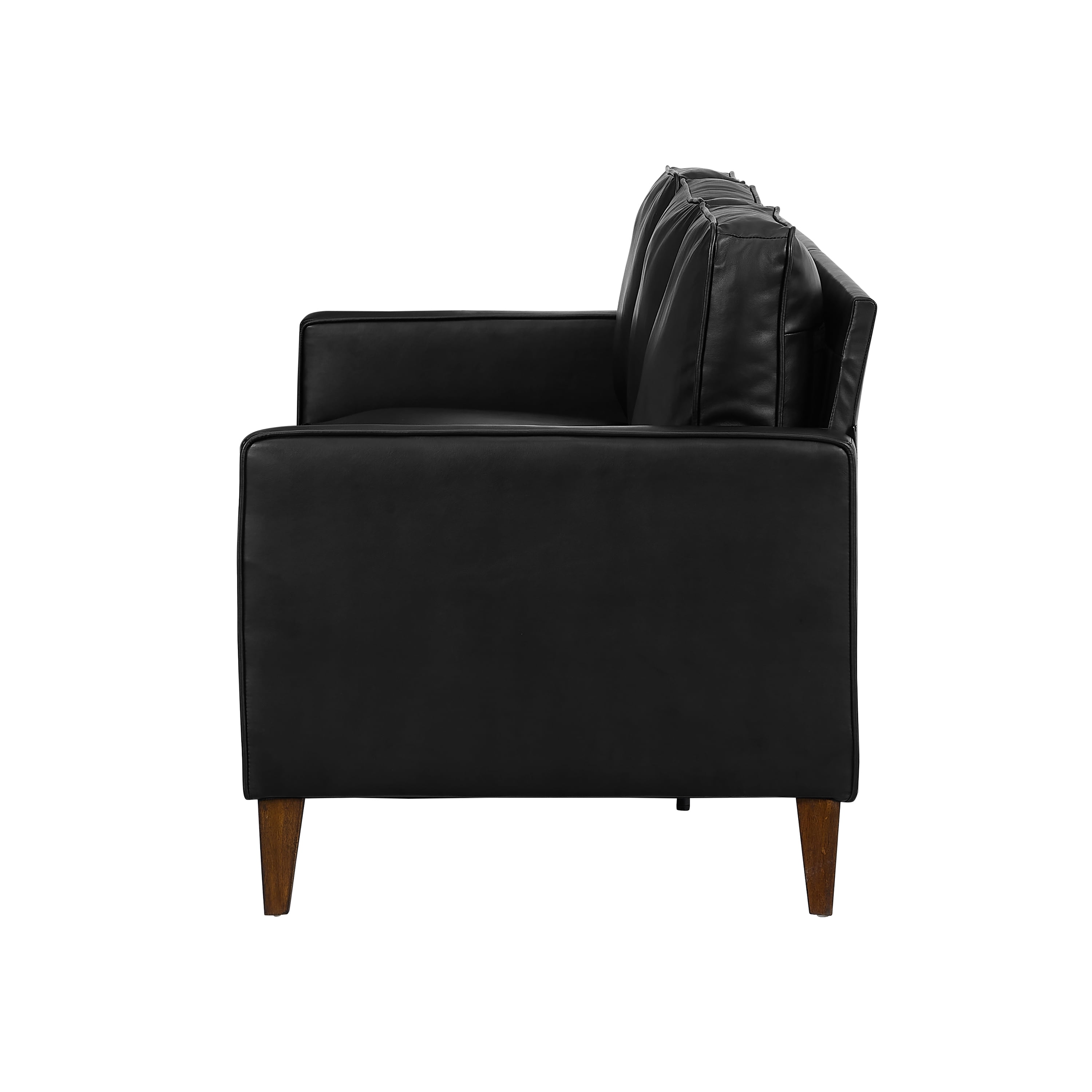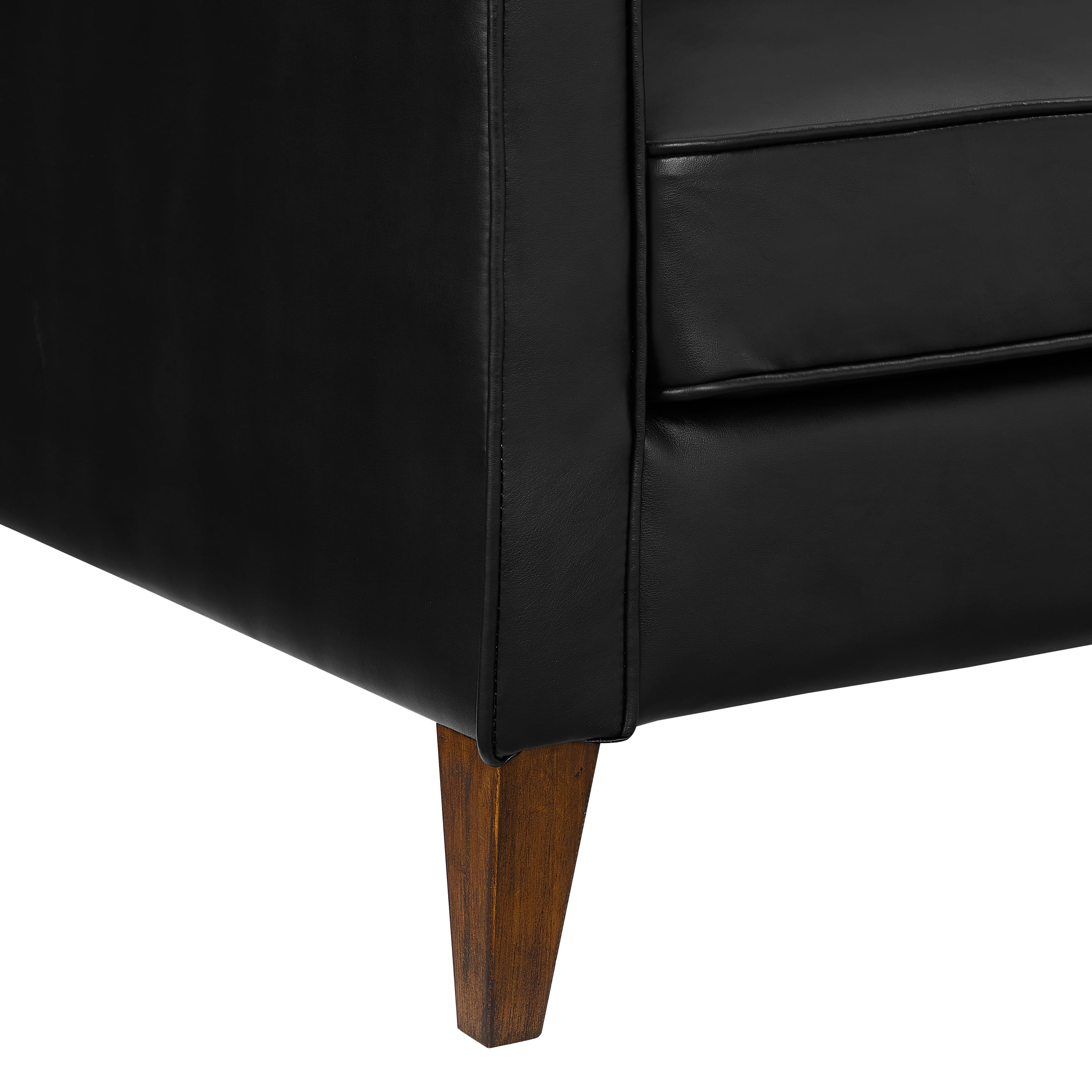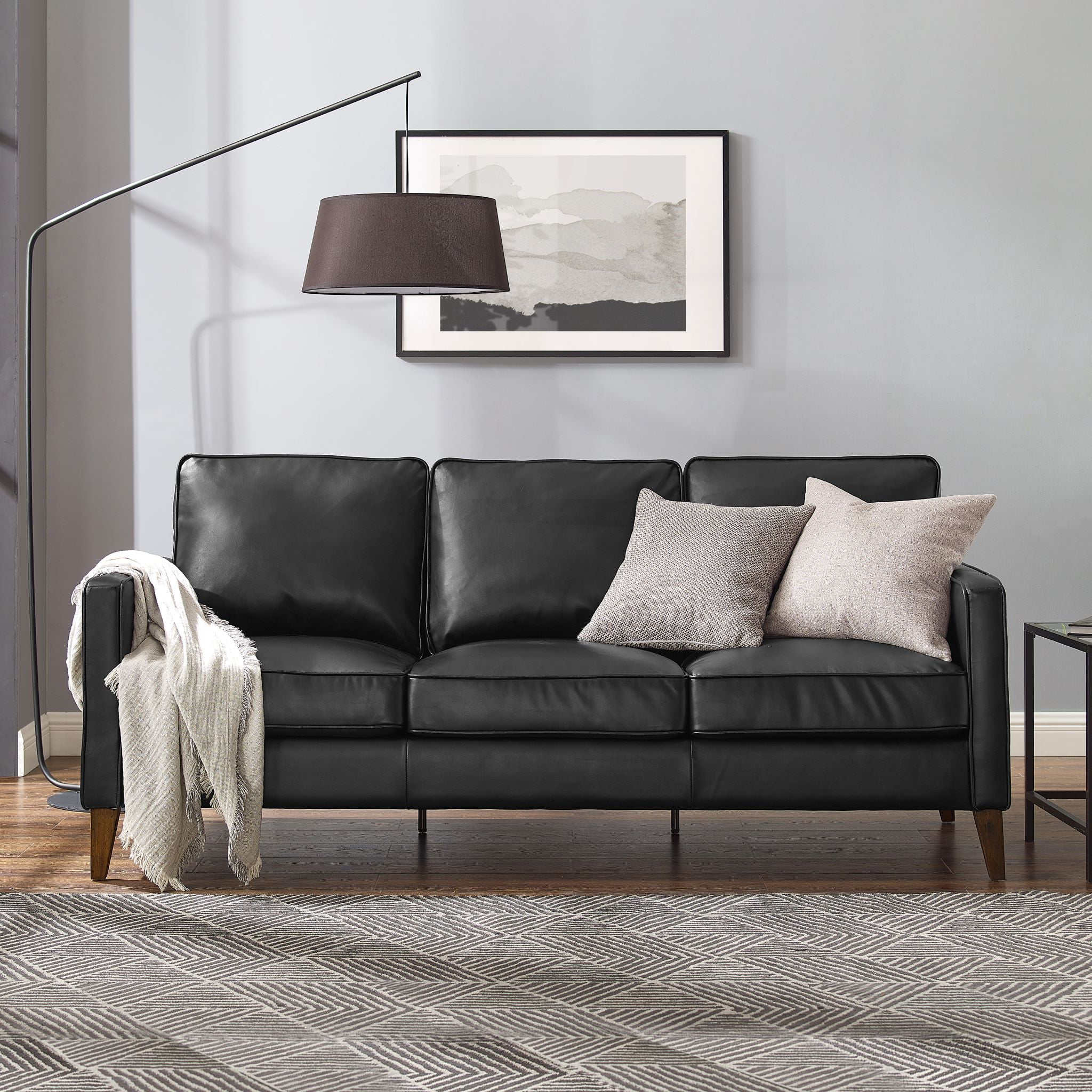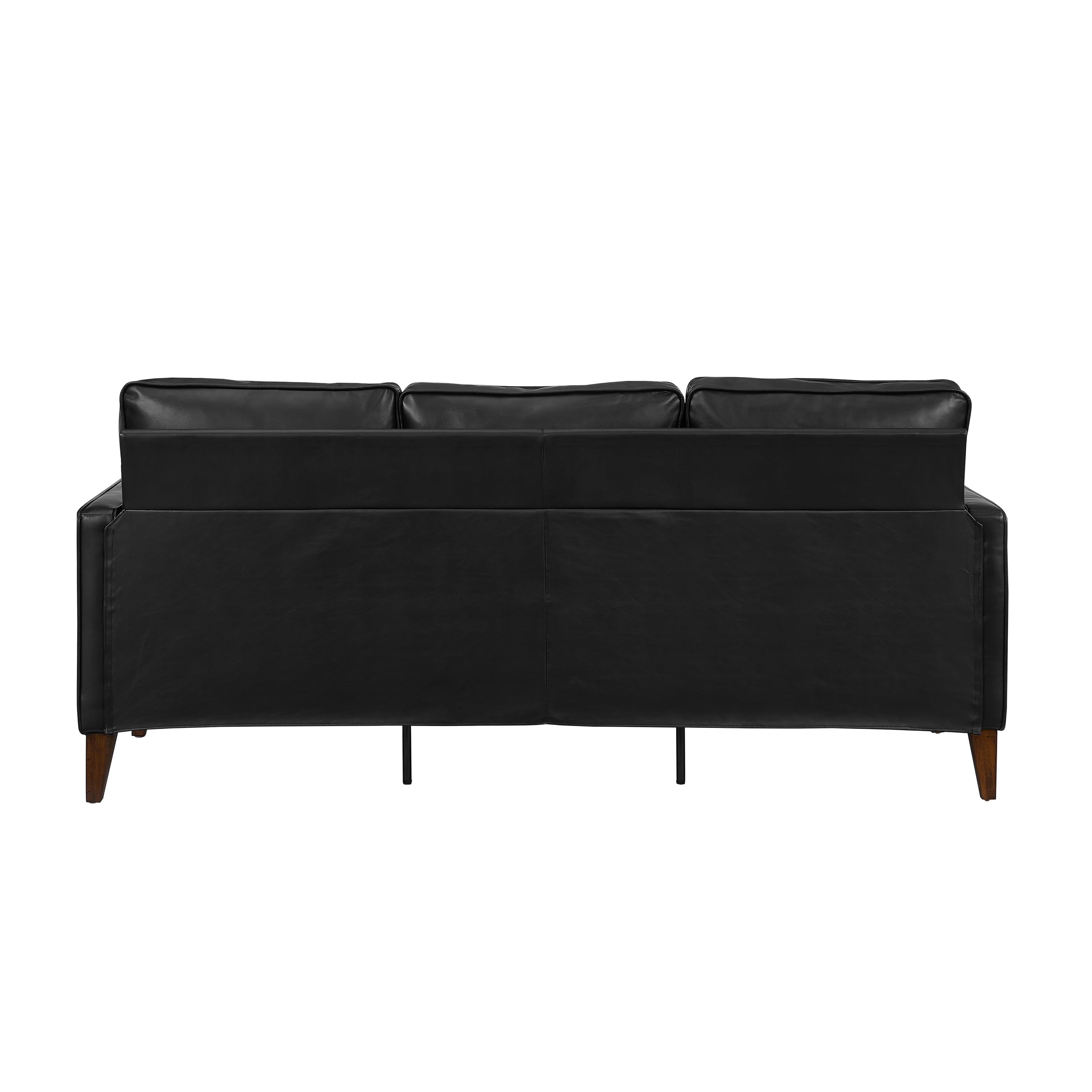 If you have a family of little ones or a family of furry one – you need a couch that can sturdily and stylishly hold up to your daily life. With this easy-to-maintain Jianna Faux Leather Sofa, clean and comfortable is the name of the game. Covered in a durably plush black faux leather with warm tapered wood legs and under frame, this adult 3-seater sofa with square arms has an adaptable mid-century modern-meets-industrial sensibility with ultra-modern construction to last for years to come. Plus, since it’s perfectly sized and easy to assemble and disassemble, moving it from room to room or house to house is a breeze. Assembly required.