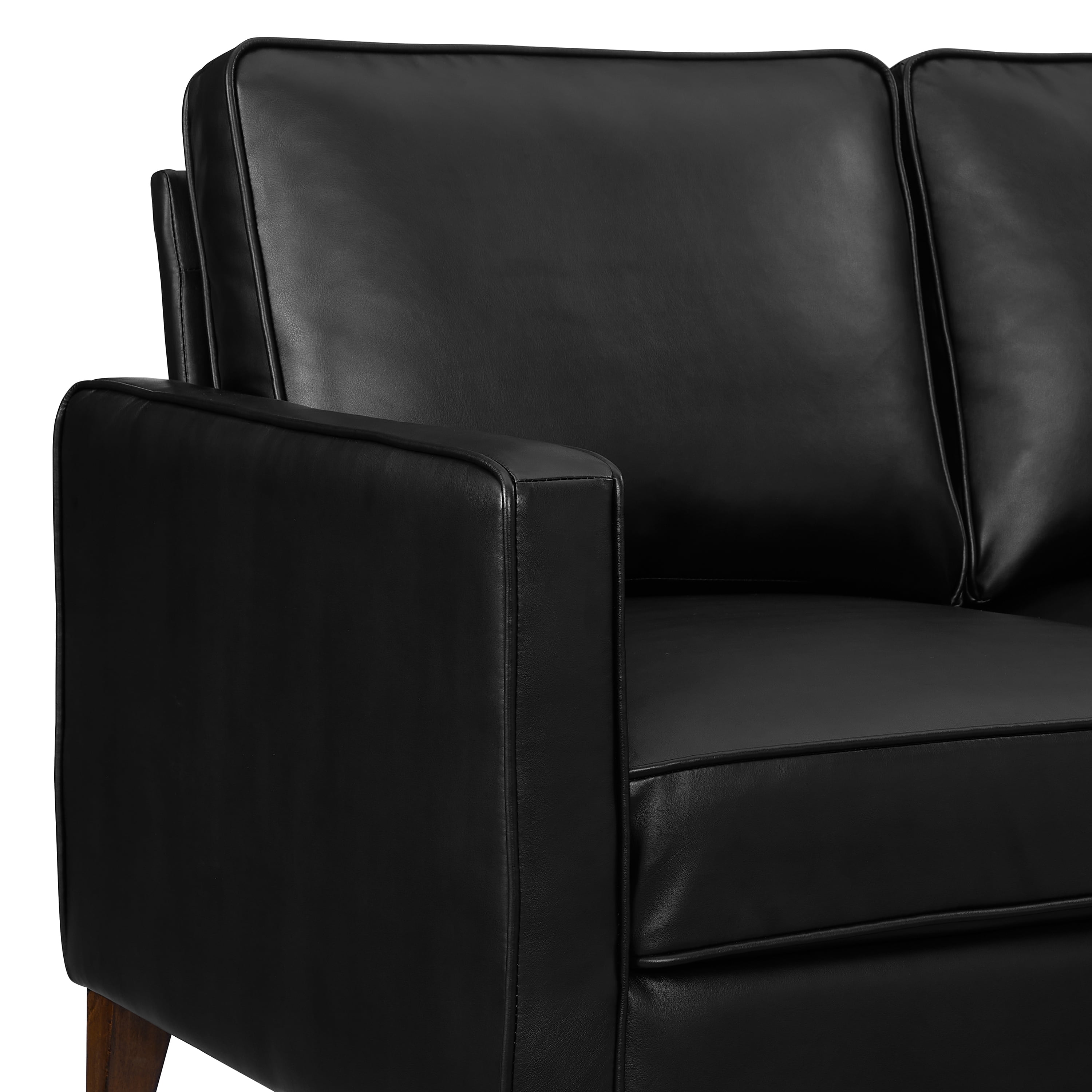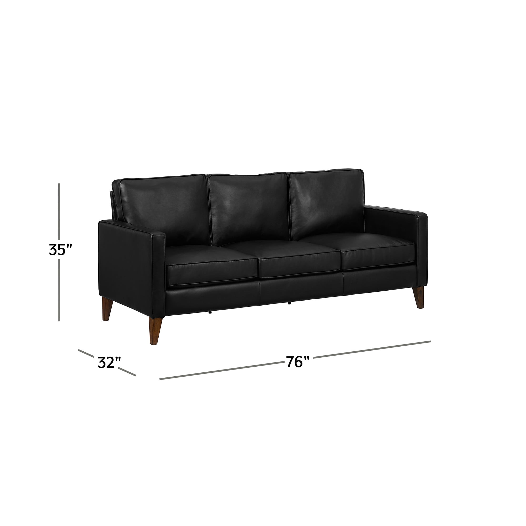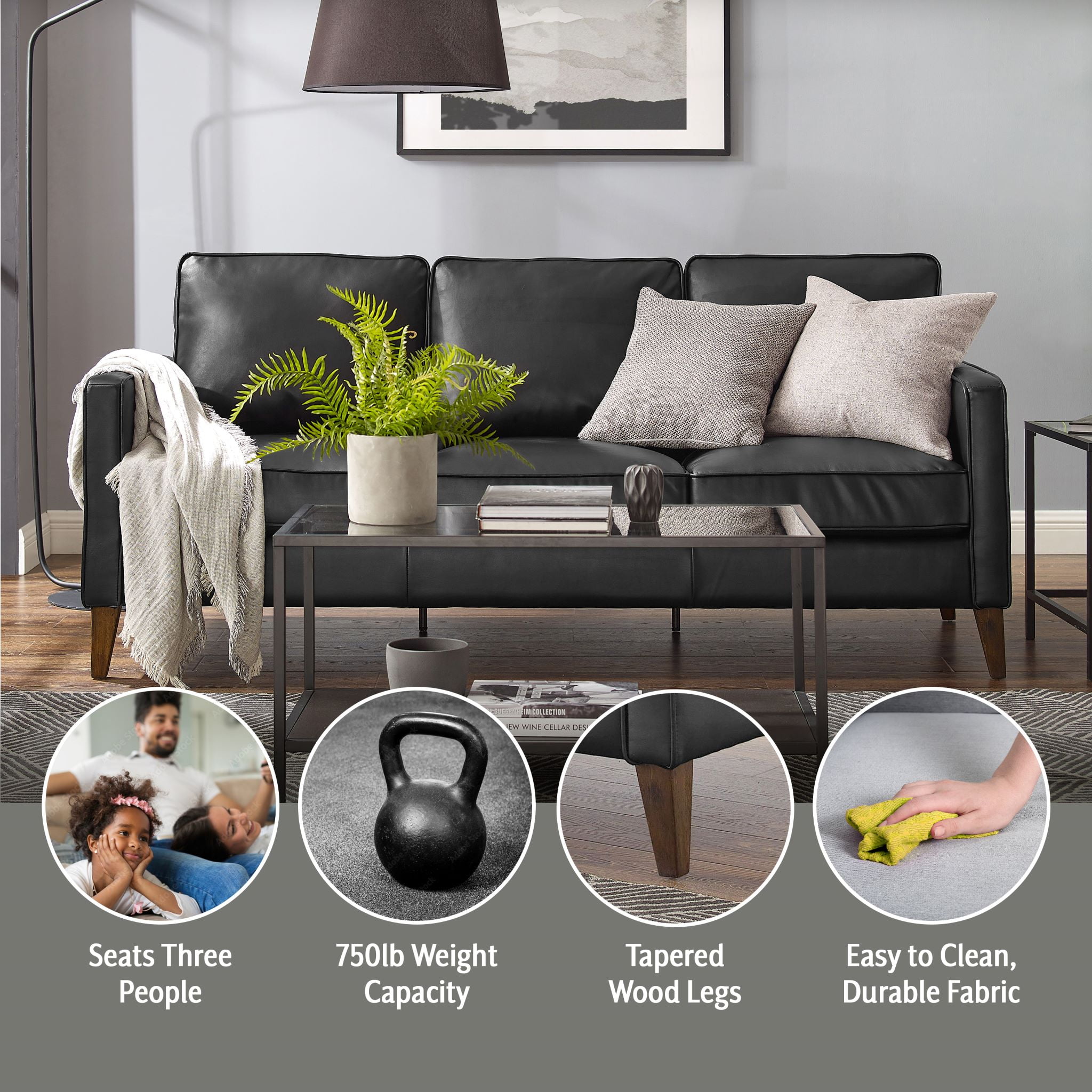 Modern industrial sofa upholstered in a black faux leather 3-seater adult sofa with square arms and 3 non-reversible cushions Solidly crafted with 4 tapered wood legs and underframe Overall Dimensions: 35 H x 76 W x 32 D, Seat Cushion Thickness: 7.5″, Arm Height: 24.5 H Easy assembly, no tools required, recommend two people for assembly Sofa ships in one box, Perfectly sized and easy to move from room to room Pocketed coil high density wrapped seat cushions High endurance and scuff resistance fabric makes this sofa perfect for an active household, Spot clean with a damp cloth or sponge Recommended Maximum Weight Capacity: 750 lbs For residential usage only Patent Pending