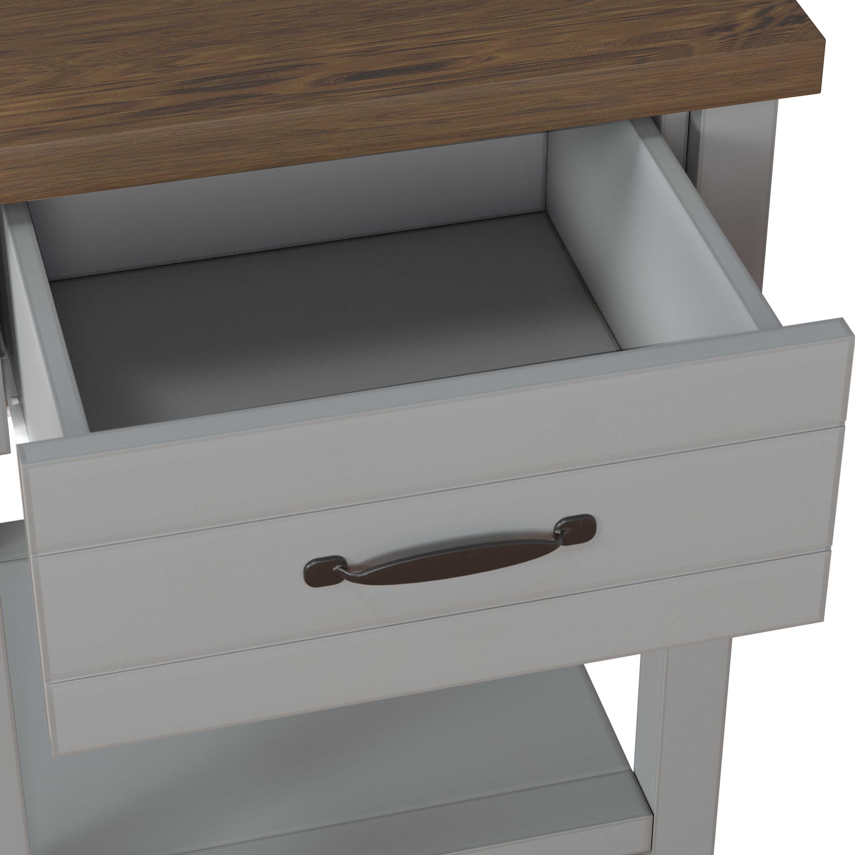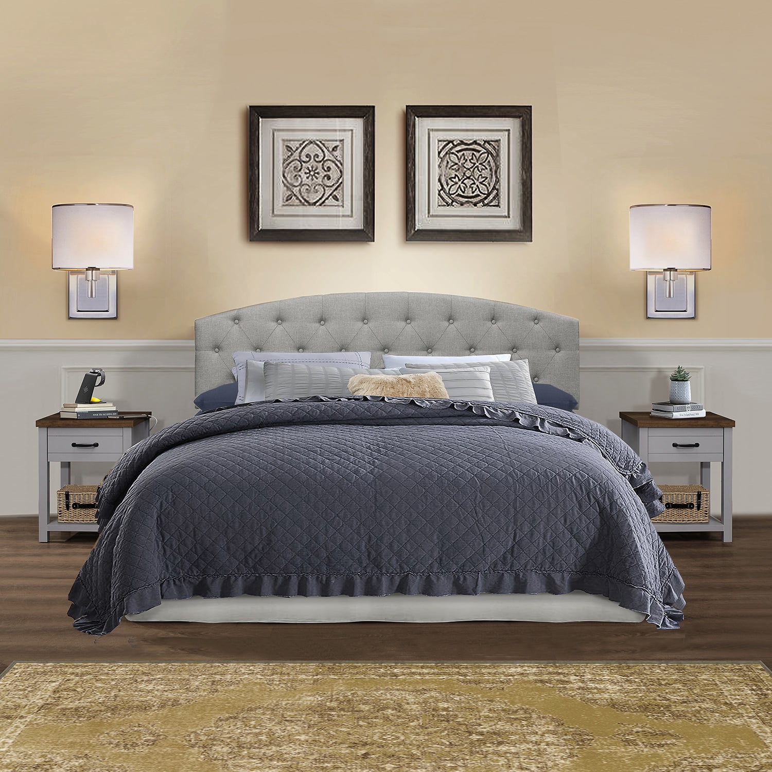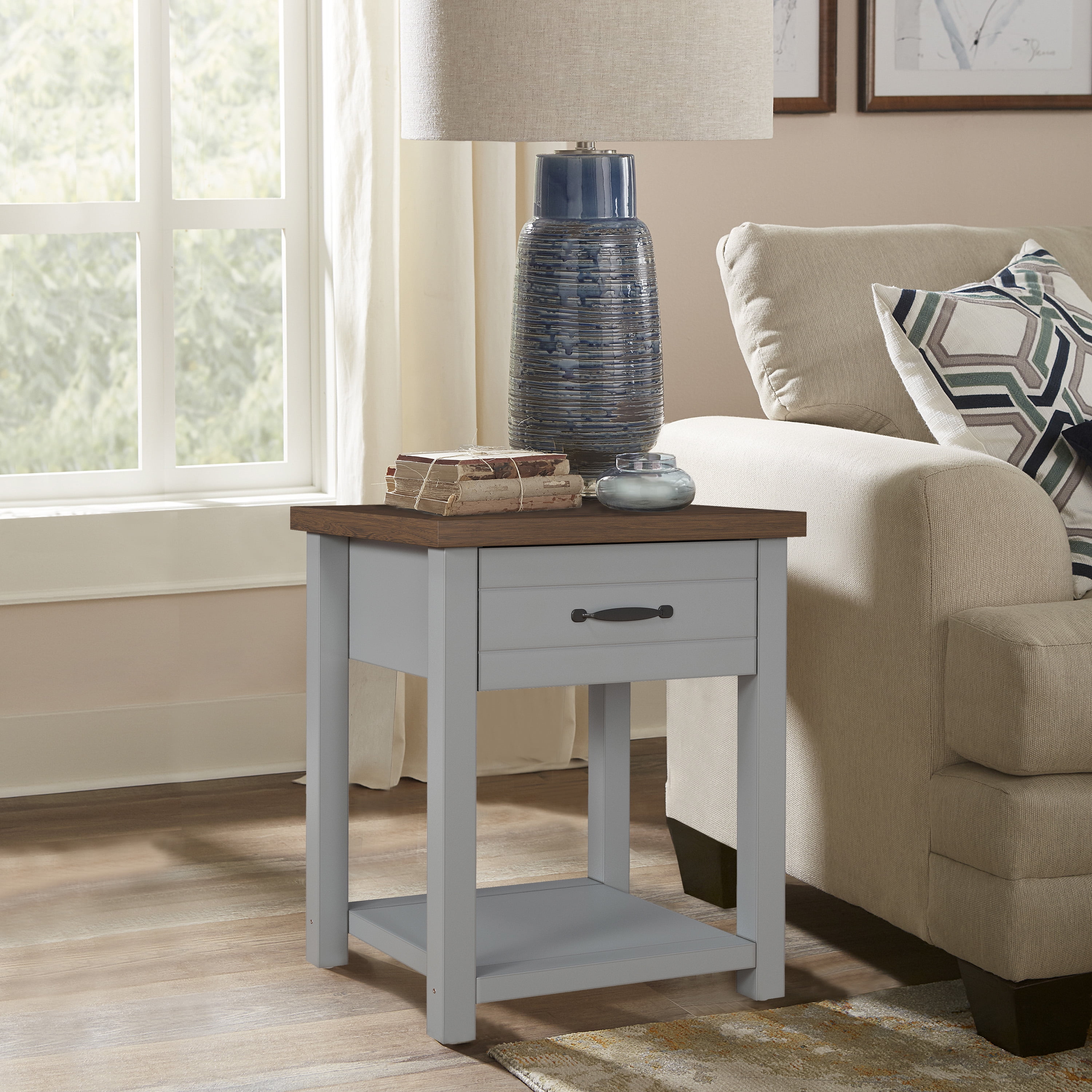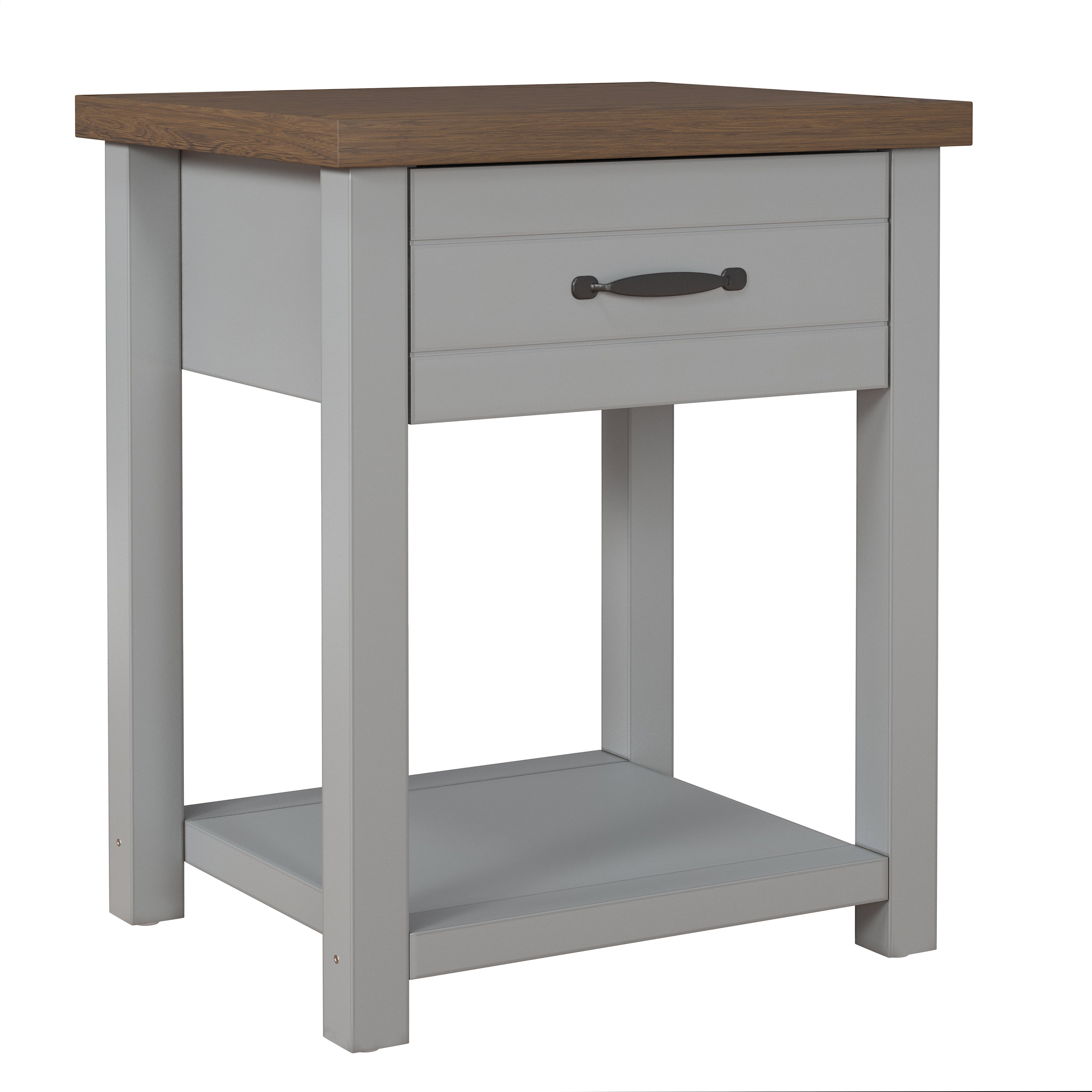 Keep all your bedside favorites within easy reach with your Lancaster Nightstands by Hillsdale Living Essentials. Sold as a set of (2) two, each adult nightstand comes with a drawer for concealed storage of small items like glasses and electronics, as well as an open shelf on the bottom for books and larger items. The Lancaster nightstands will fit into any home décor with a farmhouse inspired breadboard design, a cool gray transitional finish with a rustic knotty oak finished top, and elegant black metal drawer handle. Intricate details like the framed drawer front and a linen paper lined drawer top off the elegant design. Sold as a set of (2) two, assembly required.