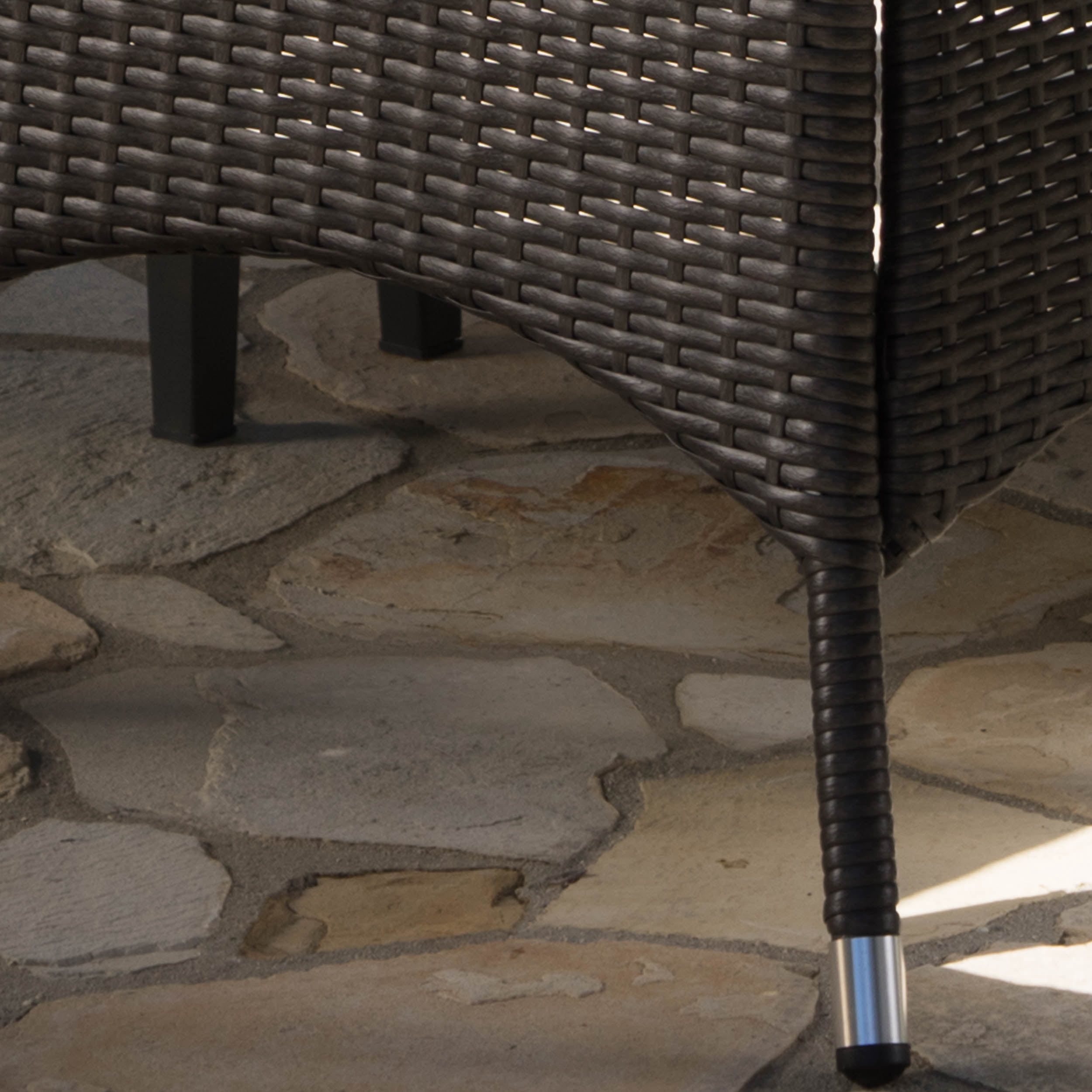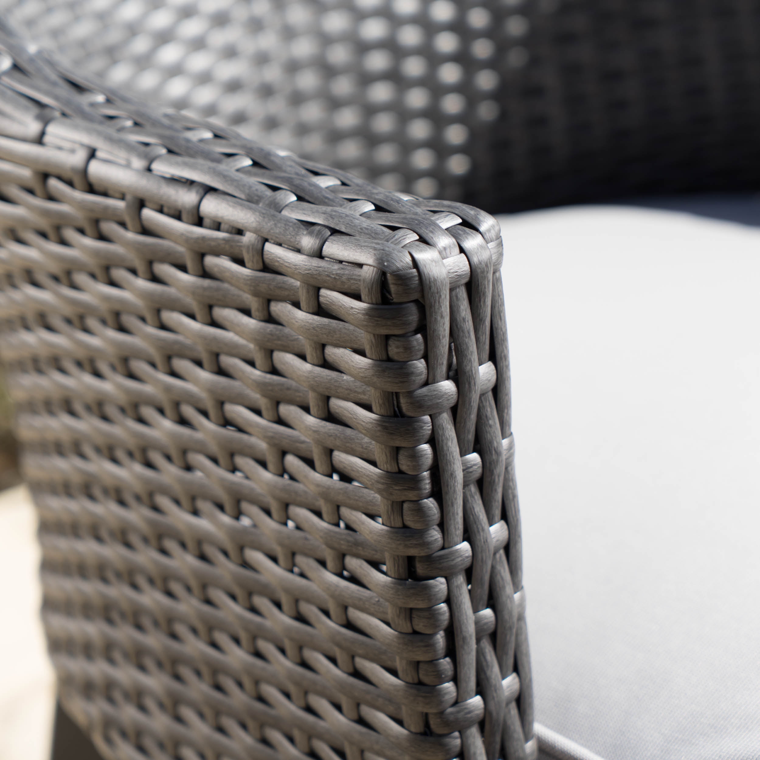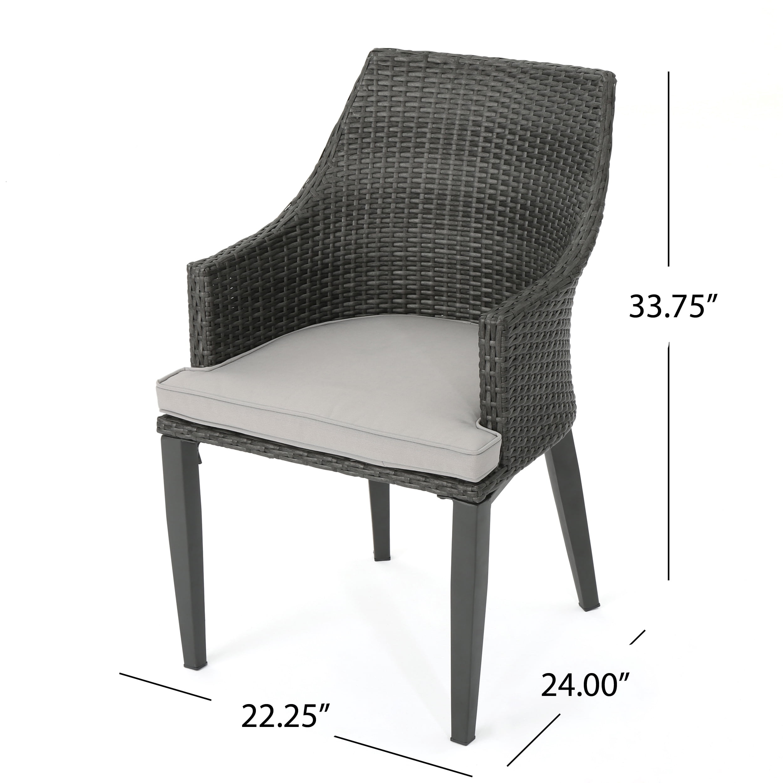 Includes: One (1) Table and Two (2) ChairsMaterial: Polyethylene WickerCushion Material: Water Resistant FabricComposition: 100% PolyesterFrame Material: IronWicker Finish: GreyCushion Color: Light GreyAssembly RequiredHand Crafted DetailsTable Dimensions: 25.75 inches deep x 25.75 inches wide x 28.35 inches highChair Dimensions: 23.23 inches deep x 22.05 inches wide x 34.25 inches high