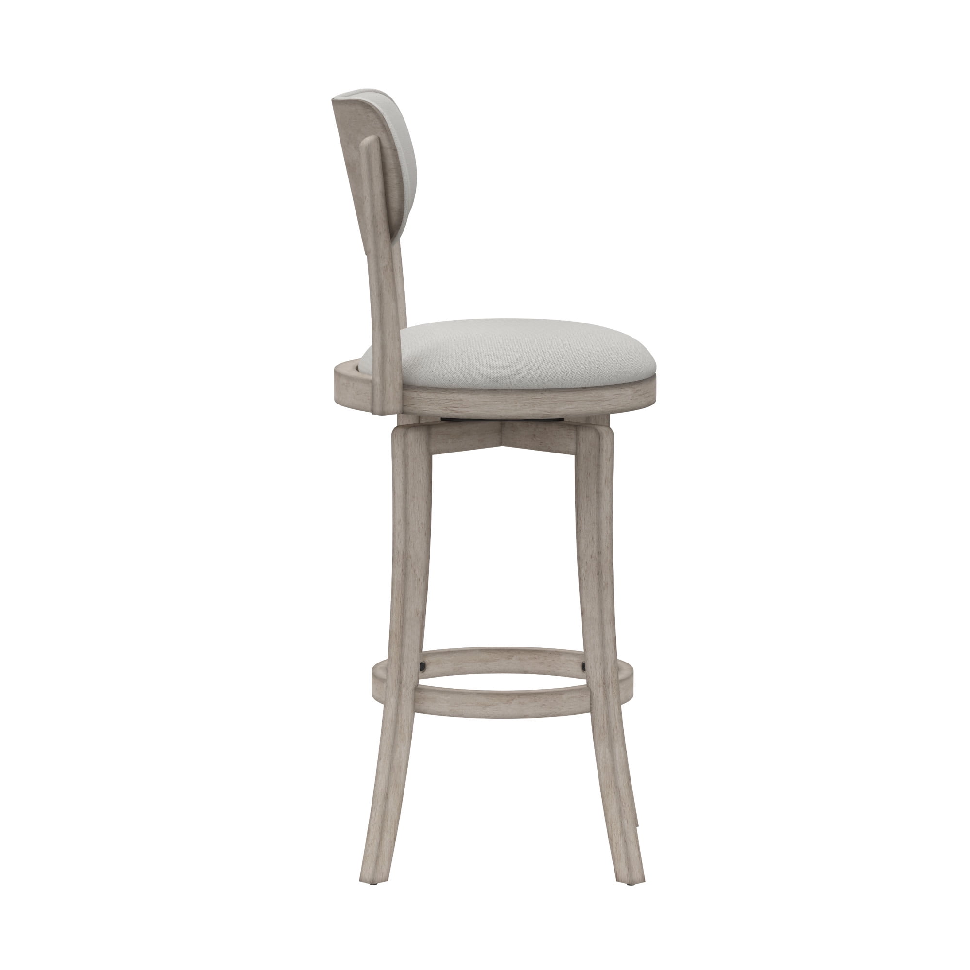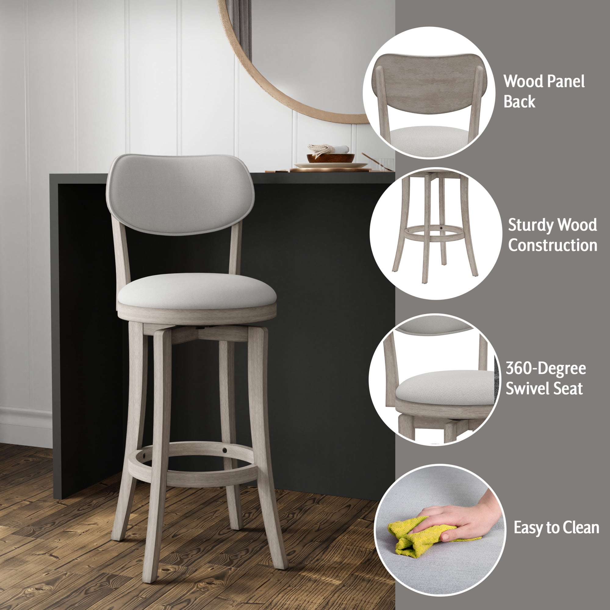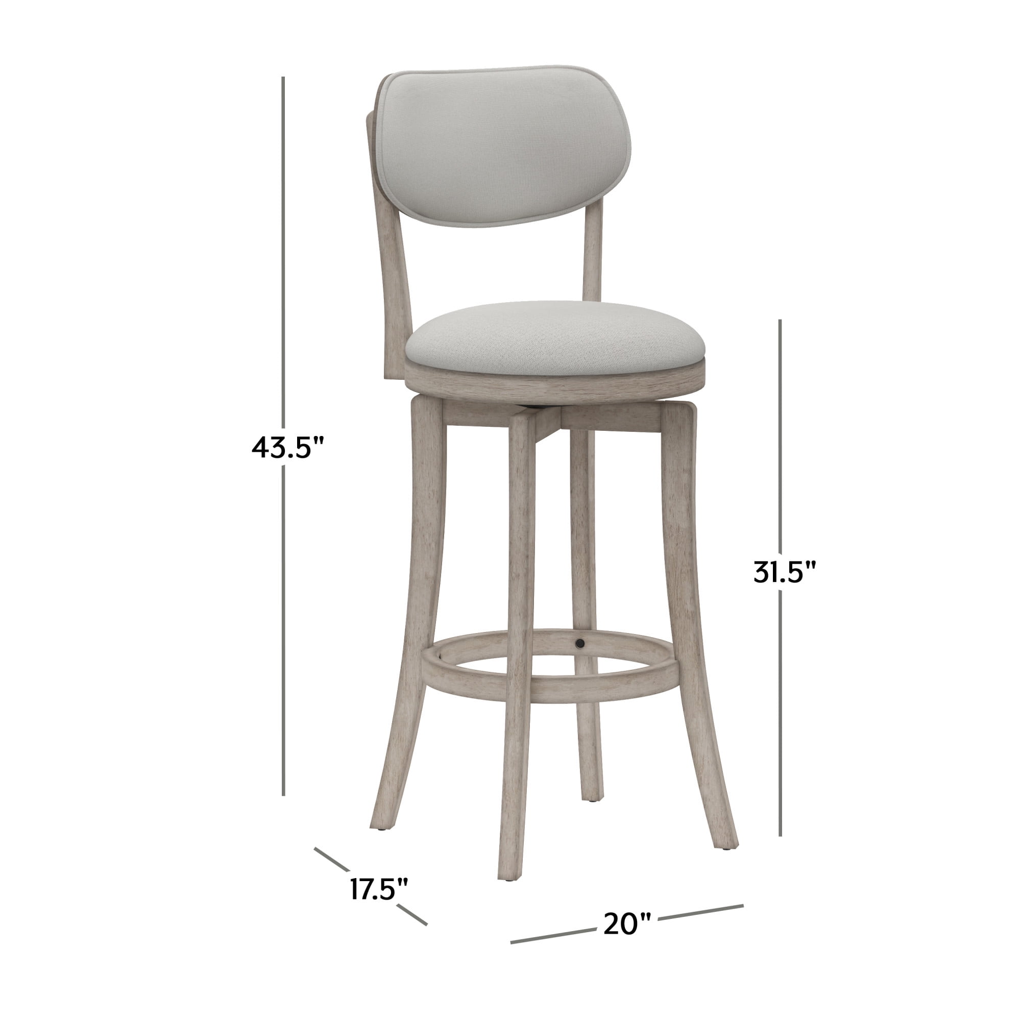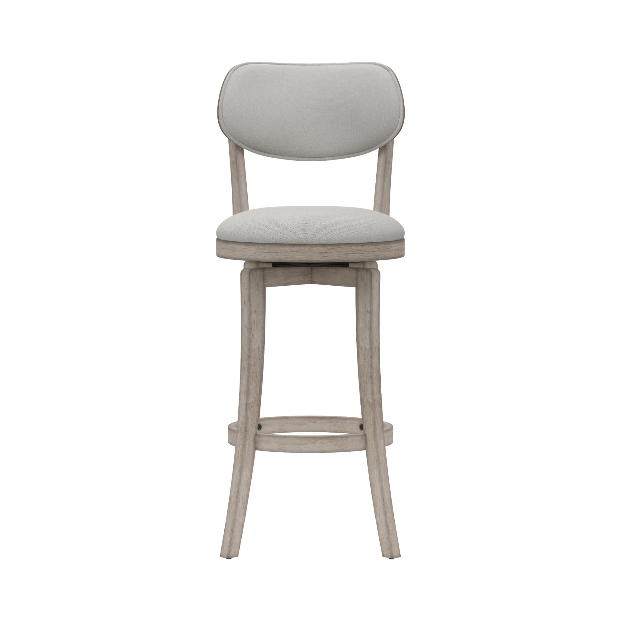 Casual design wood swivel bar height stool with padded upholstered back and seat The simple wood frame features an aged gray finish The round 360 degree swivel seat is upholstered in a fog fabric Overall Dimensions: 43.5H x 20W x 17.5D; Seat Height: 31.5H Assembly required Ships one stool in one box Works best with counters or bars that are 40-44 inches in height Spot or wipe clean Recommended weight limit: 250lbs For residential use only