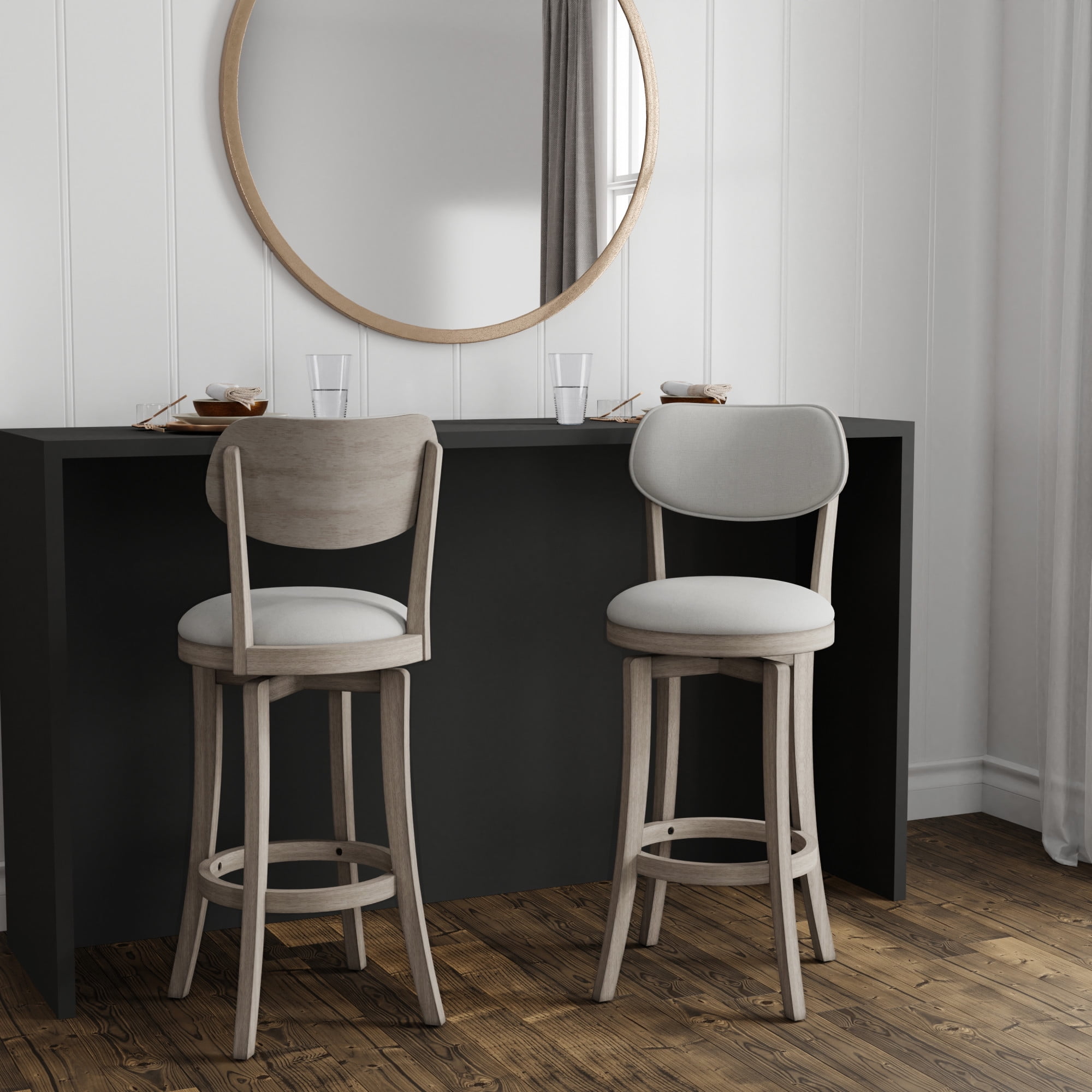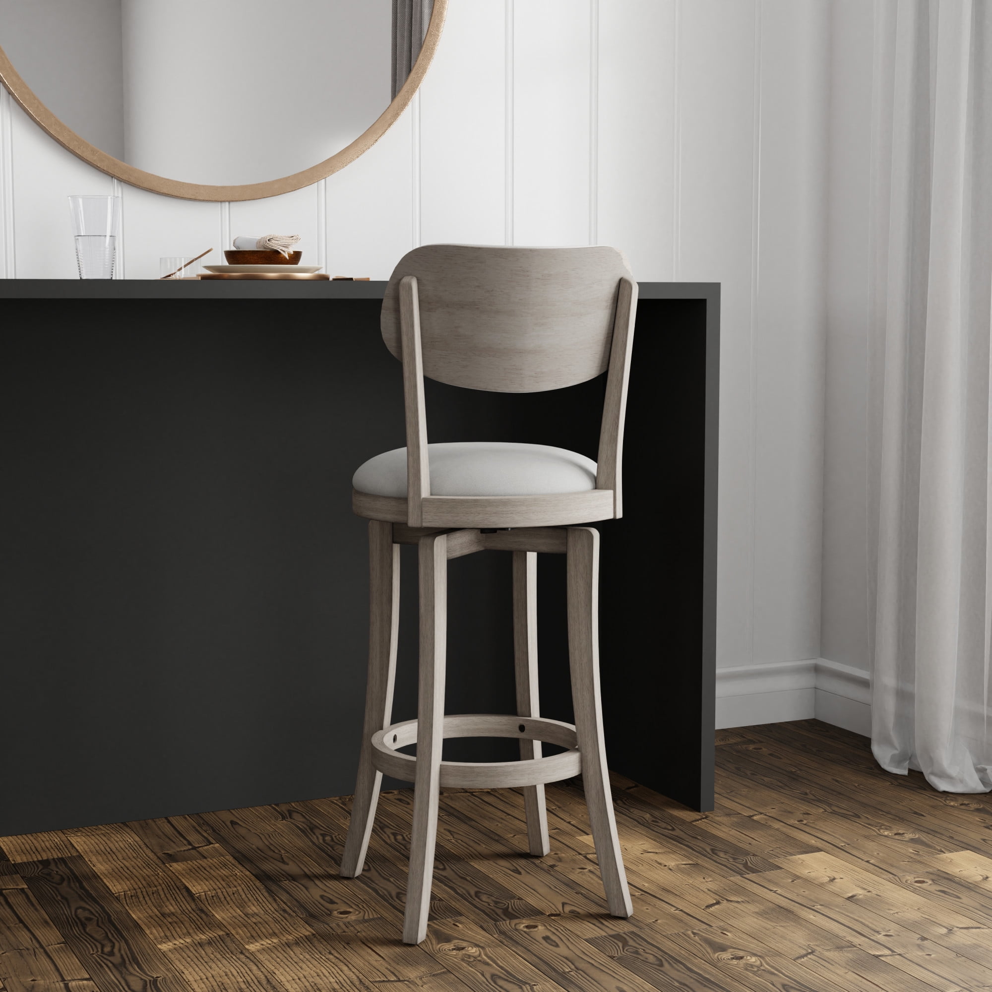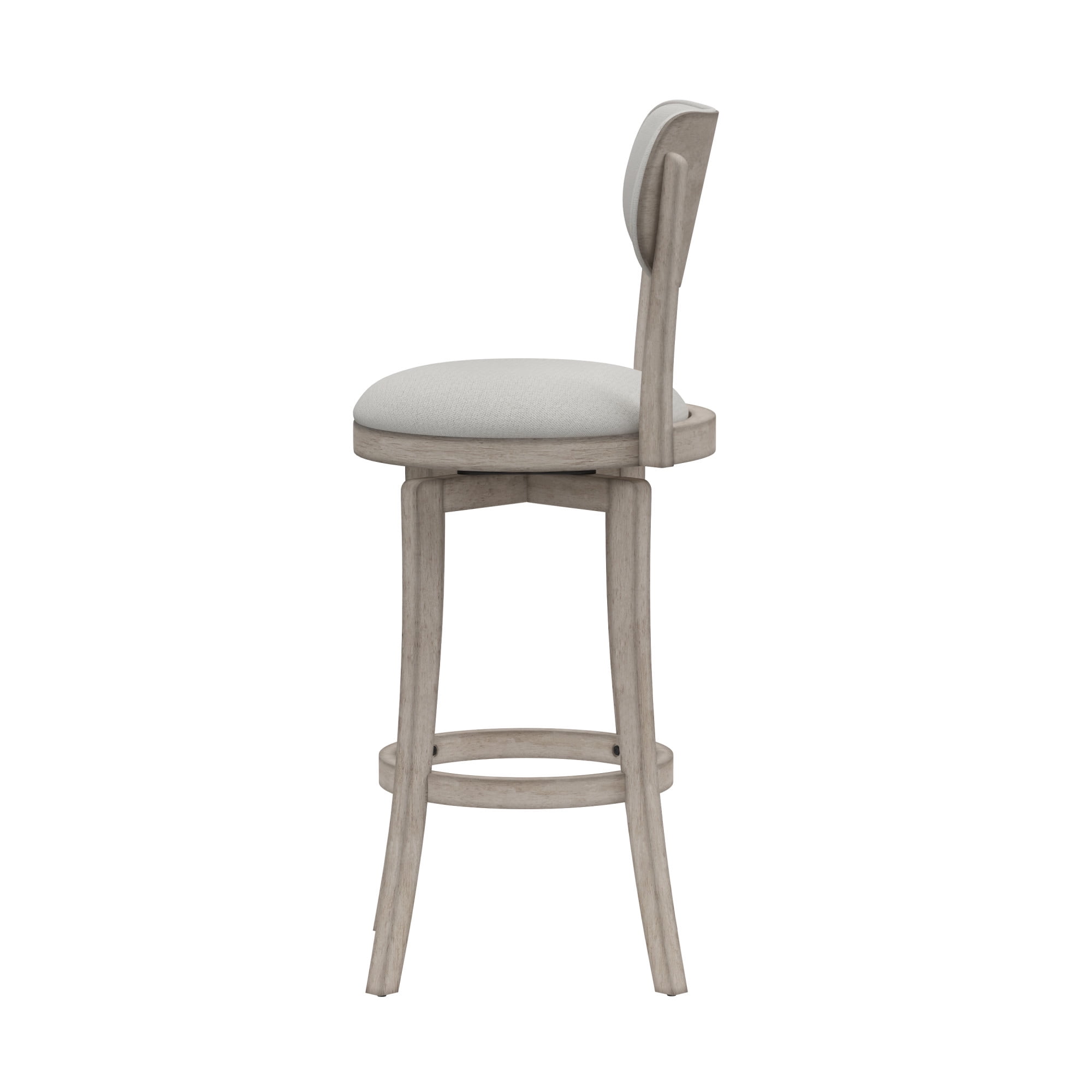 Casual design wood swivel bar height stool with padded upholstered back and seat The simple wood frame features an aged gray finish The round 360 degree swivel seat is upholstered in a fog fabric Overall Dimensions: 43.5H x 20W x 17.5D; Seat Height: 31.5H Assembly required Ships one stool in one box Works best with counters or bars that are 40-44 inches in height Spot or wipe clean Recommended weight limit: 250lbs For residential use only