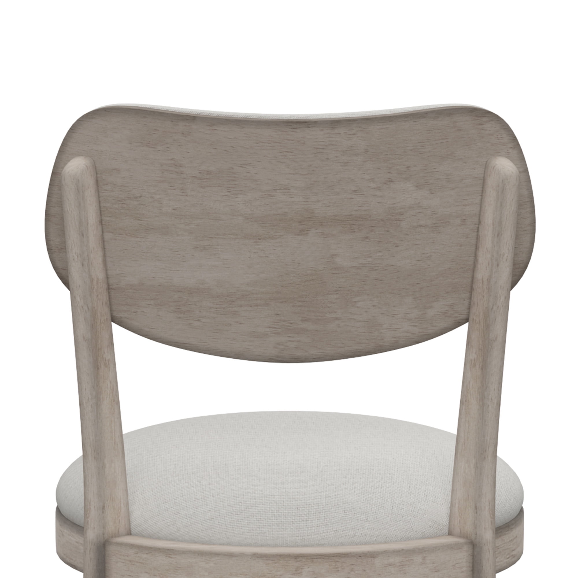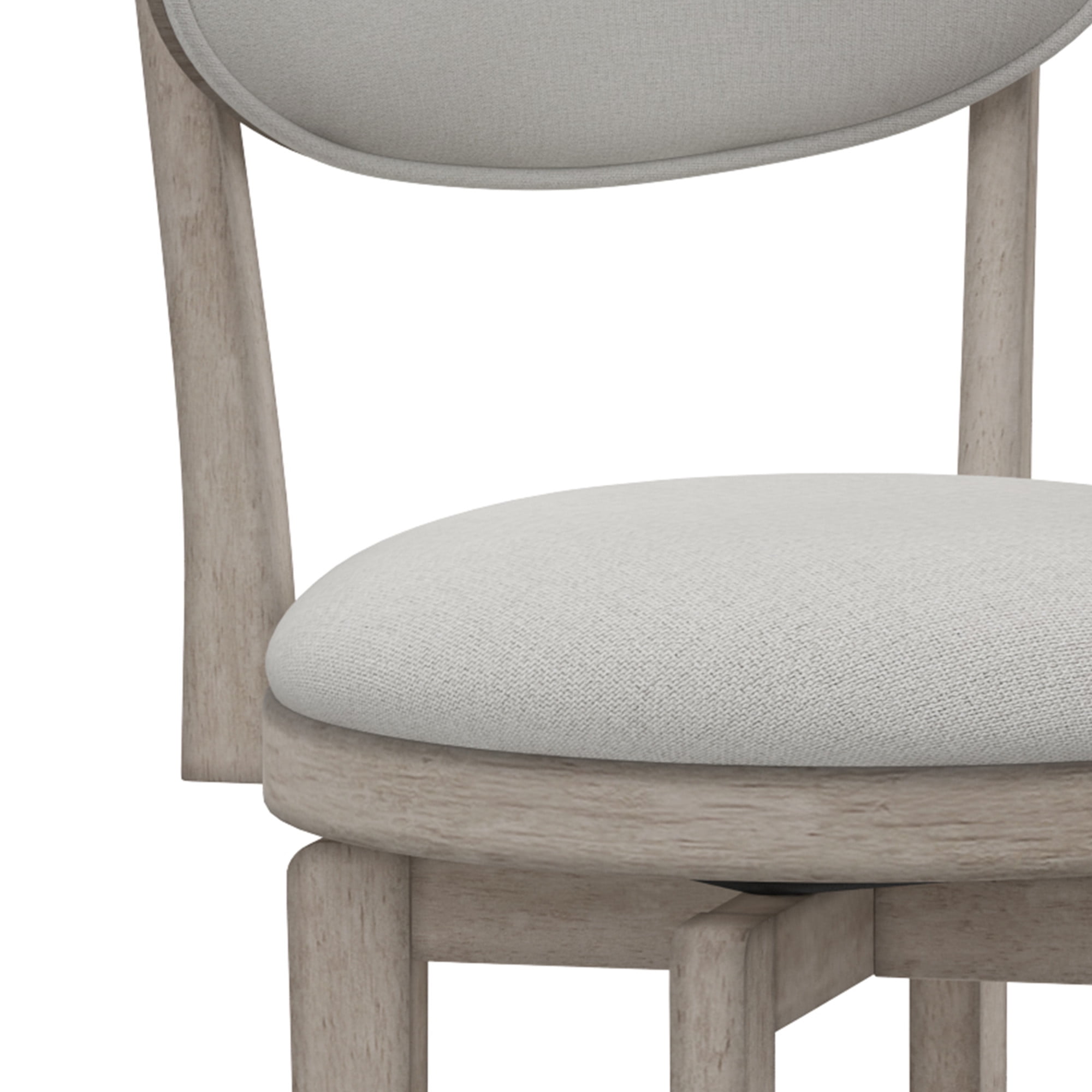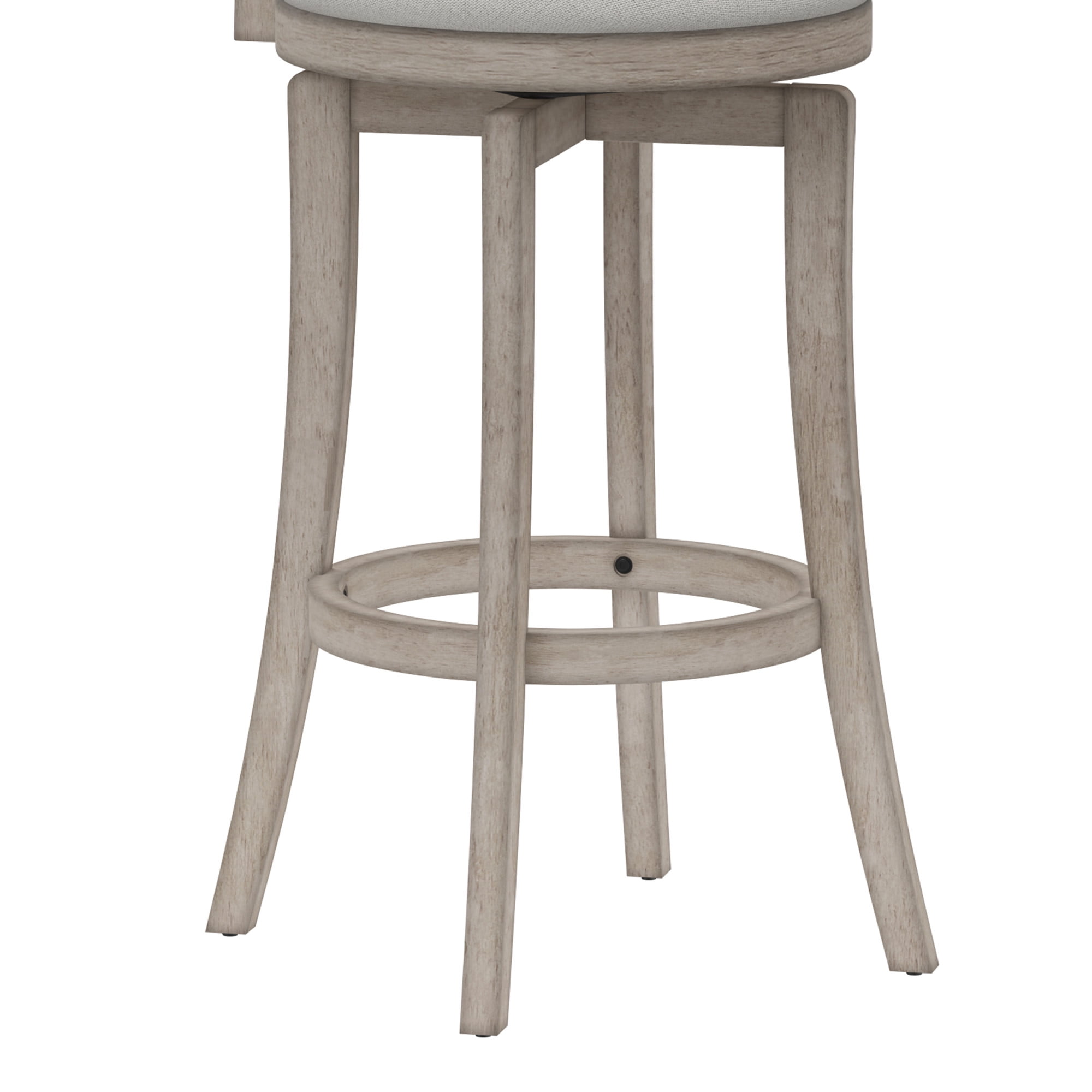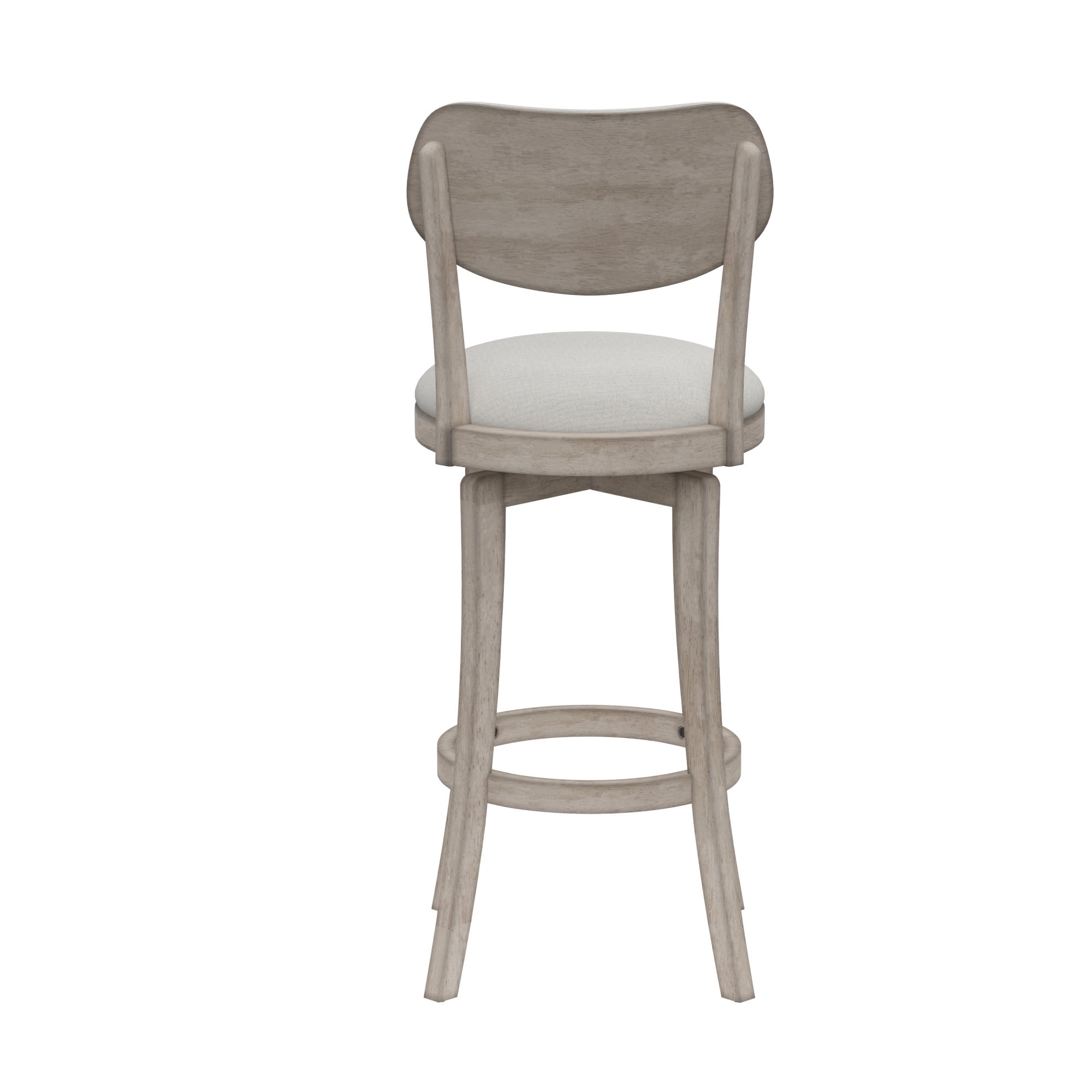 Casual design wood swivel bar height stool with padded upholstered back and seat The simple wood frame features an aged gray finish The round 360 degree swivel seat is upholstered in a fog fabric Overall Dimensions: 43.5H x 20W x 17.5D; Seat Height: 31.5H Assembly required Ships one stool in one box Works best with counters or bars that are 40-44 inches in height Spot or wipe clean Recommended weight limit: 250lbs For residential use only
