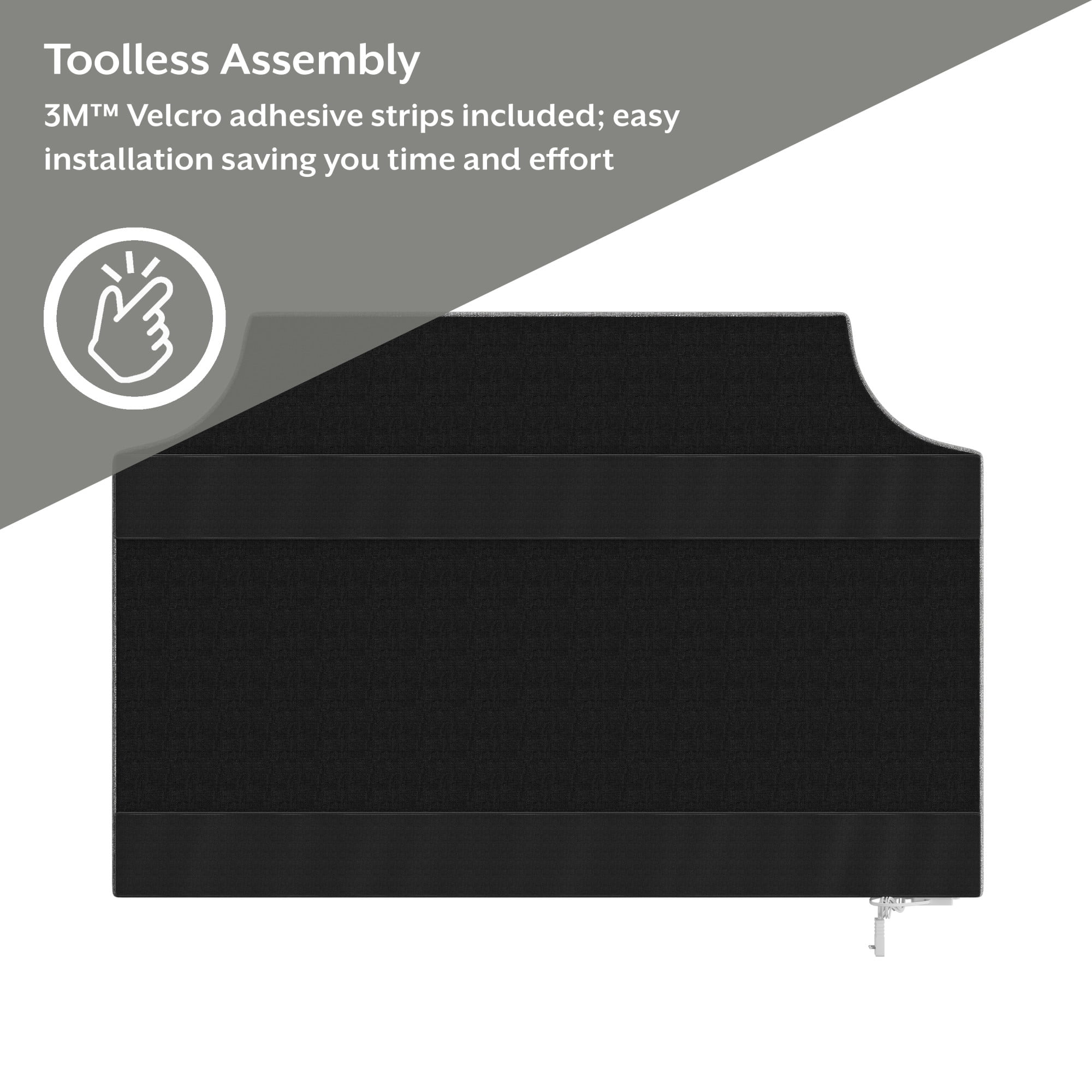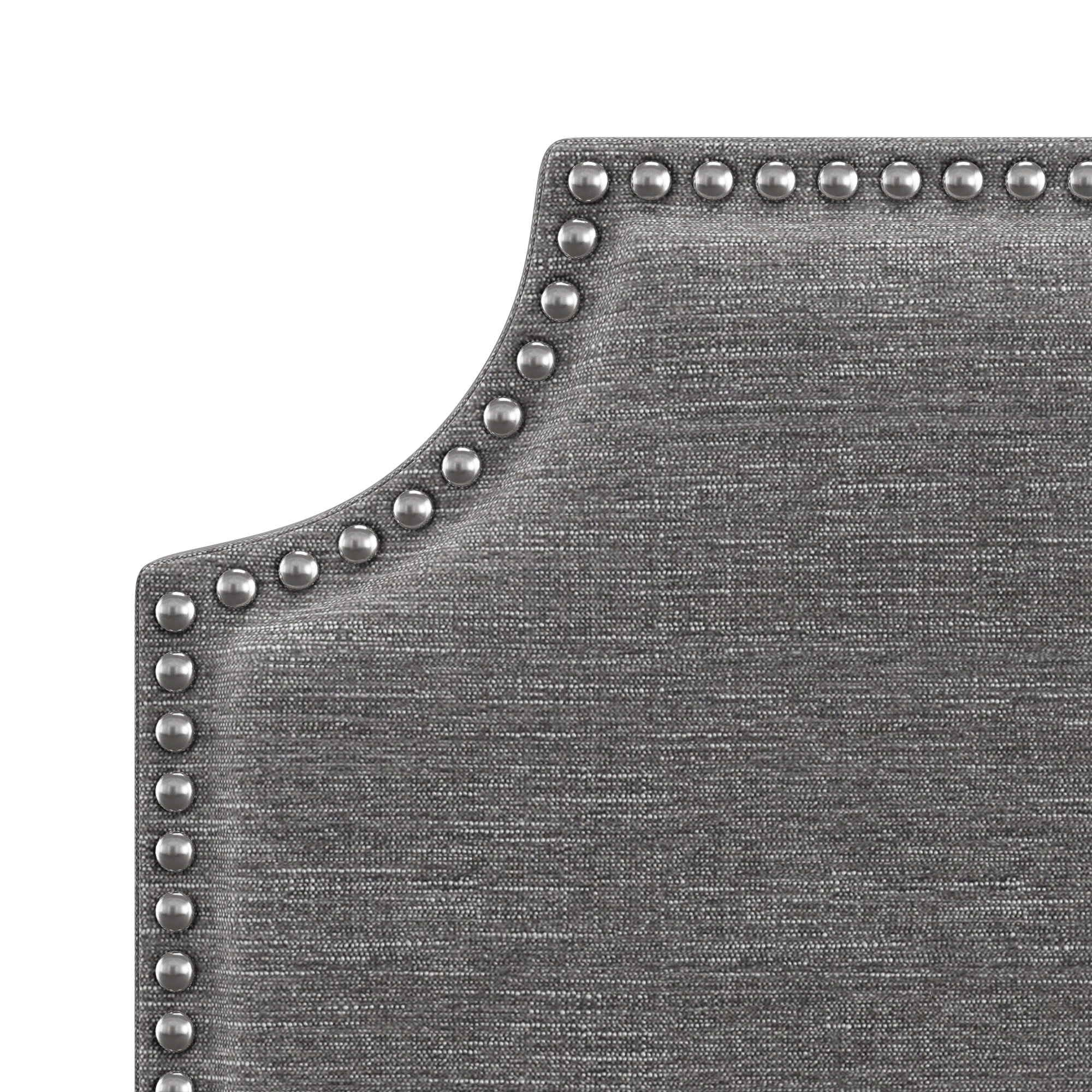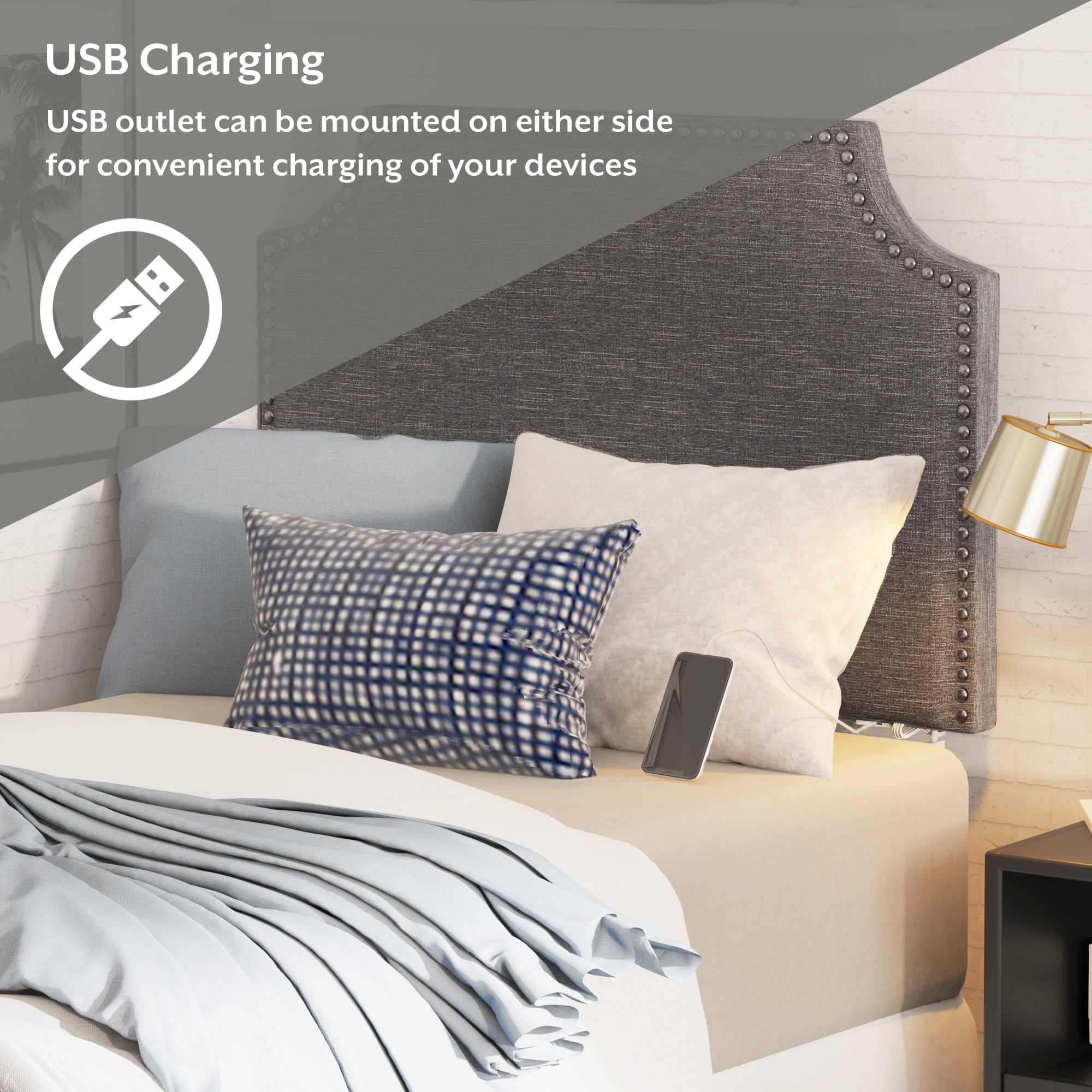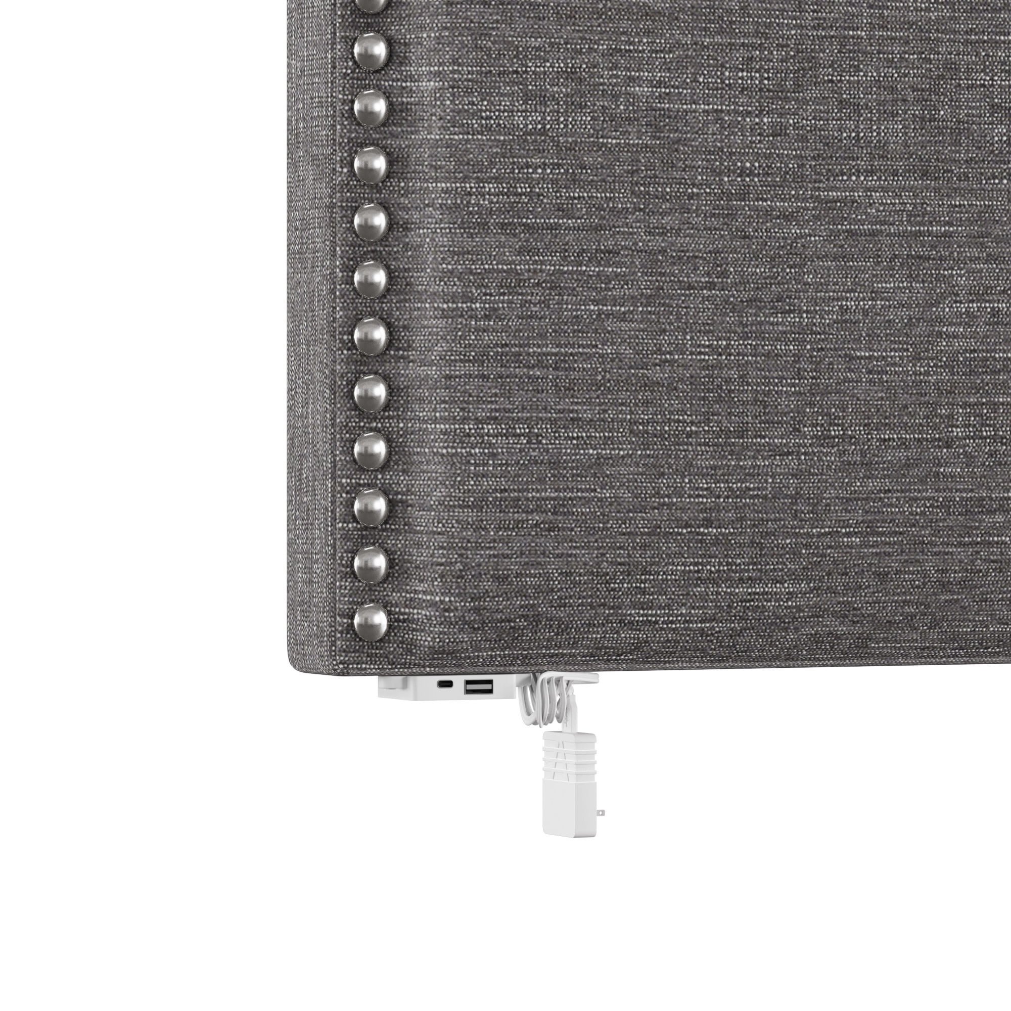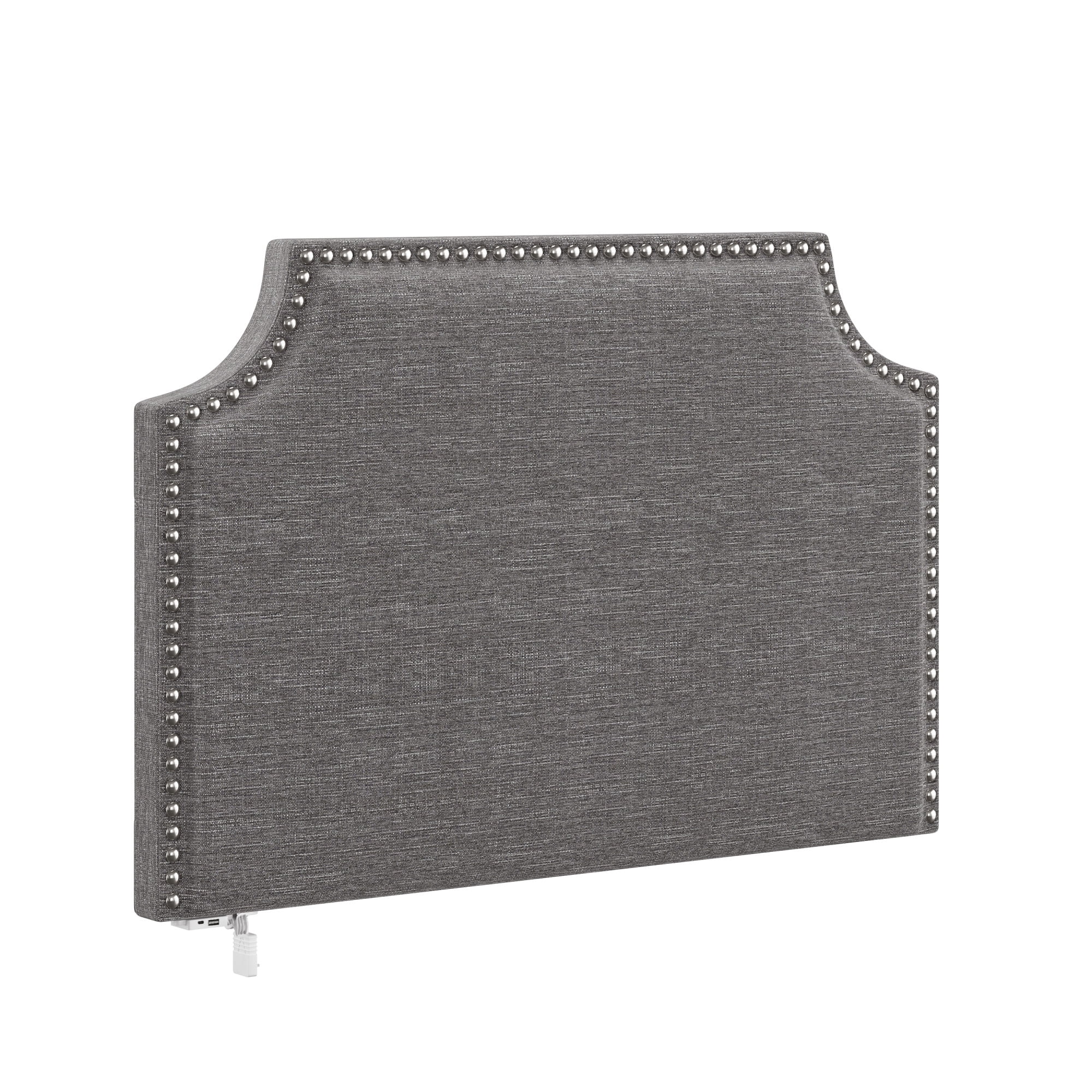 Casual transitional wall-mounted twin headboard boasts silver nailhead trim Elegant cut corners define the classic silhouette of this piece Wooden construction; Upholstery is 100% polyester in a chic gray Overall Dimensions: 26.75H x 40.25W x 2.75D Assembly required Item will ship in one box USB port can be attached to either side of the headboard Spot or wipe clean Easily mounts to the wall with included adhesive strips For residential use only