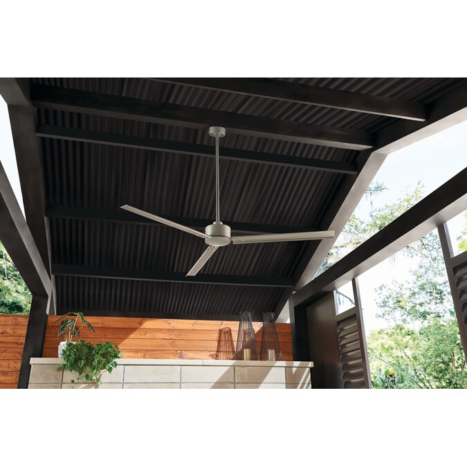 Simple, but modern industrial style, Hinkley’s 56″ Indy Indoor/Outdoor Ceiling fan features a trio of sleek, aluminum blades and is wet-rated for indoor and outdoor living spaces. In four classic finishes (Brushed Nickel, Matte Black, Metallic Matte Bronze, or Matte White), this 4-Speed AC fan comes with a wall control unit and manual reversing for summer and winter modes. Includes a 6-in down rod and can be installed on even or sloped ceilings.