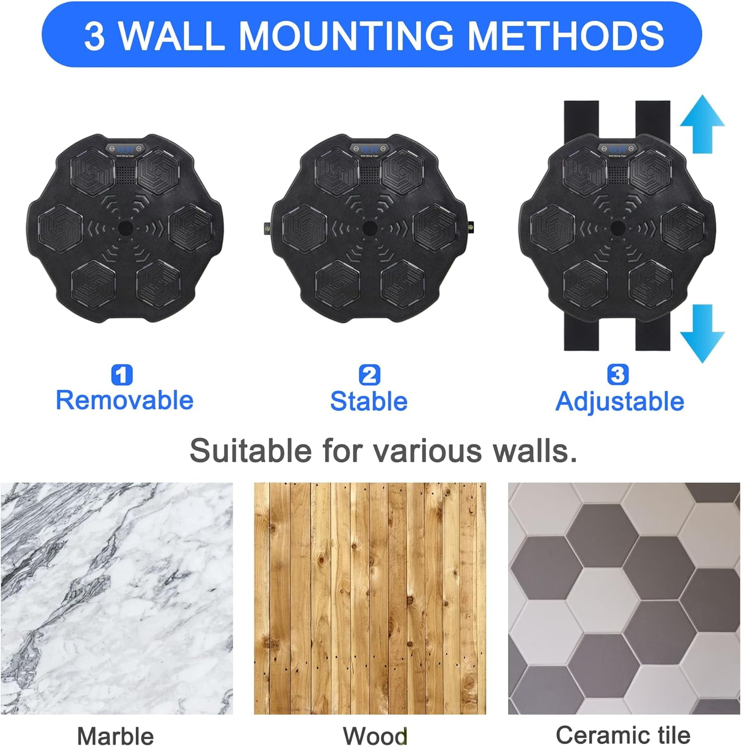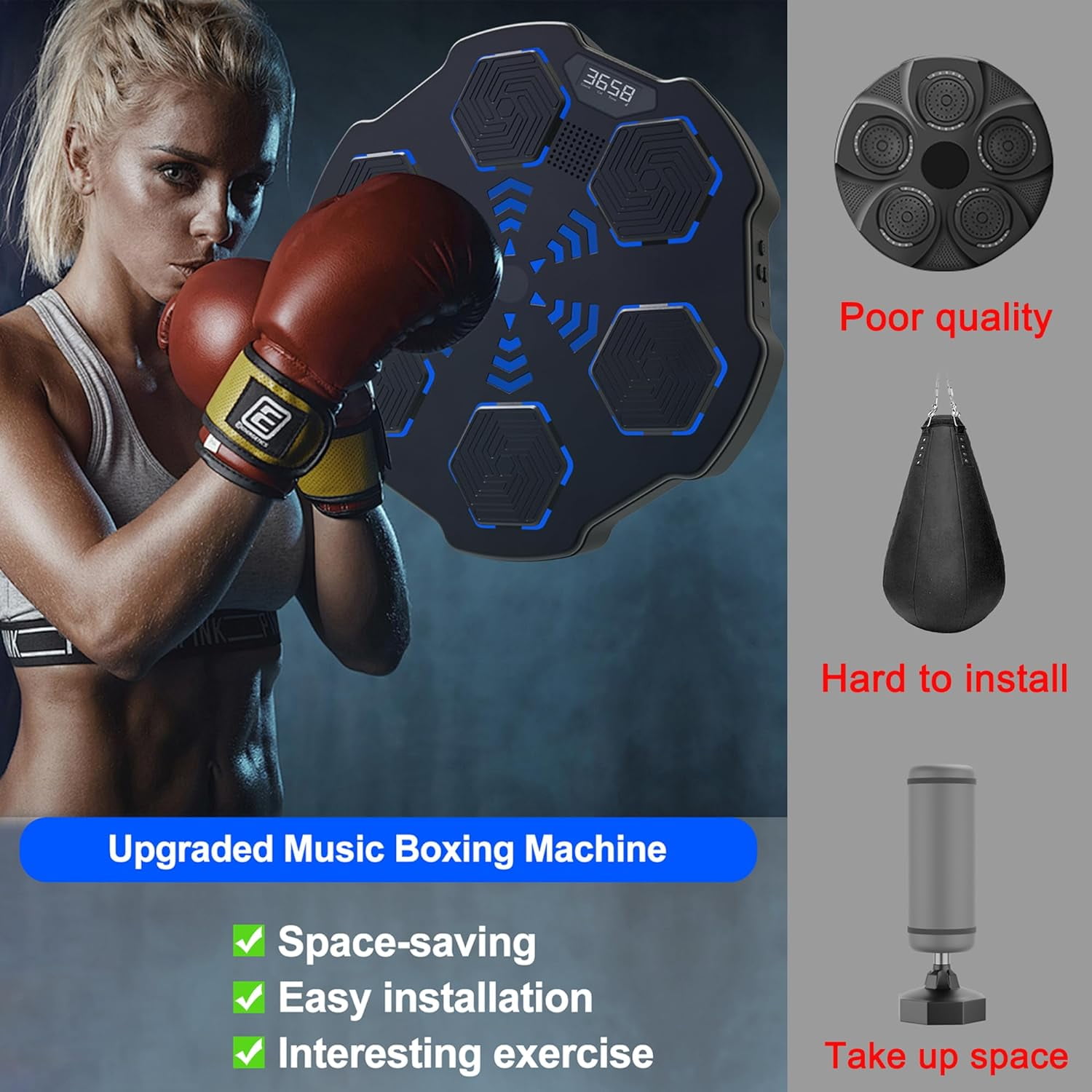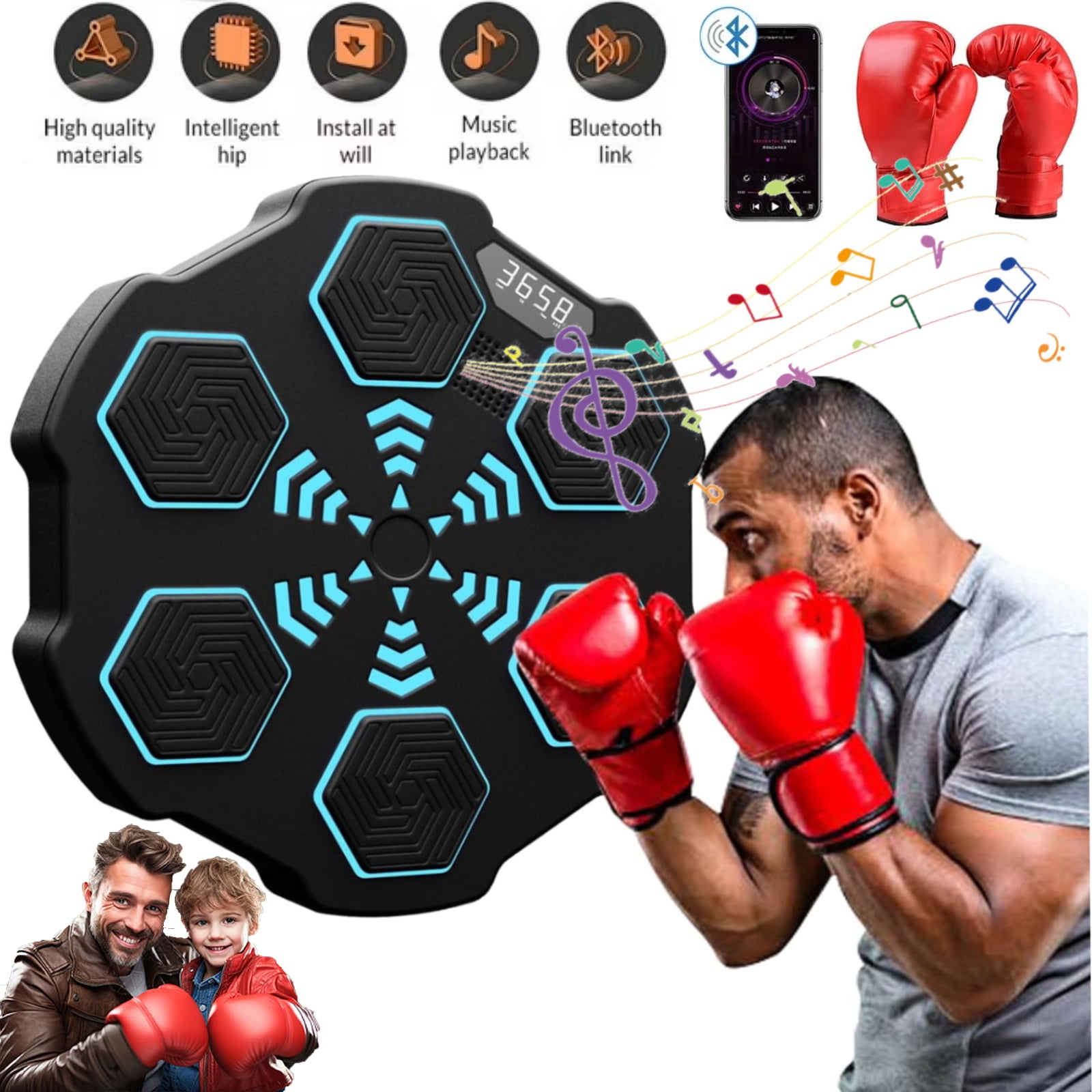 Digital Boxing Machine: Unleash your fitness fun with our smart boxing machine, merging music and exercise seamlessly. Revamp your fitness routine with our LED punch experience! Sync the music to your phone via bluetooth for a dynamic visual rush. Durability and Safety: Our wall-mounted boxing machine is crafted with EPS, which provides sturdy comfort during vigorous workouts. Larger soft striking pads prevent injuries during your workout! Easy Wall Installation: Our versatile smart music boxing machine offers flexibility to place around with its effortless wall mount option. Suitable for varied walls, and we provide you with 3 mounting methods, you can choose the right one according to your needs. Easy Wall Installation: Our versatile smart music boxing machine offers flexibility to place around with its effortless wall mount option. Suitable for varied walls, and we provide you with 3 mounting methods, you can choose the right one according to your needs. Great Gift Option: Searching for unique yet mindful present. Our music boxing machine provides endless amusement and fitness. Give the thrill of laughter, activity – perfect for your loved ones,family, buddies, and kids. 2024 New Music Boxing Machine, Upgraded Smart Bluetooth Music Boxing Parent-Child Games, Wall-Mounted Exercise Equipment for Home Exercise New Fitness(with Boxing Gloves) Smart Electronic Music Boxing Machine, Wall Mounted Boxing Machine Training Punching, Smart Boxing Target Workout Machine for Home,Indoor and Gym