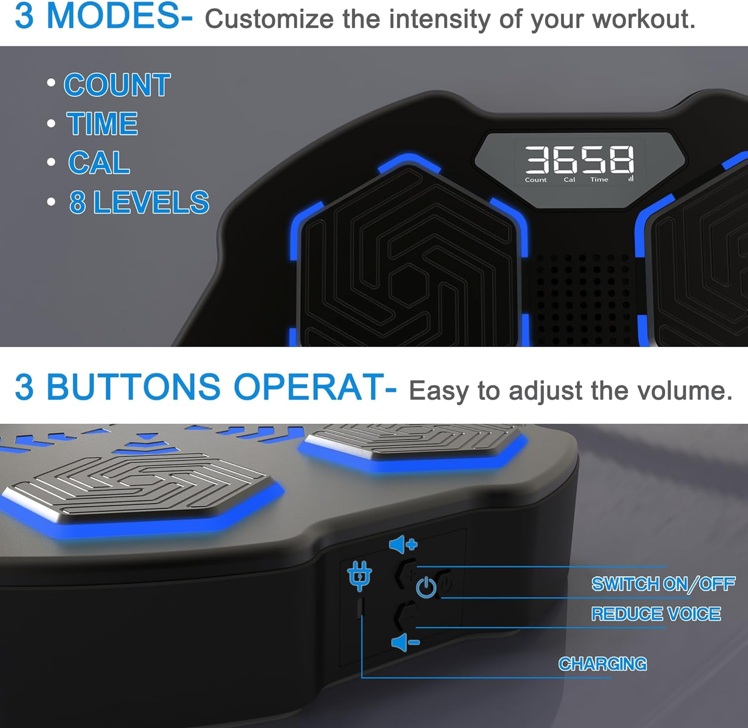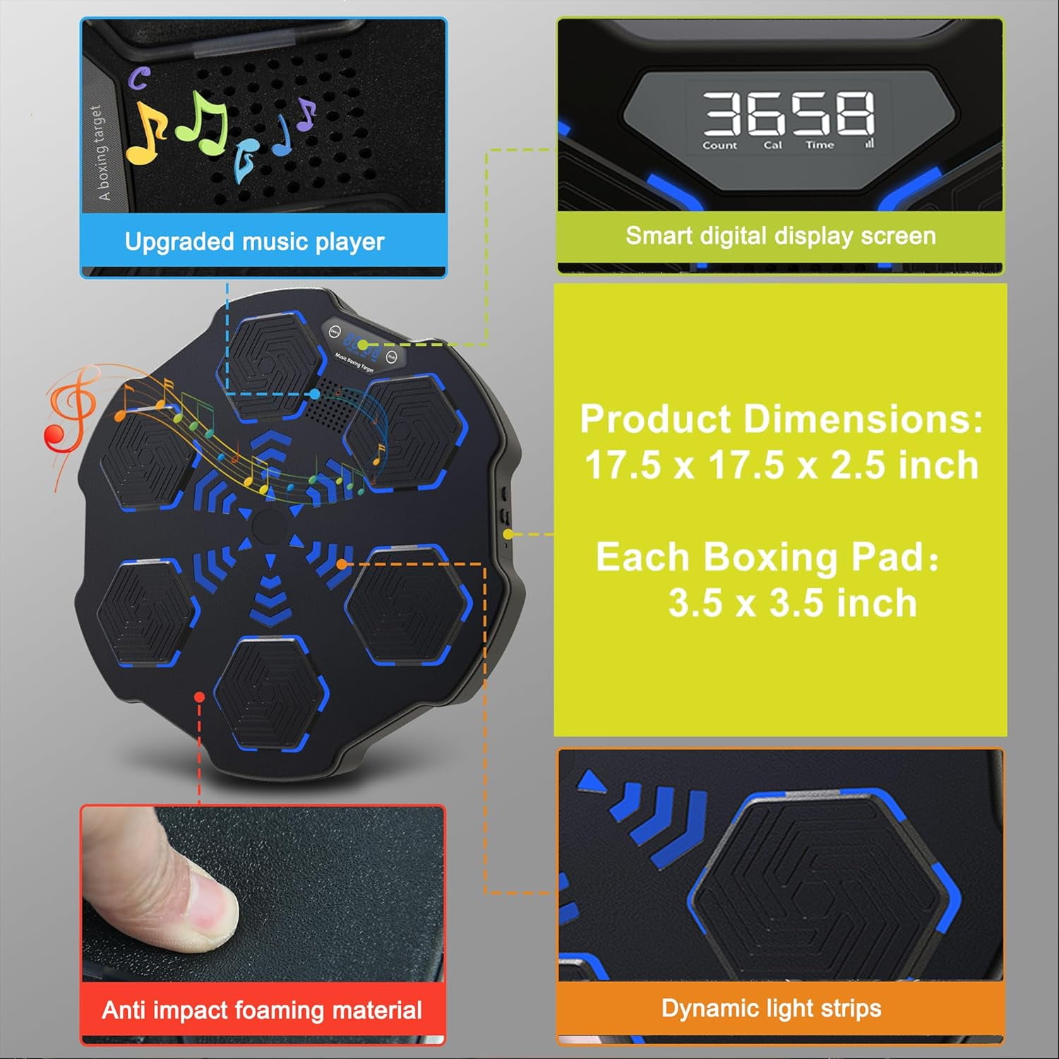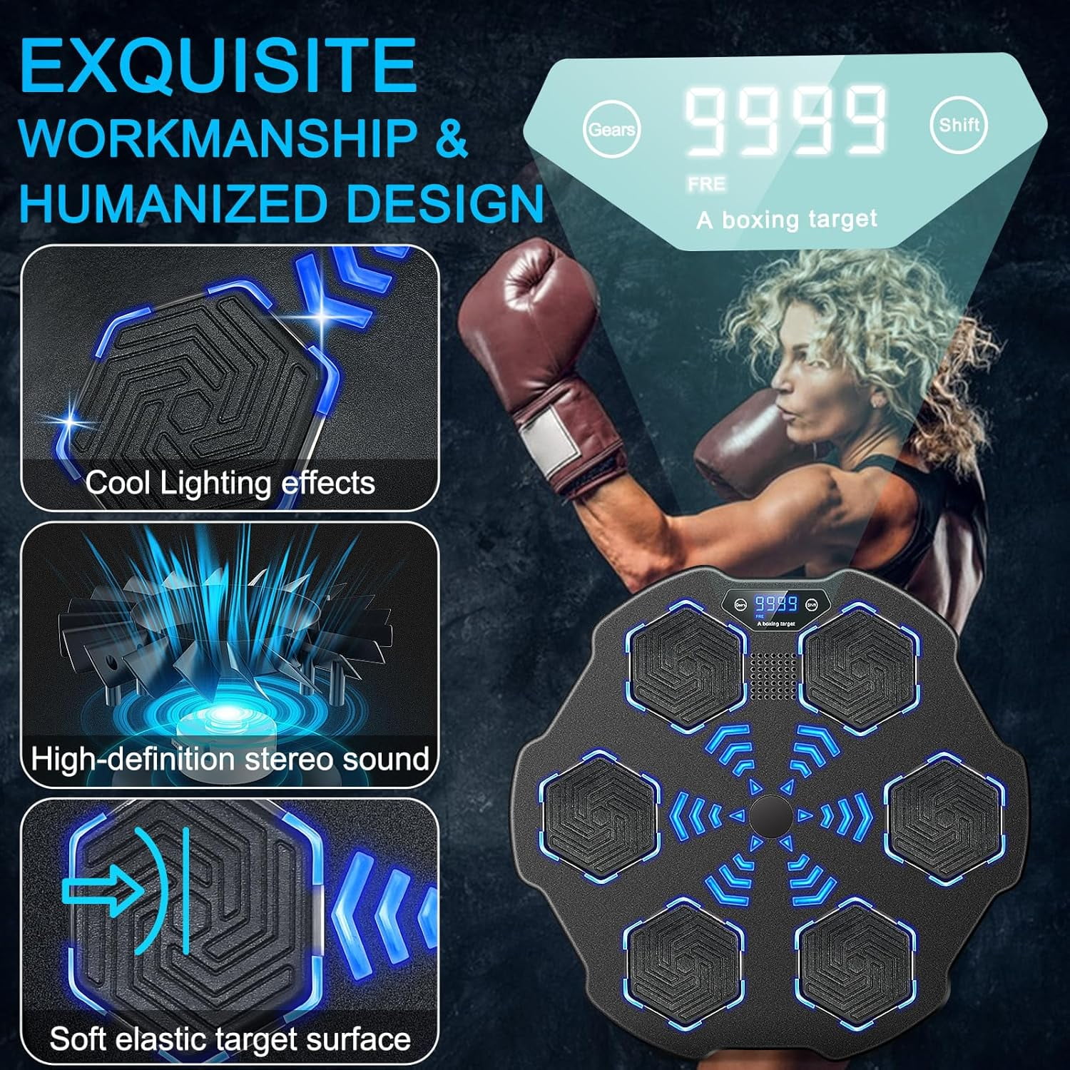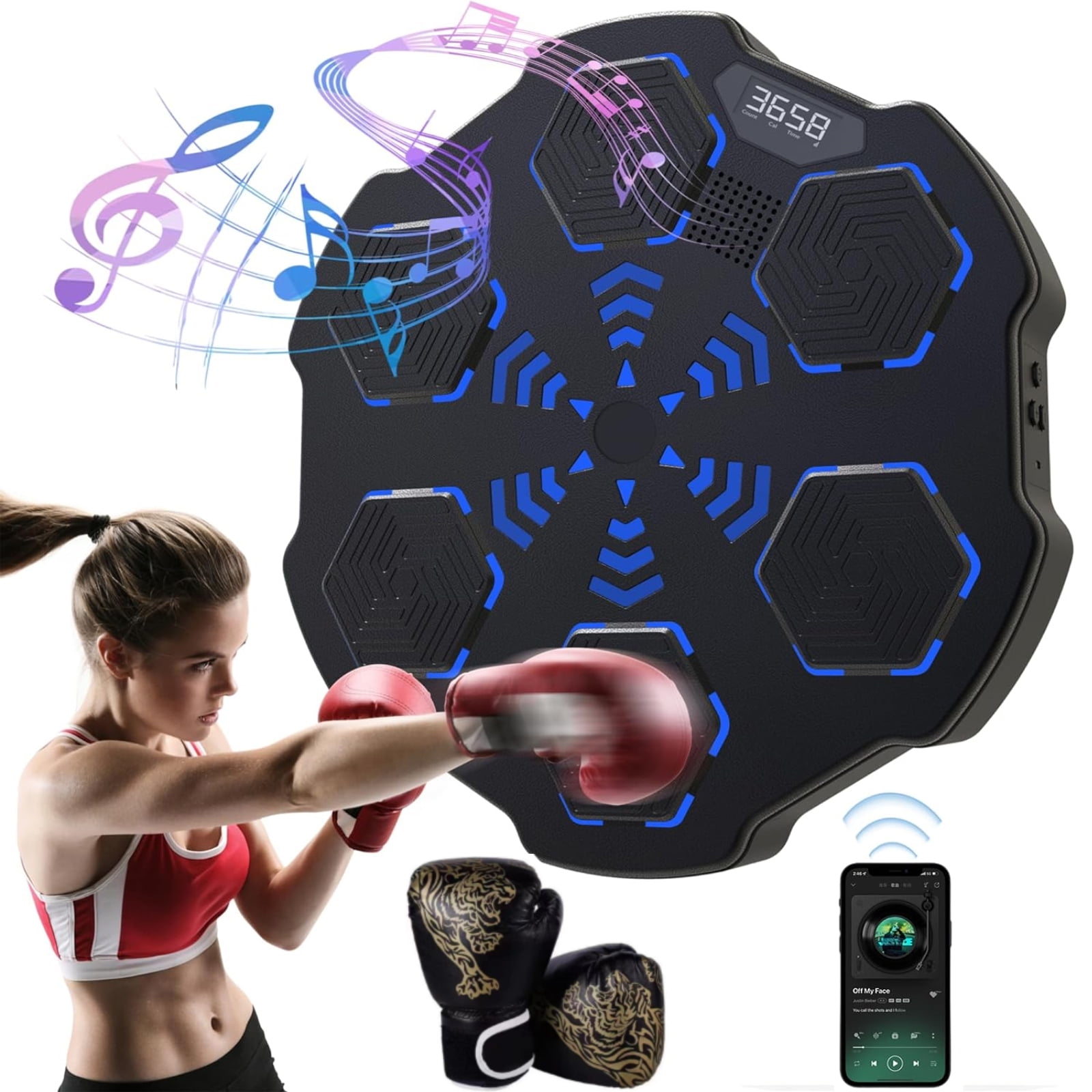 Features: 【Music Boxing Machine】When the boxing target lights up and you hit it with your fist, you get a count. Built-in Bluetooth speaker allows you to exercise boxing with your favorite music! 【Suitable for All Levels】This music boxing machine provides 8 level of rhythmic punches to meet the needs of different people’s experience. Digital screen clearly shows you the counts, time or calorie. 【Quality Materials】The musical boxing machine is made of high quality materials, that can withstand punches up to 250kg/551 lbs. Larger soft striking pads prevent injuries. Comes with boxing gloves. 【Easy Installation】Our smart music boxing machine has 3 installation methods including mount by iron bracket, EVA sticker, or hook-n-loop fastener, you can choose the right one according to your needs. 【Enjoy Boxing at Home】The size of music boxing trainer is 15.7×15.7×2.8″, compact and takes up small space, perfect for relieving stress and enjoying boxing at home. Ideal gift for boxing lovers! Specification: Item name: Smart Bluetooth Boxing Machine Color: As shown Material: Plastic Product size: 40x40x7cm / 15.7×15.7×2.8″ Note: Please allow 1-2cm (0.4-0.8″) difference due to manual measurement. Package Includes: 1 * Music Boxing Machine 1 * Pair of boxing gloves