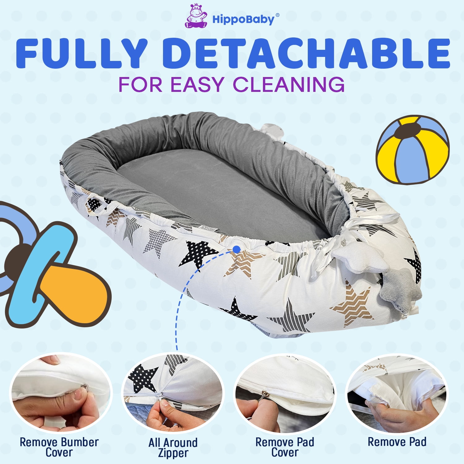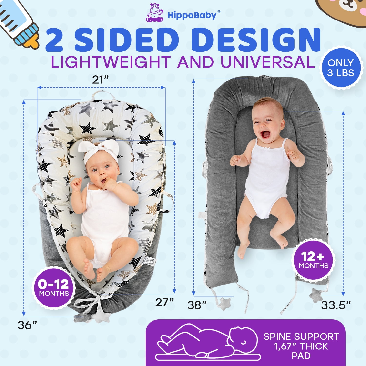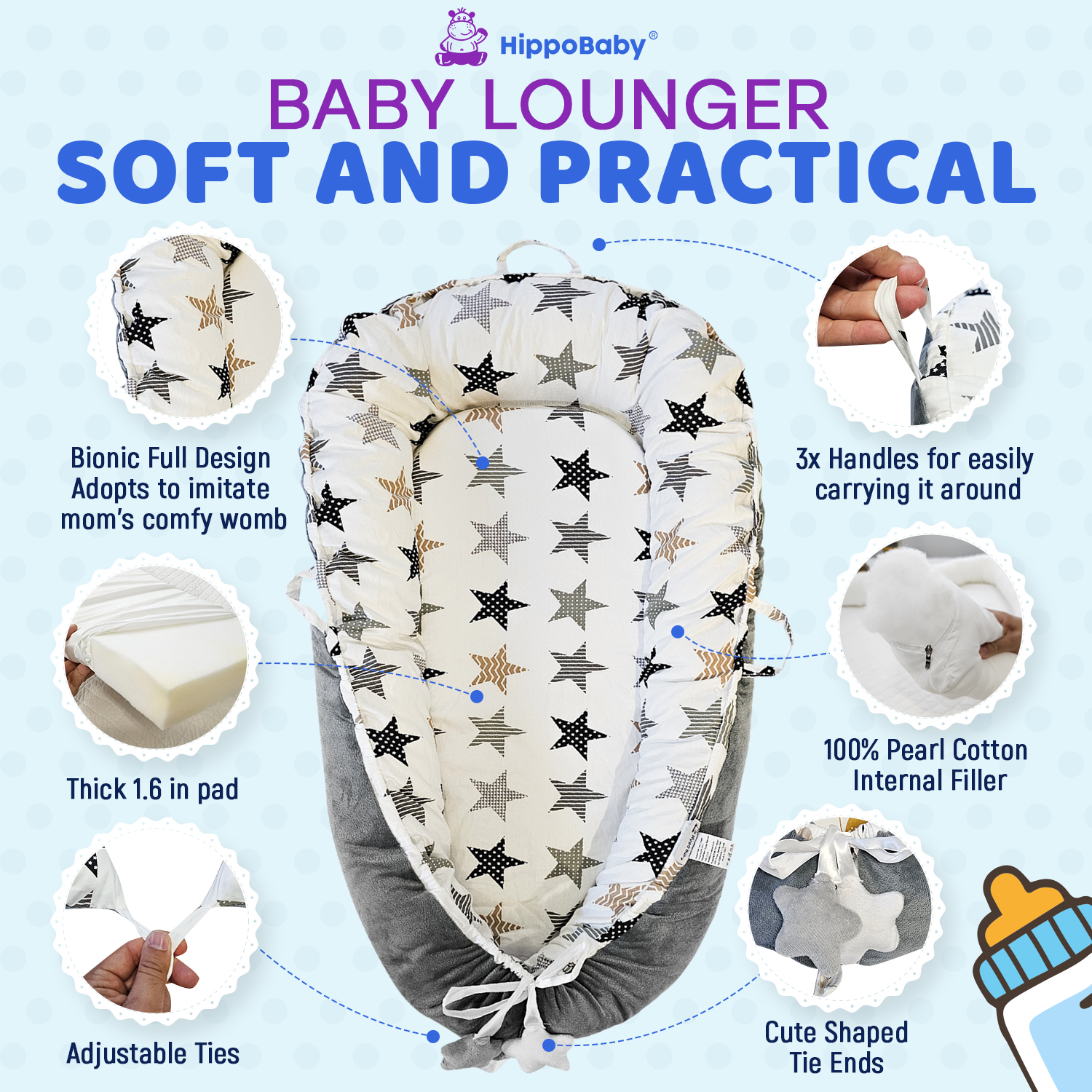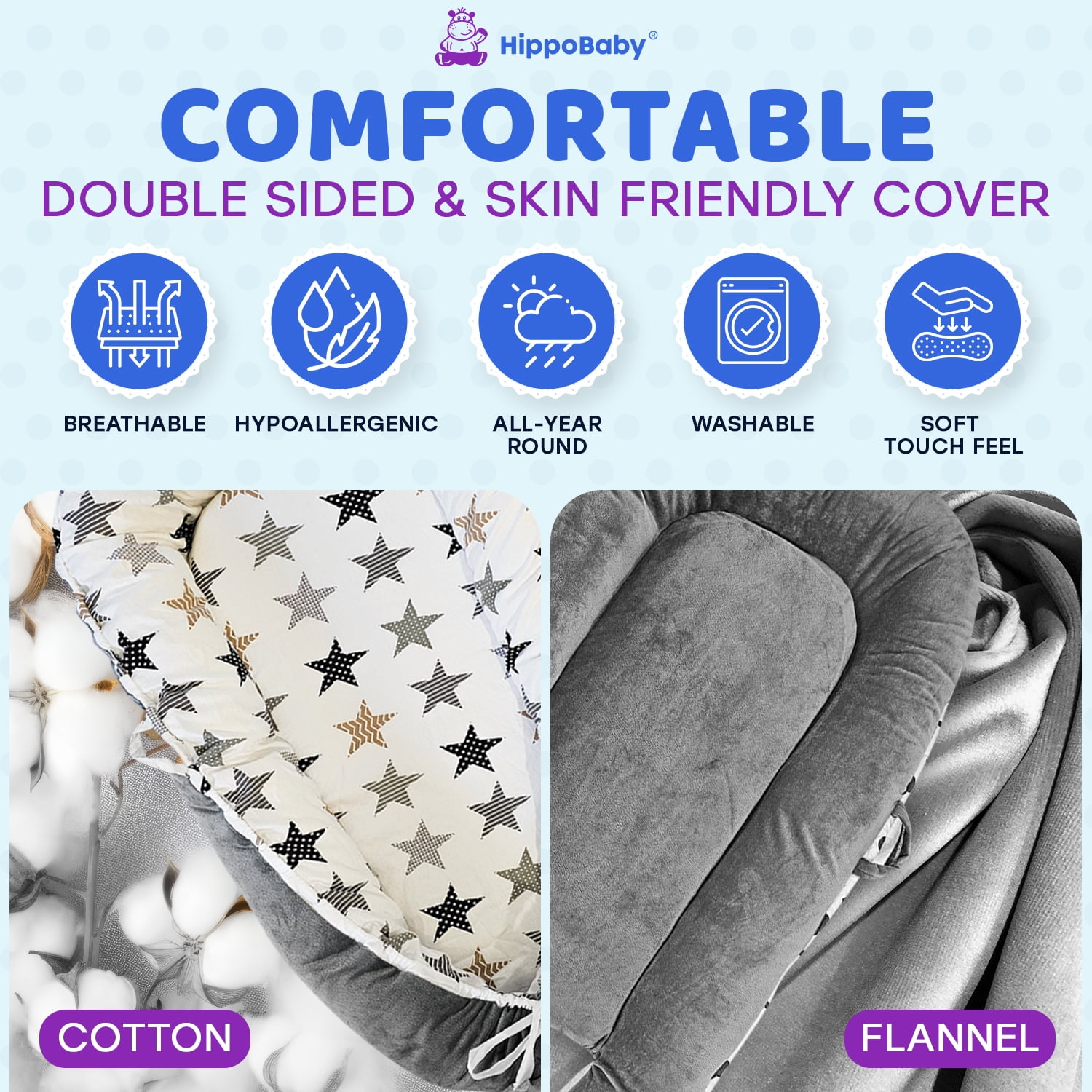 SOFT, BREATHABLE & SAFE: HippoBaby baby lounger for newborn adopts 100% breathable cotton fabric as the cover sheet and is filled with durable pure cotton, providing your baby with the best comfortable support. Keeps the baby relaxed and enjoy their tummy time. Our baby lounger nest is also certified to CPC & CPSIA standards to ensure the lounger for the baby meets all the safety standards. KEEP YOUR BABY SAFE: HippoBaby newborn baby cover imitates the mother’s womb to create a safe and comfortable spot for your baby to lay, sit up and play and do lots of tummy time under parent’s supervision. The safe, 100% cotton all-round bumper design protects your baby from collisions, rolling out or falling off while giving them a sense of warmth and security. What’s more, the zipper for the cotton baby cover is hidden all around the lounger for safety of the baby and it is convenient to remove the bumper. MULTIFUCTIONAL, TAKE IT EVERYWHERE: The baby lounger cover is about 36 x 21 inches and only weighs 3 lbs. With a lightweight design with two handles, the newborn lounger is easy to move to your sofa, living room, travel, car, beach, or outdoors for your newborn’s tummy time or lounging. DETACHABLE & MACHINE WASHABLE: The invisible zipper of the baby lounger cover makes it easy to remove the fabric cover for easy cleaning. The cover is hand washable and machine washable, making cleaning a breeze. We selected the firm, soft, and flat 1.67” (4cm) thick mattress pad to provide unique support for your baby’s spine without affecting your baby’s growth and development. PERFECT BABY SHOWER GIFT: HippoBaby’s baby lounger set will make a wonderful gift idea for new parents and parents-to-be on baby showers, baby registry, birthdays, housewarming, newborn essentials, etc. A must-have for every parent, suitable from 0- 24 months.