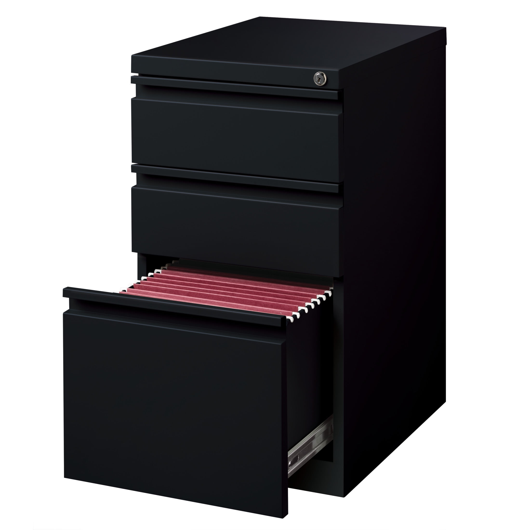 20-inch deep Mobile Pedestal File Cabinet with a three-drawer box-box-file drawer configuration is designed to provide storage solutions for your home or professional office. It features durable, fully assembled steel construction with a non-porous surface that is easy to clean. These commercial grade mobile pedestals come standard with factory installed hidden casters, full extension drawers, counterweights, and a core-removable file cabinet lock for security. The file drawer accommodates letter-size hanging files. The commercial grade ball-bearing drawer slide suspension ensures a smooth and quiet drawer performance. Extended fronts with full-width drawer pulls provide a sleek and contemporary design. These metal file cabinets are available in multiple colors to enrich your workspace. It’s 27.75″ height allows these units to roll under most work surfaces and office desks. Limited Lifetime Warranty. Unit meets or exceeds ANSI-BIFMA industry standards. Greenguard Gold Certified. Color: Black