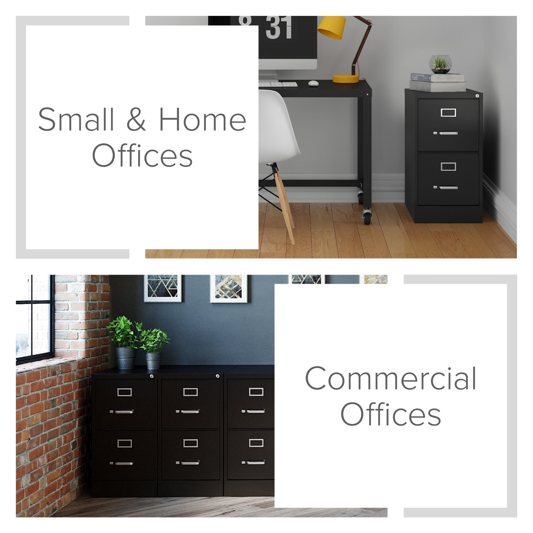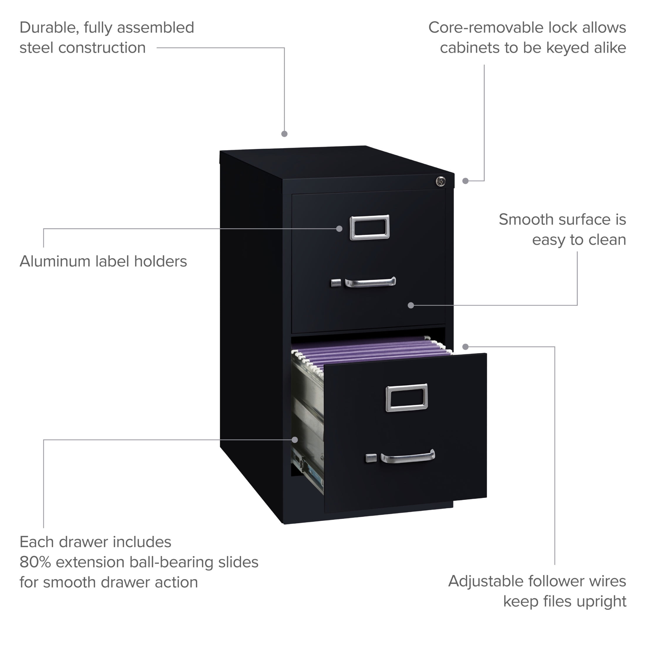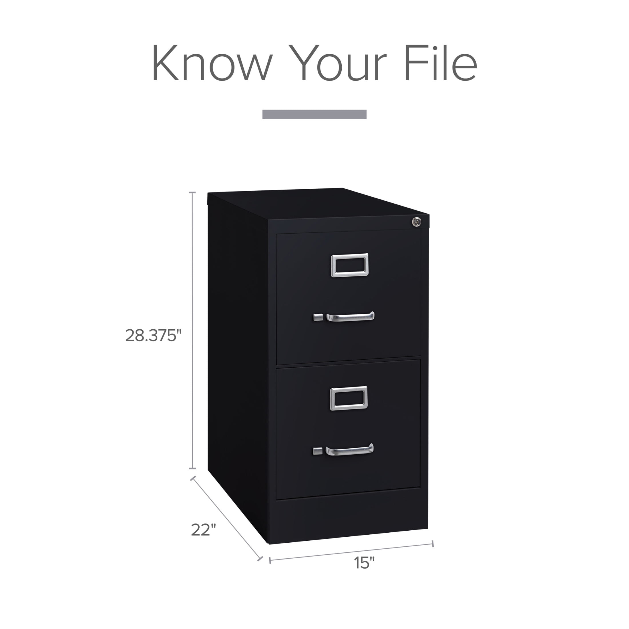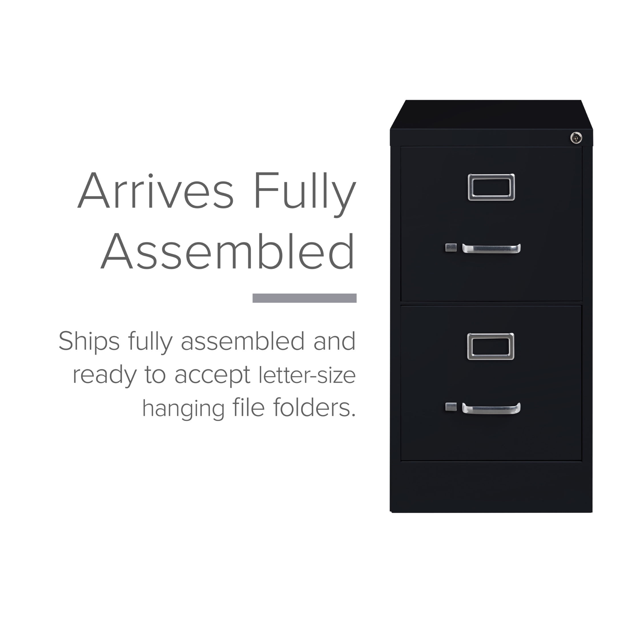 This Two Drawer Metal File Cabinet features letter width drawers that are the perfect storage solution for professional offices or large home offices. This cabinet highlight a classic design and feature durable steel construction that can stand up to heavy-duty use. This filing cabinet ships fully assembled and is ready to accept letter width hanging file folders. The durable painted surface is smooth and easy to clean. Each drawer includes 80% extension commercial grade ball-bearing slides for smooth drawer action. Even fully loaded, these drawers open with ease. Adjustable follower wires keep files upright and organized. The included core-removable cabinet lock allows cabinets to be keyed alike. These cabinets are designed to meet or exceed ANSI-BIFMA industry standards for performance and workmanship. Our cabinets are made with 27% recycled content and are backed by a limited lifetime warranty. Color: Black