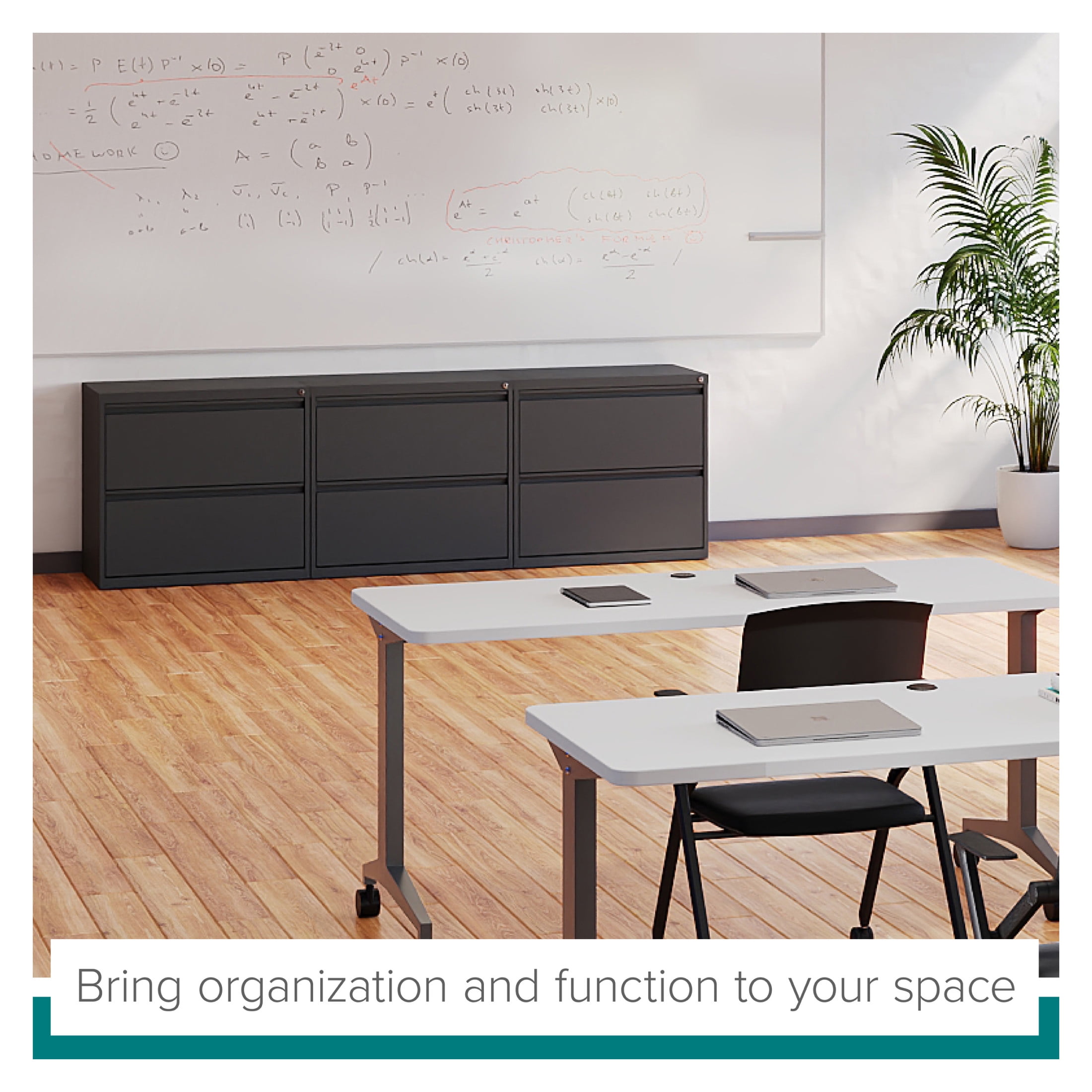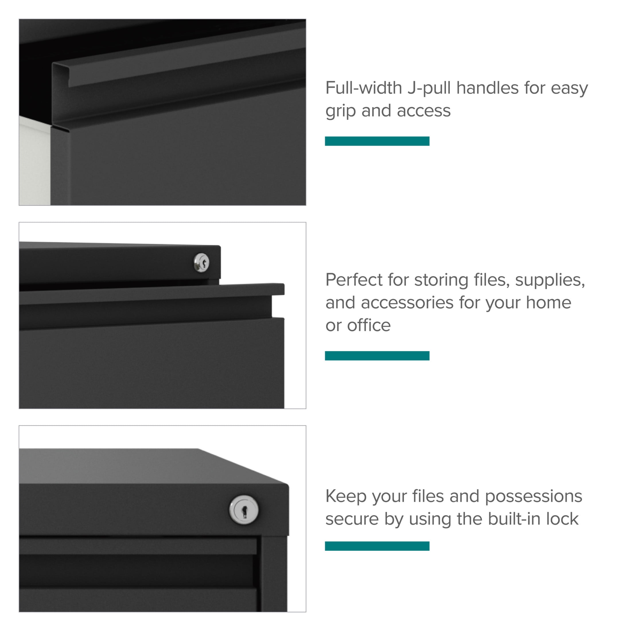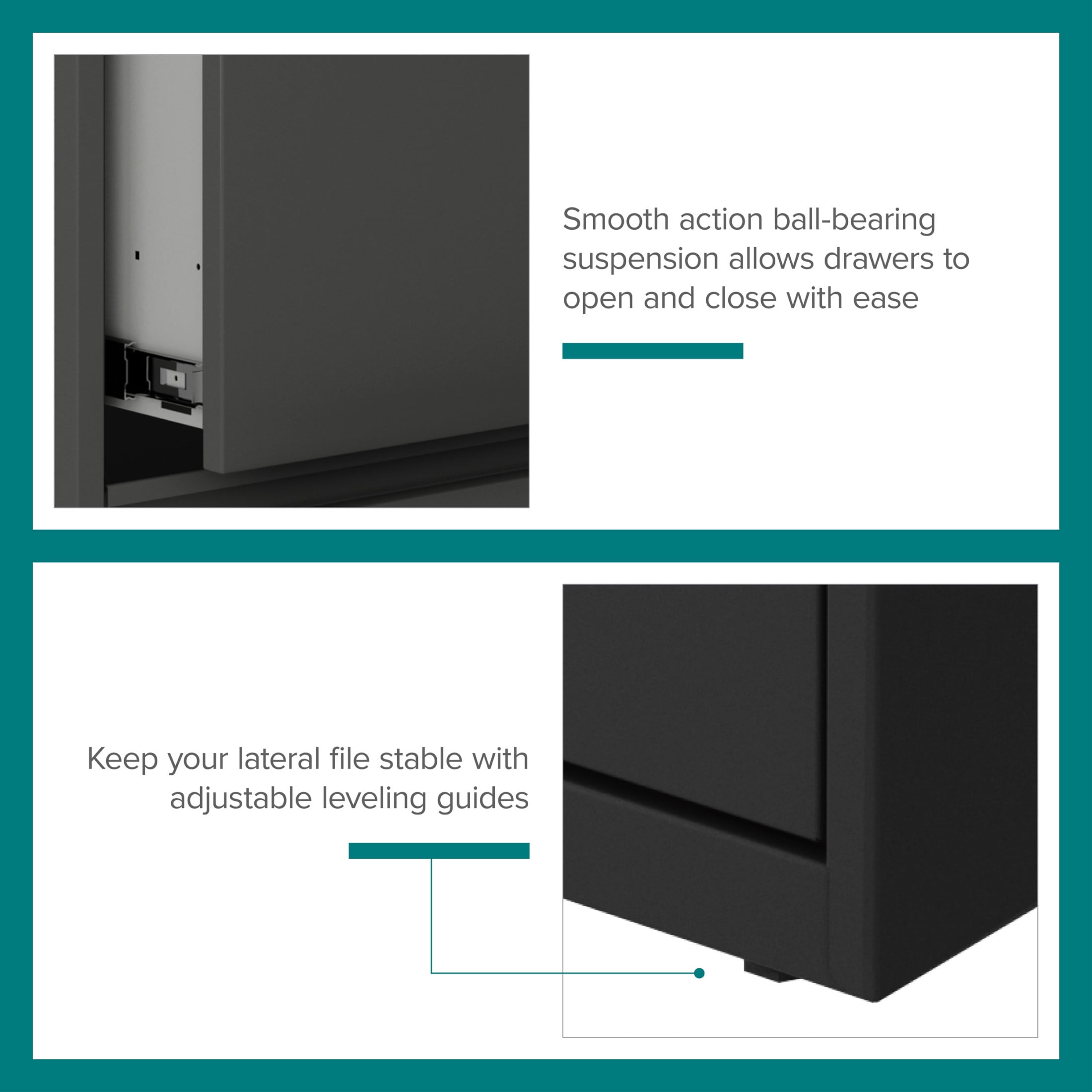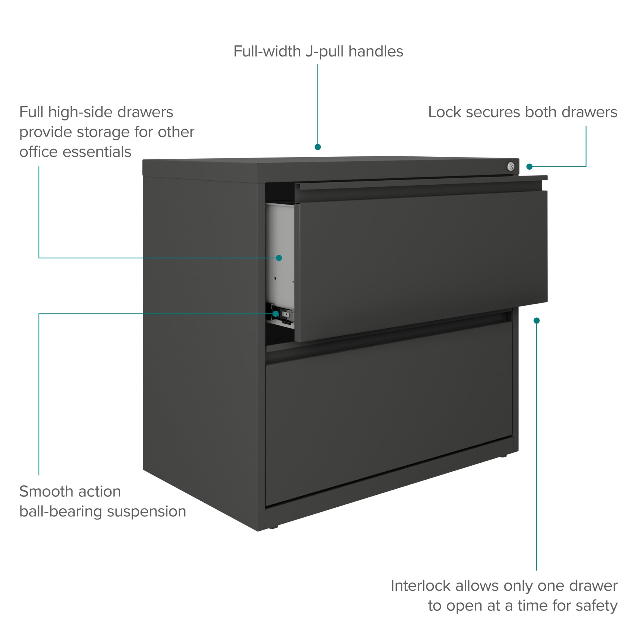 File cabinet lock secures both drawers Durable, fully assembled steel construction with non-porous surface that is easy to clean and disinfect Smooth action ball-bearing drawer slide suspension Interlock allows only one drawer to open at a time Full high-side drawers provide storage for other office essentials Designed for letter width hanging files Eco-friendly, containing up to 30% recycled material GREENGUARD Gold certified Hirsh 30 inch Wide 2 Drawer Lateral 101 File Cabinet for Home or Office, Charcoal