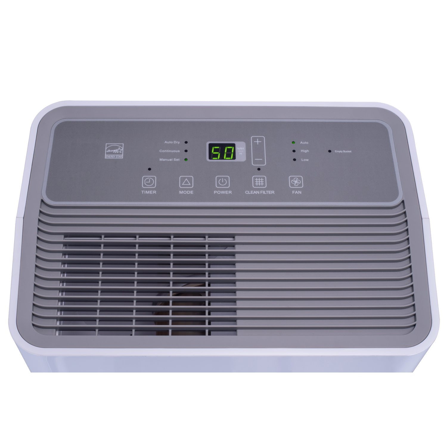Energy Star rated 50-pint portable dehumidifier Designed for rooms up to 4500 sq ft Slide-out water bucket with an 18.6-pint capacity Automatic shut-off feature when the bucket is full 2 fan speeds Digital electronic control and LED display Continuous drain option with a standard garden hose (not included) Adjustable humidistat Washable filter for optimal efficiency