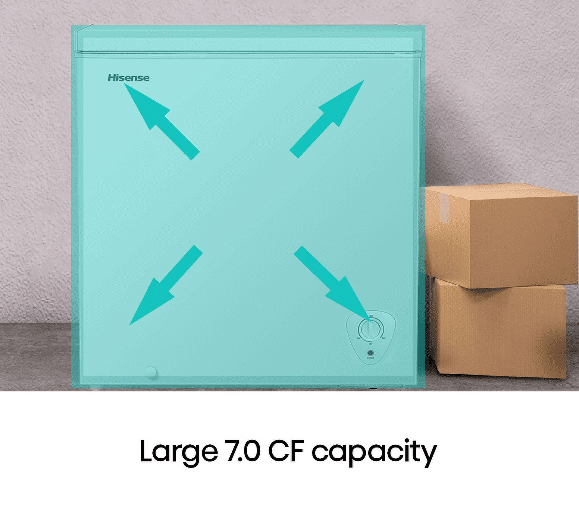 Large 7.0 CF capacity for ample storage space Garage ready – designed and tested to perform in temperatures between 0 °F 110 °F Easytoopen side handle for convenient access Sliding wire basket for easier access to frequently used items Hisense “Temp Hold” technology maintains a temperature of 32° F for up to 135 hours during power outages, preventing food spoilage