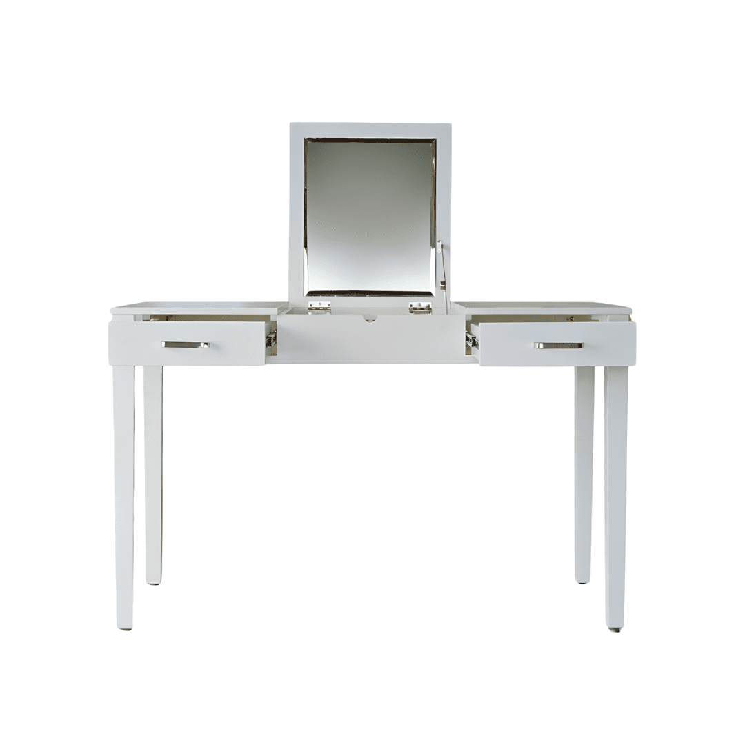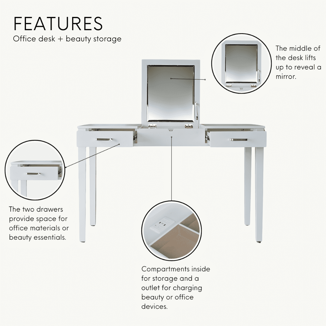 Functional and versatile, the Ainsley Vanity desk is one of those furniture pieces that transforms a room for the better. Two pull-out drawers on either side of the desk effortlessly slide open thanks to metal drawer glides, Revealing plenty of space to house your beauty and study essentials. The top lid lifts to reveal a beveled Vanity mirror, and additional storage space. A built in power outlet and USB port within the top compartment provides a convenient spot for charging your devices, or plugging in beauty tools, while a cord management hole allows additional cables to remain undetected. The Ainsley Vanity desk will serve as a functional and attractive centerpiece for your bedroom.