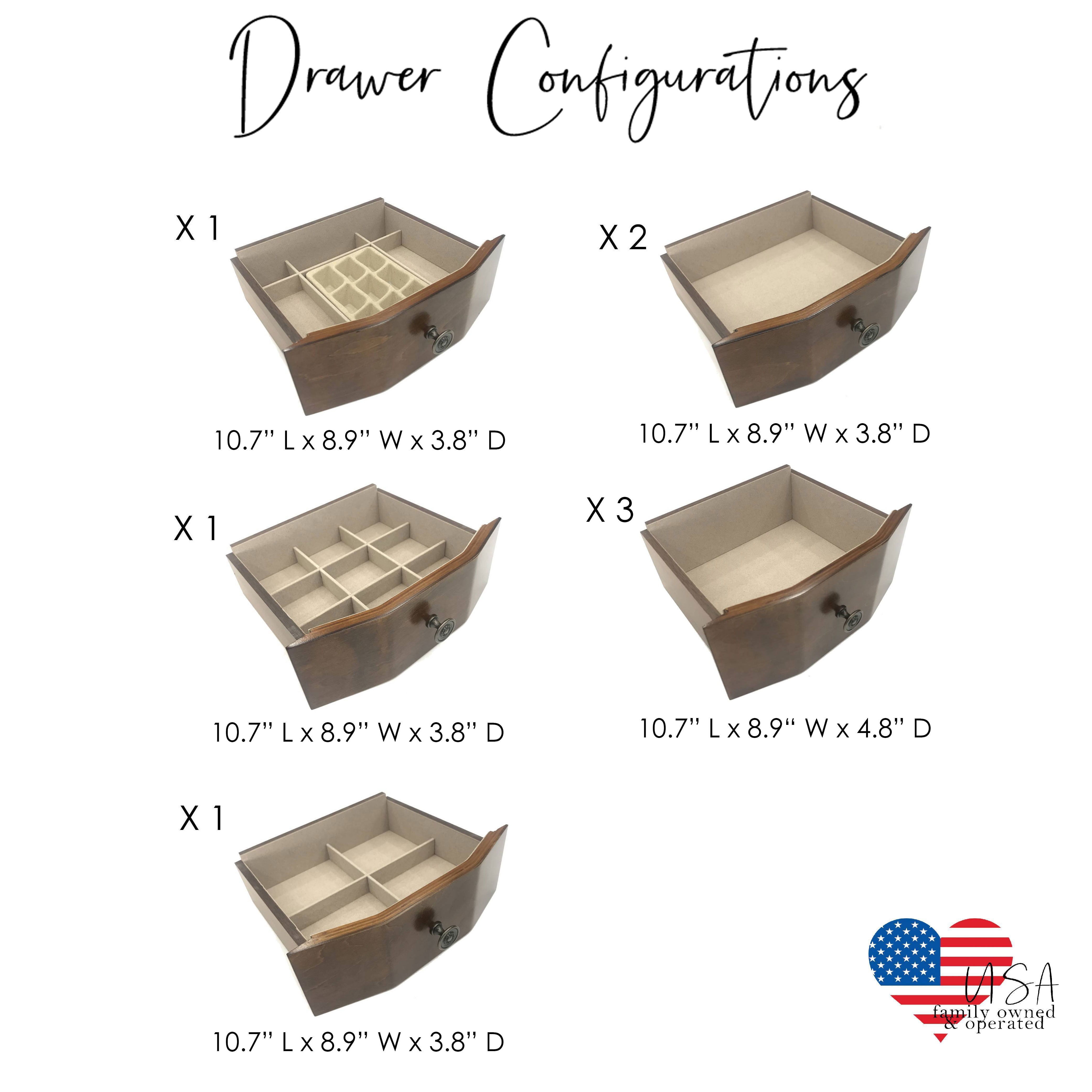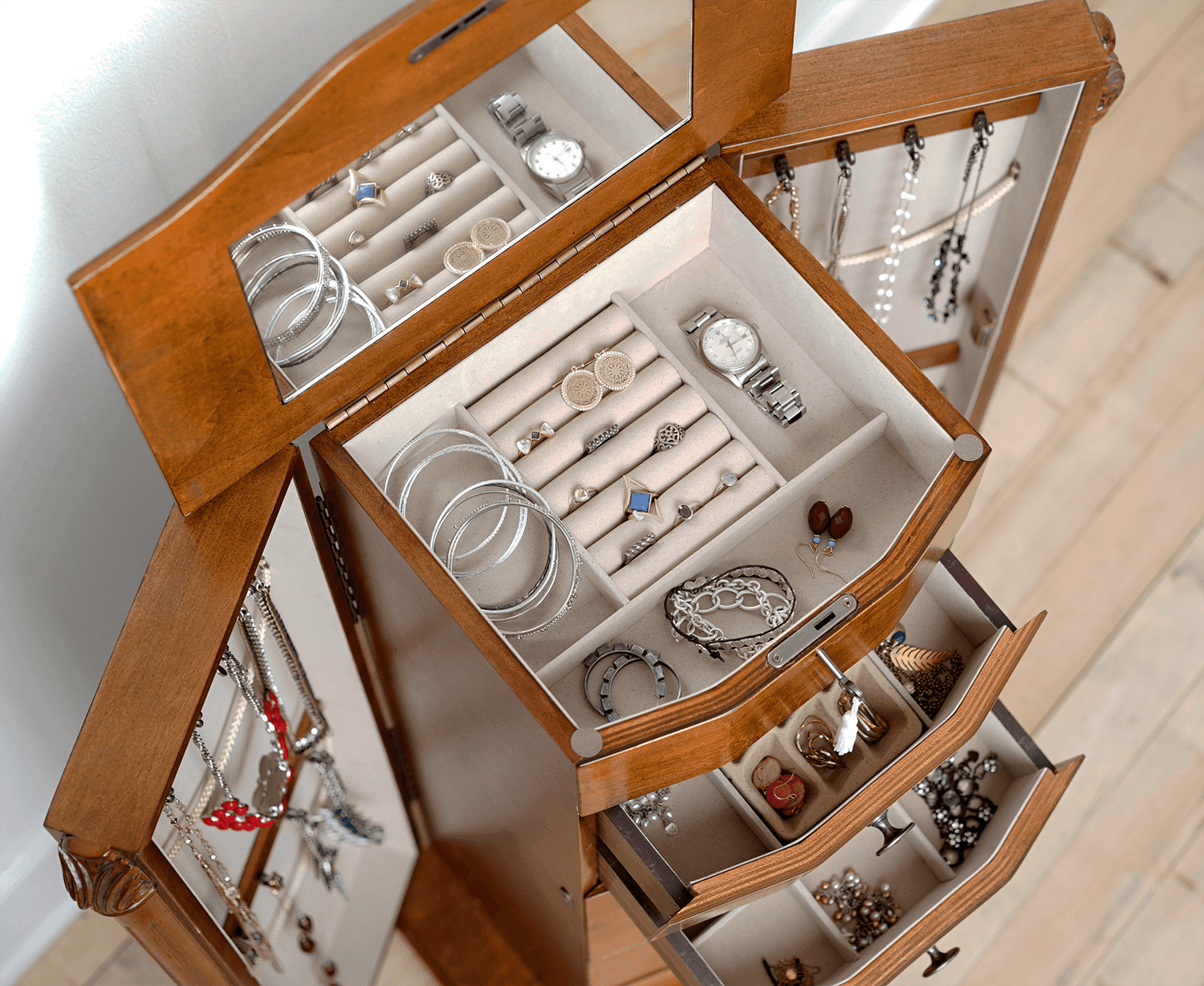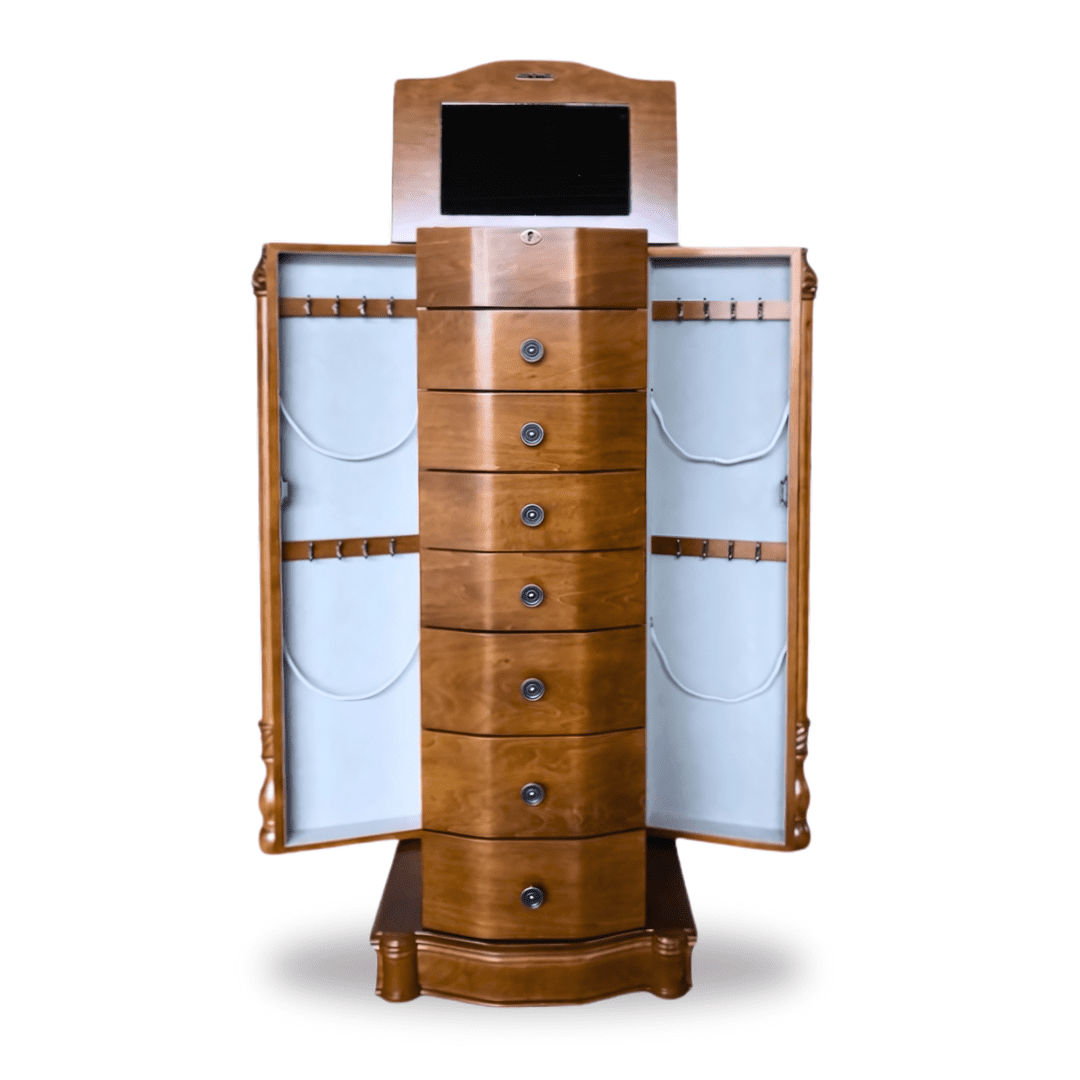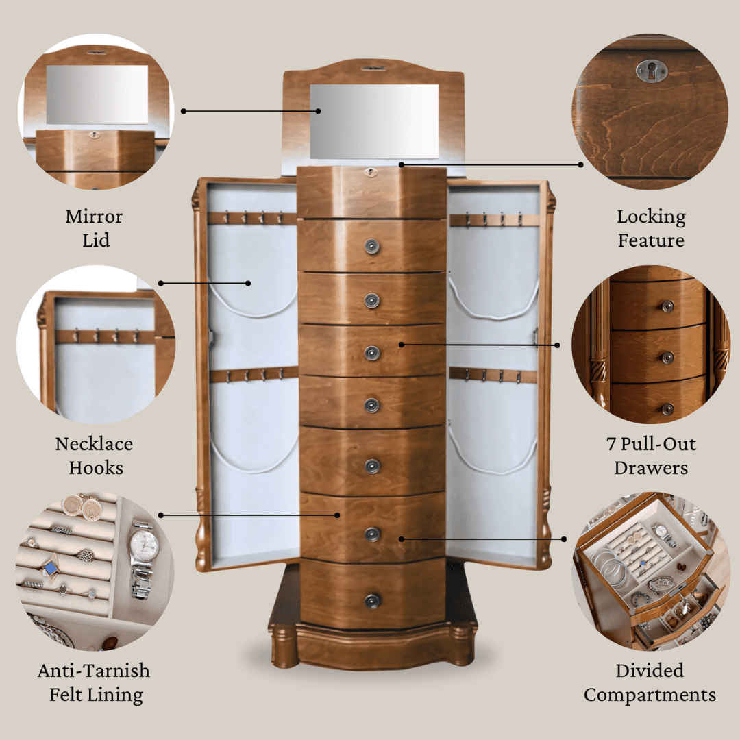 Handcrafted Antique Walnut Finish: Our expert artisans meticulously apply a rich and luxurious antique walnut finish to each jewelry armoire, ensuring a stunning and unique piece for your collection. 7 Lined and Padded Drawers: Keep your jewelry collection organized and protected with our jewelry armoire’s 7 spacious drawers, each lined and padded to prevent scratching or damage. Separated Compartments: Say goodbye to tangled necklaces and misplaced earrings! Our jewelry armoire features separated compartments in each drawer, allowing you to easily organize and find your favorite pieces. Dual-Sided Necklace Doors: Never worry about tangled necklaces again! The doors of our jewelry armoire open on both sides, featuring 8 double-prong necklace hooks in each door, providing ample space to hang your necklaces with ease. Mirror and Divided Compartments: Conveniently store and accessorize with our jewelry armoire’s built-in mirror, perfect for checking your look before heading out. Lift the lid to reveal divided compartments for storing smaller items like rings, bracelets, and earrings. Lock and Key Feature: Keep your precious jewelry safe and secure with the lock and key feature of our jewelry armoire. Enjoy peace of mind knowing that your valuables are protected from unwanted access. Product Dimensions: 37.75″ H x 16″ W x 10.75″ D.