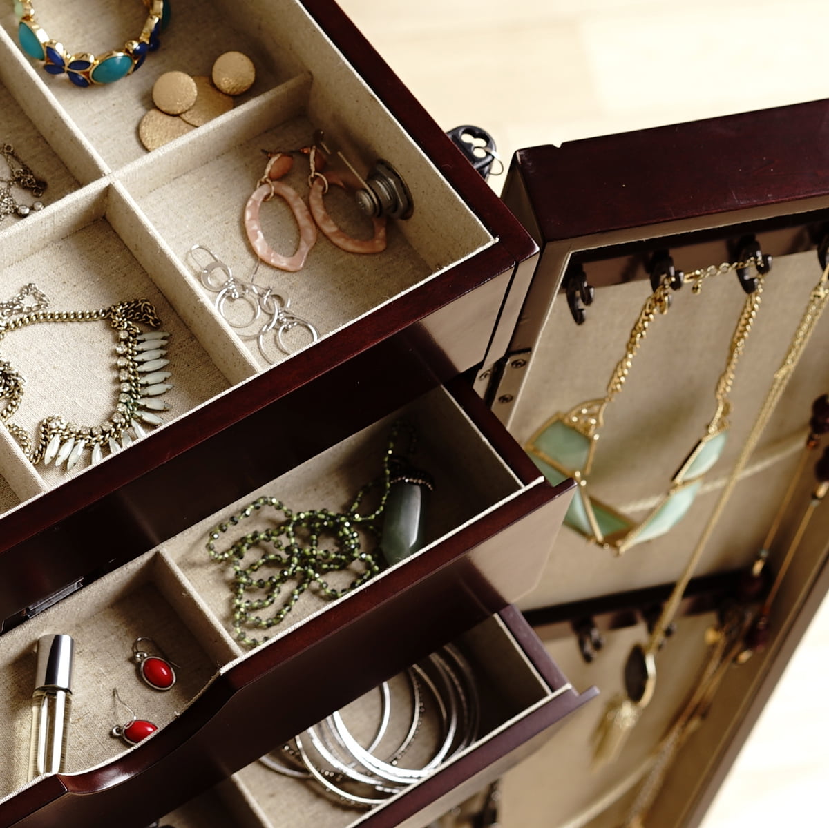 Fully locking function 7 drawers – 3 drawers with divided compartments and 4 drawers with open storage Lined in anti-tarnish linen French-style doors – 10 necklace hooks on each side Top Lid lifts to reveal mirror, ring rolls, and divided storage compartments Bronze hardware Solid wood veneer and all wooden construction Fully assembled – just screw on legs Product Dimensions: 19″ W x 13.75″ D x 40″ H″
