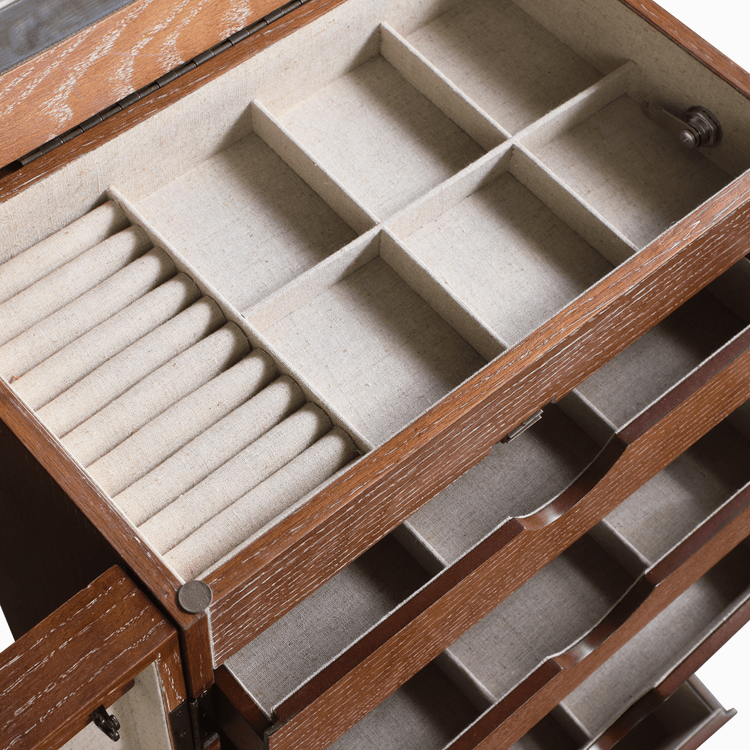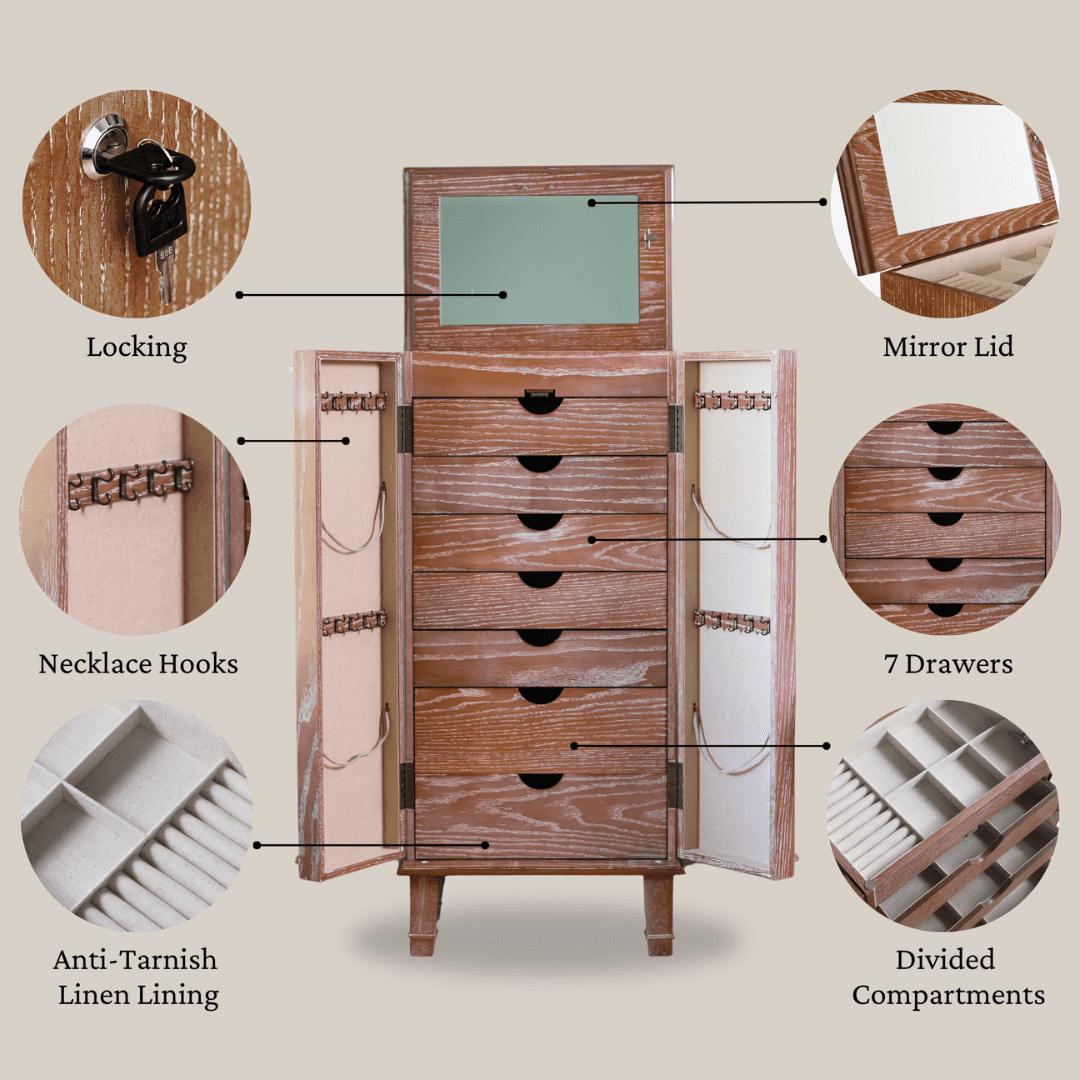 Fully locking function 7 drawers – 3 drawers with divided compartments and 4 drawers with open storage Lined in anti-tarnish linen French-style doors – 10 necklace hooks on each side Top Lid lifts to reveal mirror, ring rolls, and divided storage compartments Bronze hardware Solid wood veneer and all wooden construction Fully assembled – just screw on legs Product Dimensions: 19″ W x 13.75″ D x 40″ H″