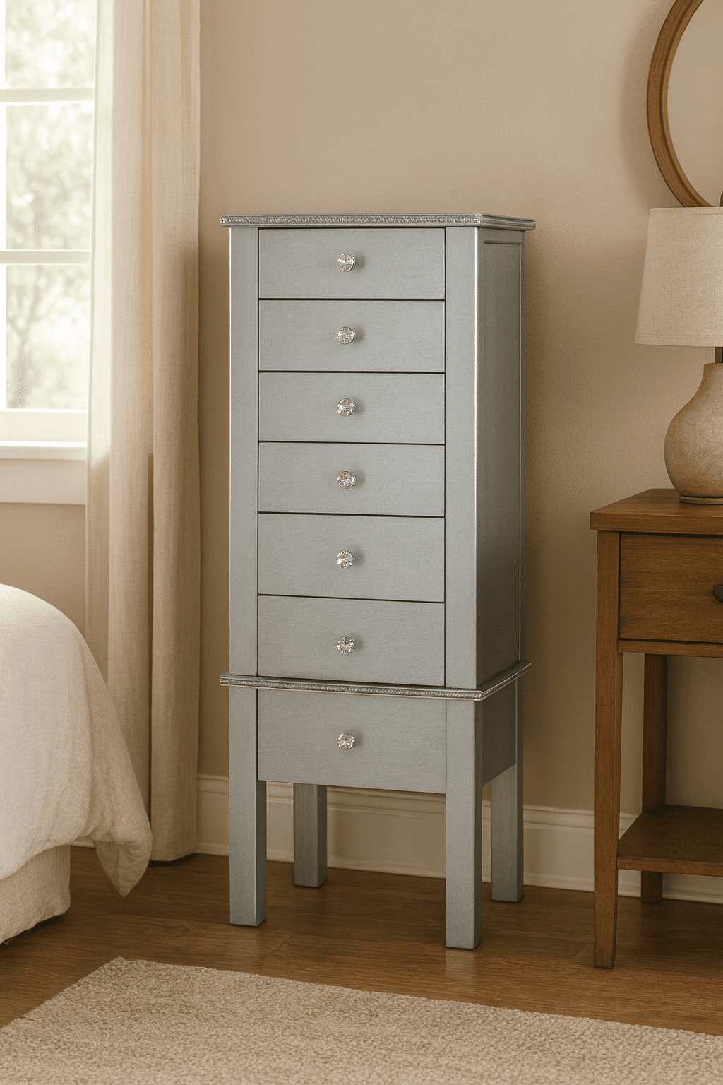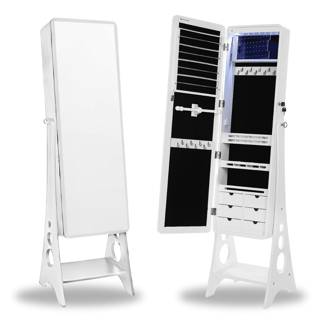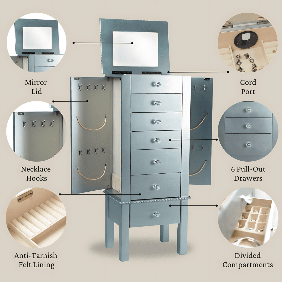 HVHN1078 Features Custom crystal hardware finish Mirrored top lid Stylish and functional 6 Spacious pullout drawers with divided compartments and 2 large side doors with metal necklace hooks 3 drawers are subdivided: Yes Removable knobs: No Product Type: Free standing Style: Contemporary Mirror Included: Yes Lift Top Compartment: Yes Drawers Included: Yes Necklace/Tie Hooks Included: Yes Mirror Type: Flip up mirror Dimensions Overall Height – Top to Bottom: 38” Overall Width – Side to Side: 15.75” Overall Depth – Front to Back: 12.25” Overall Product Weight: 38 lbs
