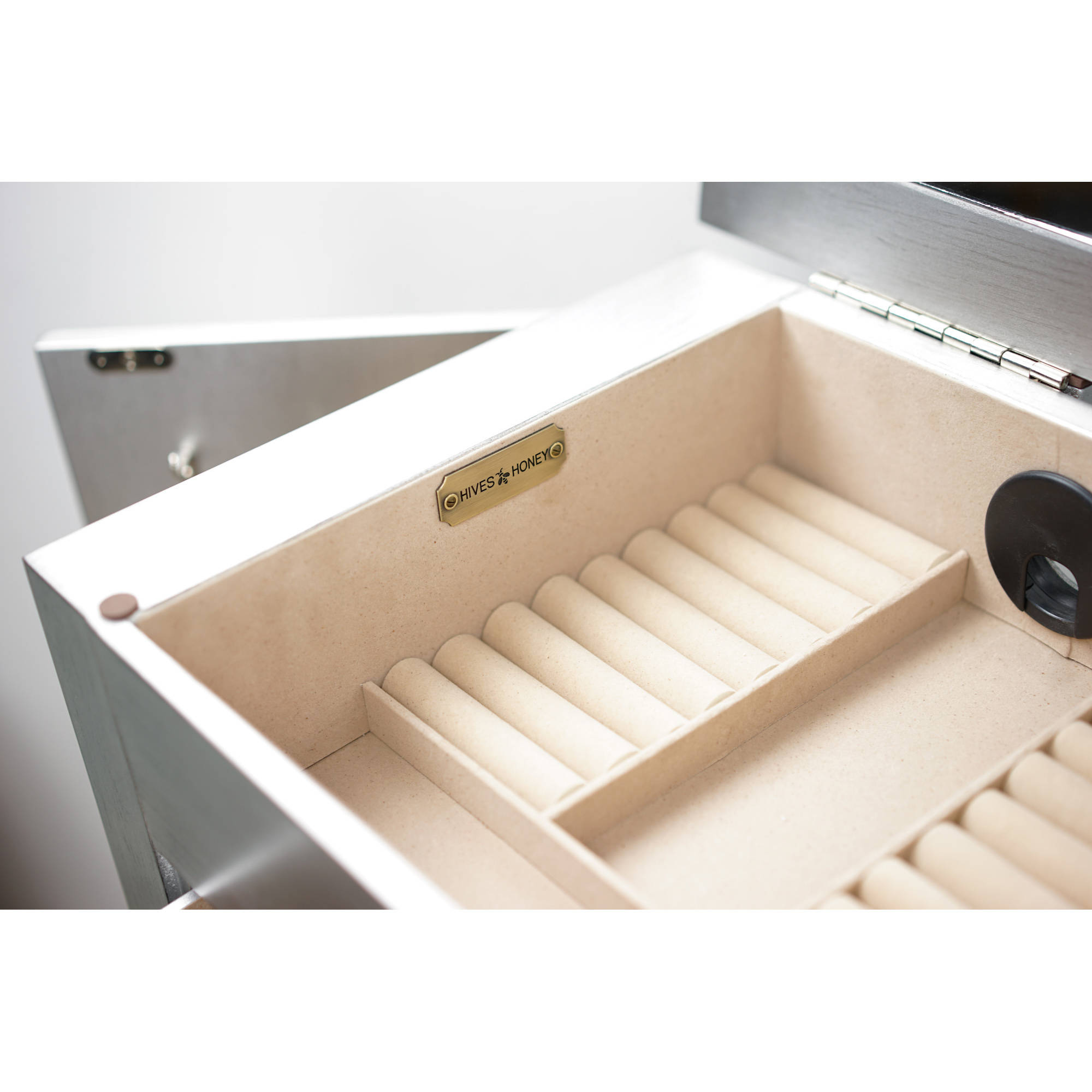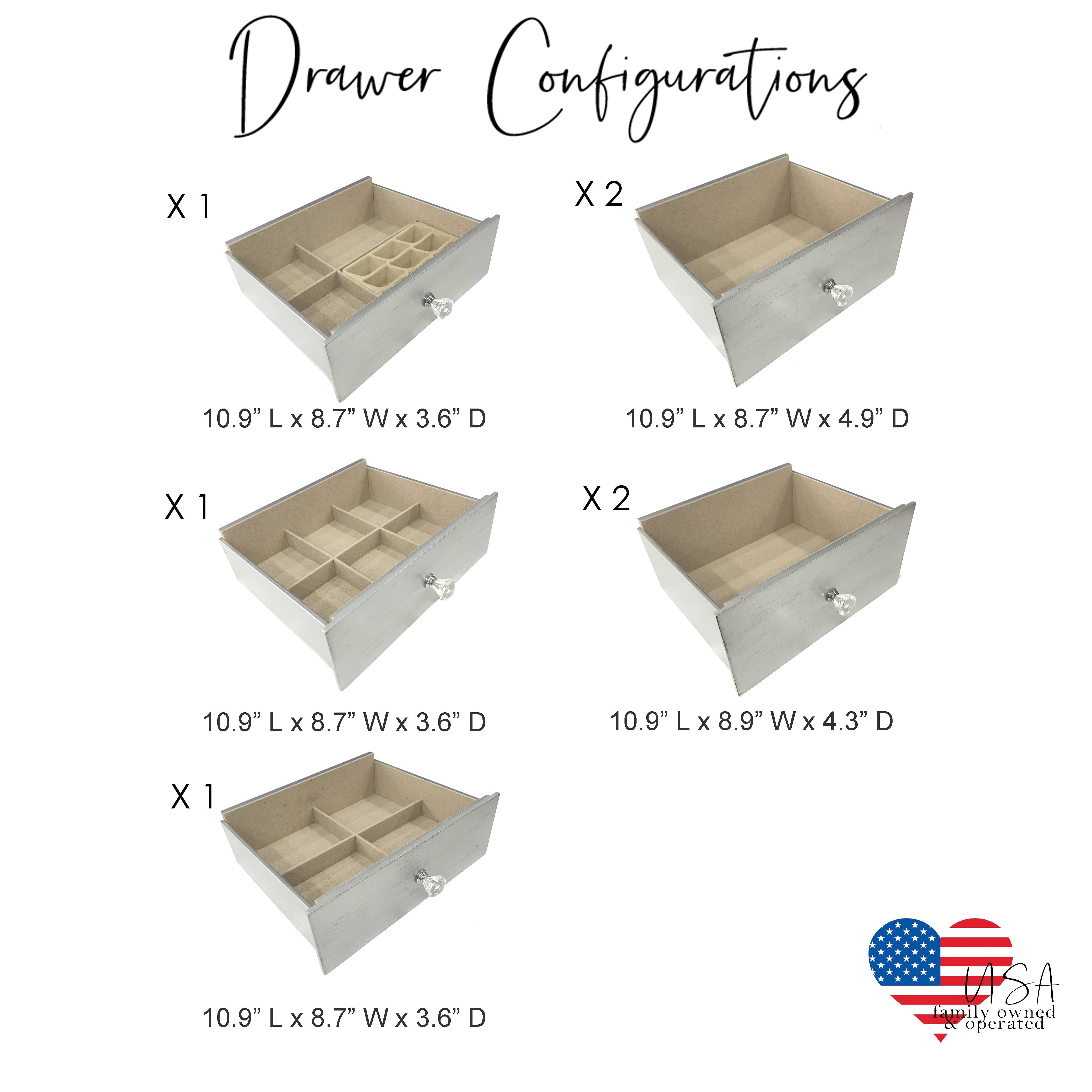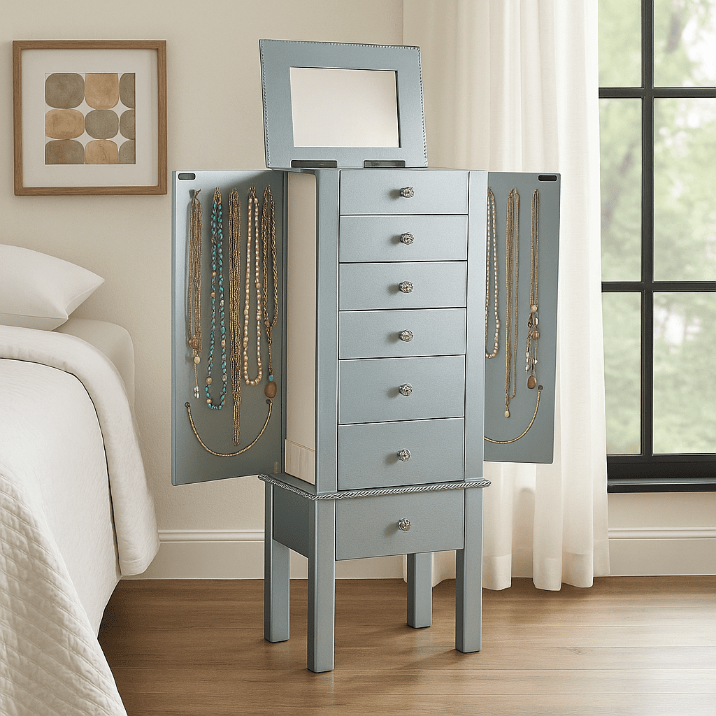 HVHN1078 Features Custom crystal hardware finish Mirrored top lid Stylish and functional 6 Spacious pullout drawers with divided compartments and 2 large side doors with metal necklace hooks 3 drawers are subdivided: Yes Removable knobs: No Product Type: Free standing Style: Contemporary Mirror Included: Yes Lift Top Compartment: Yes Drawers Included: Yes Necklace/Tie Hooks Included: Yes Mirror Type: Flip up mirror Dimensions Overall Height – Top to Bottom: 38” Overall Width – Side to Side: 15.75” Overall Depth – Front to Back: 12.25” Overall Product Weight: 38 lbs