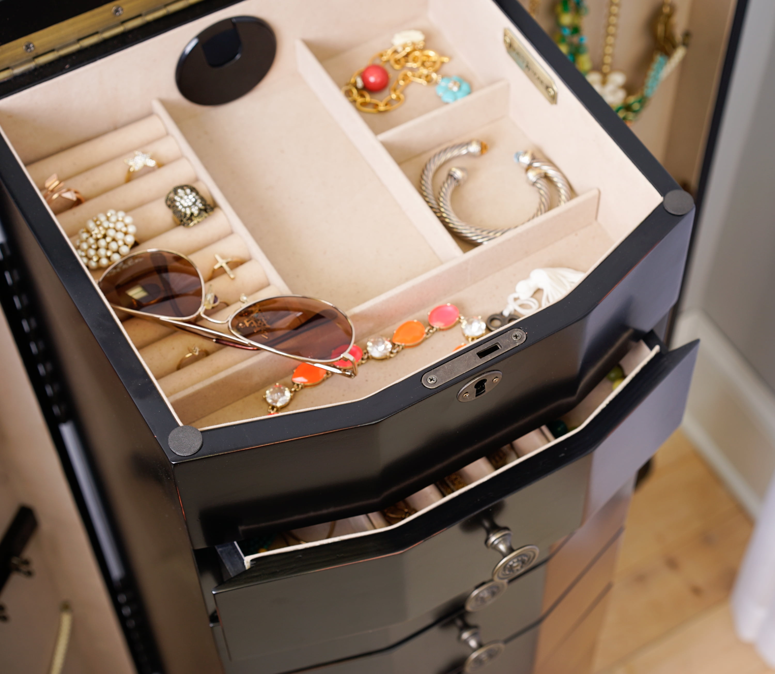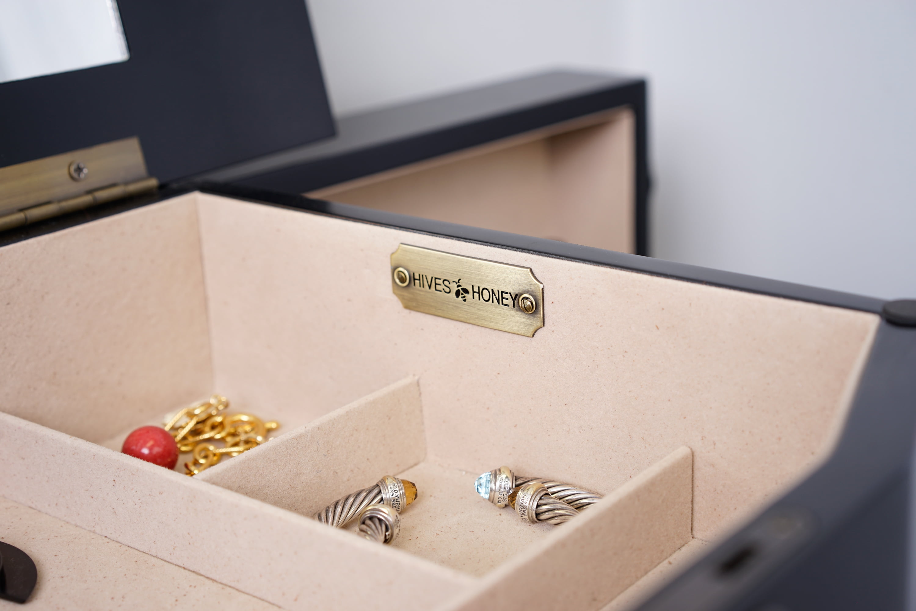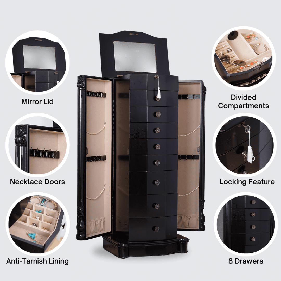 The Florence Walnut Jewelry Armoire is a Hives and Honey statement piece, standing confidently at nearly 40 inches tall. The Florence is sure to become your favorite piece in your home. The 8 drawers are lined and padded, with separated compartments to keep small items organized. Doors open on both sides to hold necklaces; each feature 10, double-tiered hooks. Locking the top lid allows you to safely hide away your prized possessions. The top opens to reveal a beautiful mirror with divided compartments and ring rolls. The black finish is applied by hand in a multiple-step process by a team of artisans. Not to mention, the top has locking functionality that opens to reveal a vanity mirror and a cord management hole, so you can get ready and listen to your playlist before going out.