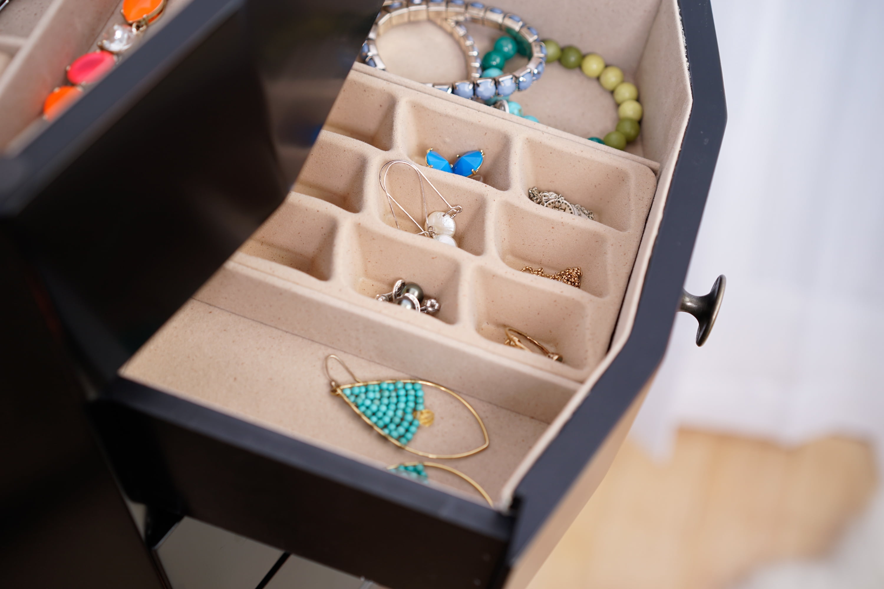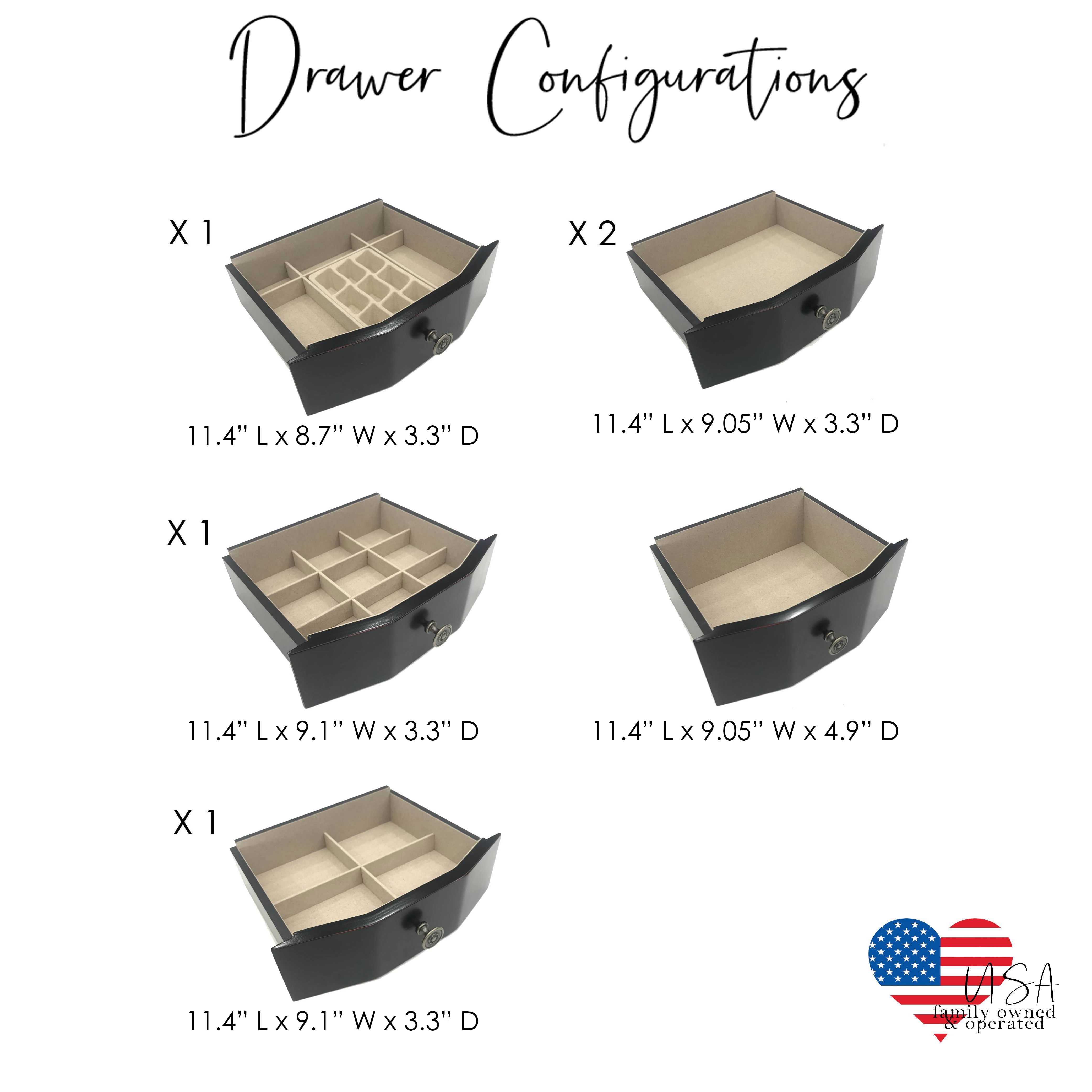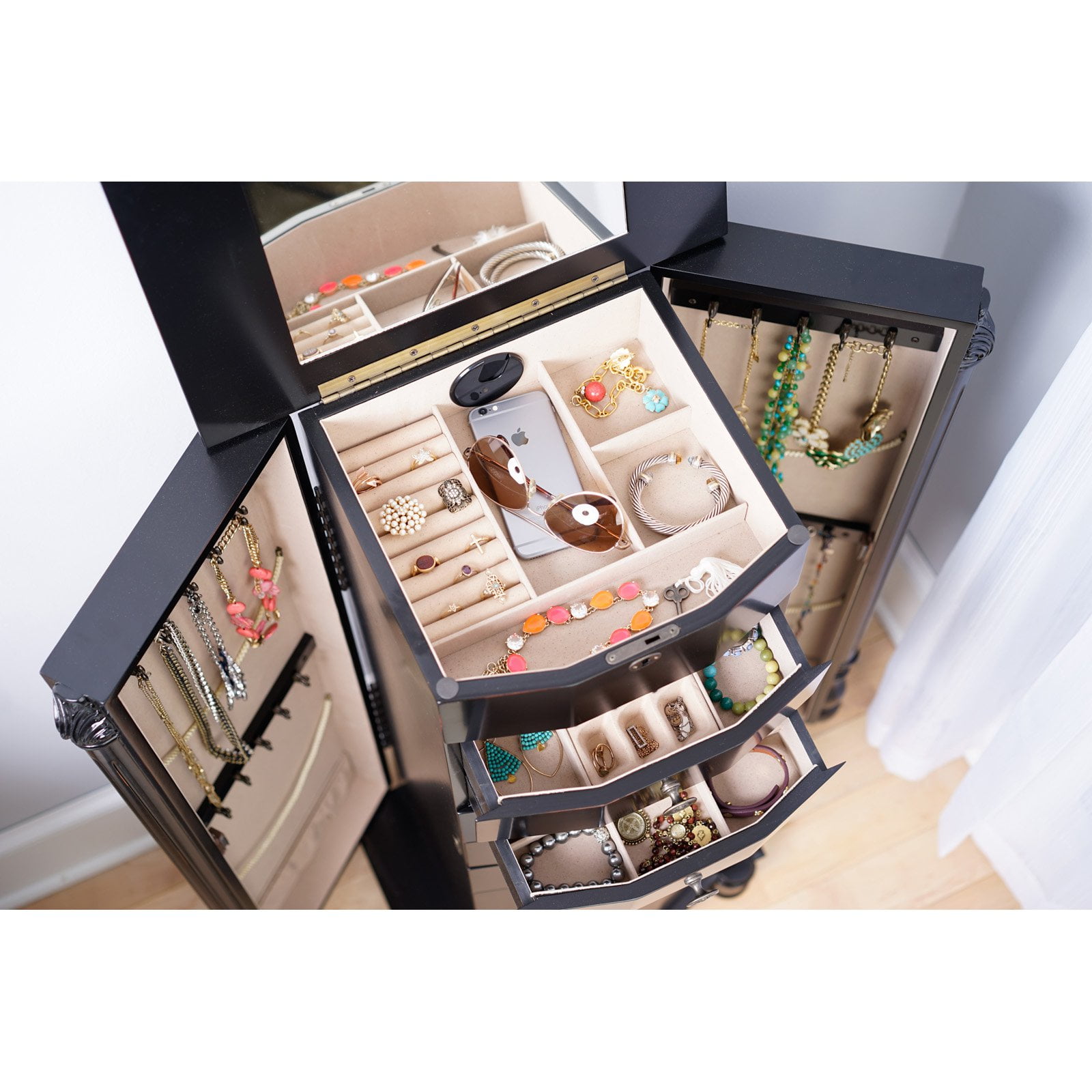 The Florence Walnut Jewelry Armoire is a Hives and Honey statement piece, standing confidently at nearly 40 inches tall. The Florence is sure to become your favorite piece in your home. The 8 drawers are lined and padded, with separated compartments to keep small items organized. Doors open on both sides to hold necklaces; each feature 10, double-tiered hooks. Locking the top lid allows you to safely hide away your prized possessions. The top opens to reveal a beautiful mirror with divided compartments and ring rolls. The black finish is applied by hand in a multiple-step process by a team of artisans. Not to mention, the top has locking functionality that opens to reveal a vanity mirror and a cord management hole, so you can get ready and listen to your playlist before going out.