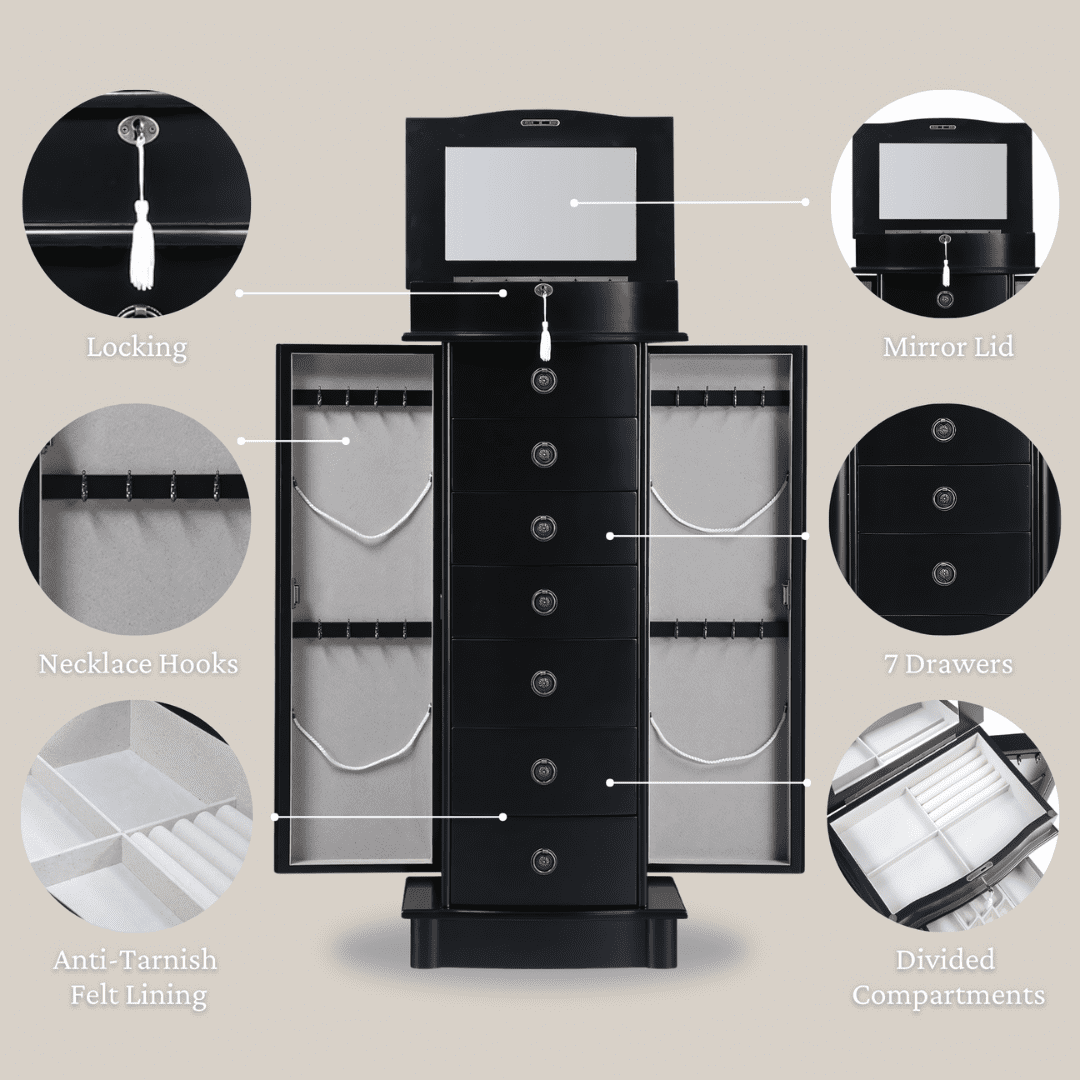Secure Top Locking Compartment: Provides peace of mind for your valuables. Seven Spacious Drawers: Versatile storage options for various jewelry types. Anti-Tarnish Felt Lining: Keeps your precious jewelry safe and in pristine condition. Convenient Vanity Mirror: Hinged lid opens to reveal a mirror for easy accessorizing. Organized Storage: Ring rolls and divided compartments for effortless organization. Tangle-Free Necklace Storage: Two side panel doors with eight double-prong hooks each. Traditional Style: Complements any home decor beautifully. Ample Storage Space: Perfect for rings, bracelets, earrings, and more.