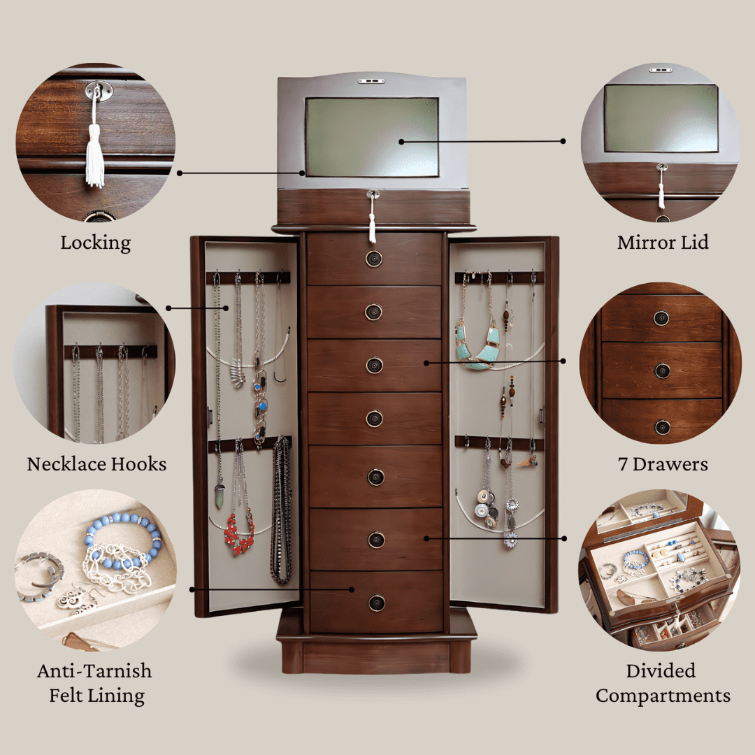 Secure Top Locking Compartment: Provides peace of mind for your valuables. Seven Spacious Drawers: Versatile storage options for various jewelry types. Anti-Tarnish Felt Lining: Keeps your precious jewelry safe and in pristine condition. Convenient Vanity Mirror: Hinged lid opens to reveal a mirror for easy accessorizing. Organized Storage: Ring rolls and divided compartments for effortless organization. Tangle-Free Necklace Storage: Two side panel doors with eight double-prong hooks each. Traditional Style: Complements any home decor beautifully. Ample Storage Space: Perfect for rings, bracelets, earrings, and more.