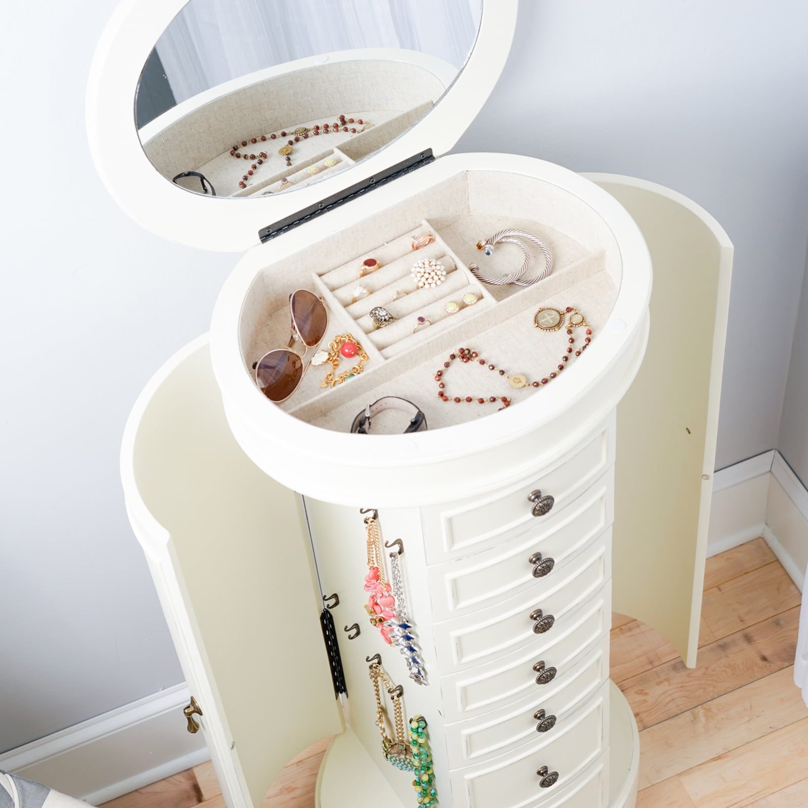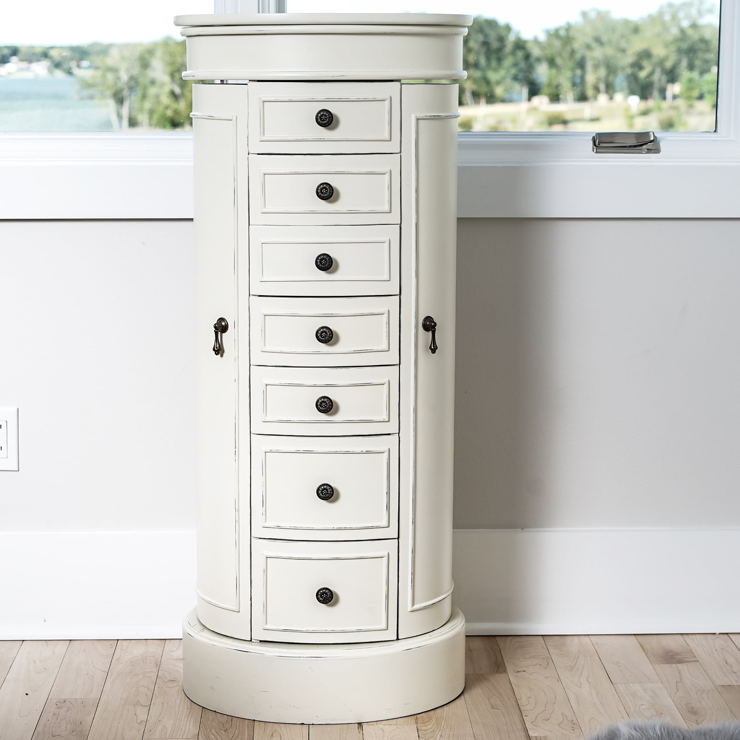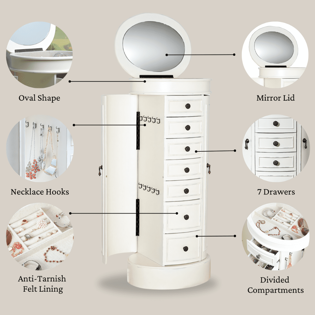 Strikingly unique oval shape. The hand-painted white finish is designed to achieve an antique appearance. 7 pull-out drawers, including 3 with divided compartments and 4 with open storage. Drawers are lined with anti-tarnish felt to protect your jewelry. Top lid compartment features a built-in vanity mirror. Built-in ring rolls in the top compartment. 10 double-prong necklace hooks in each side door. Product Dimensions: 18″ W x 13.75″ D x 41″ H