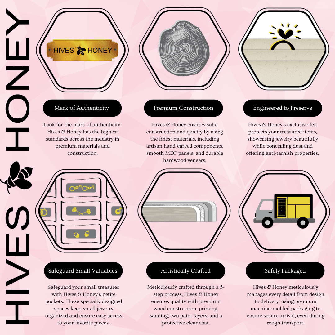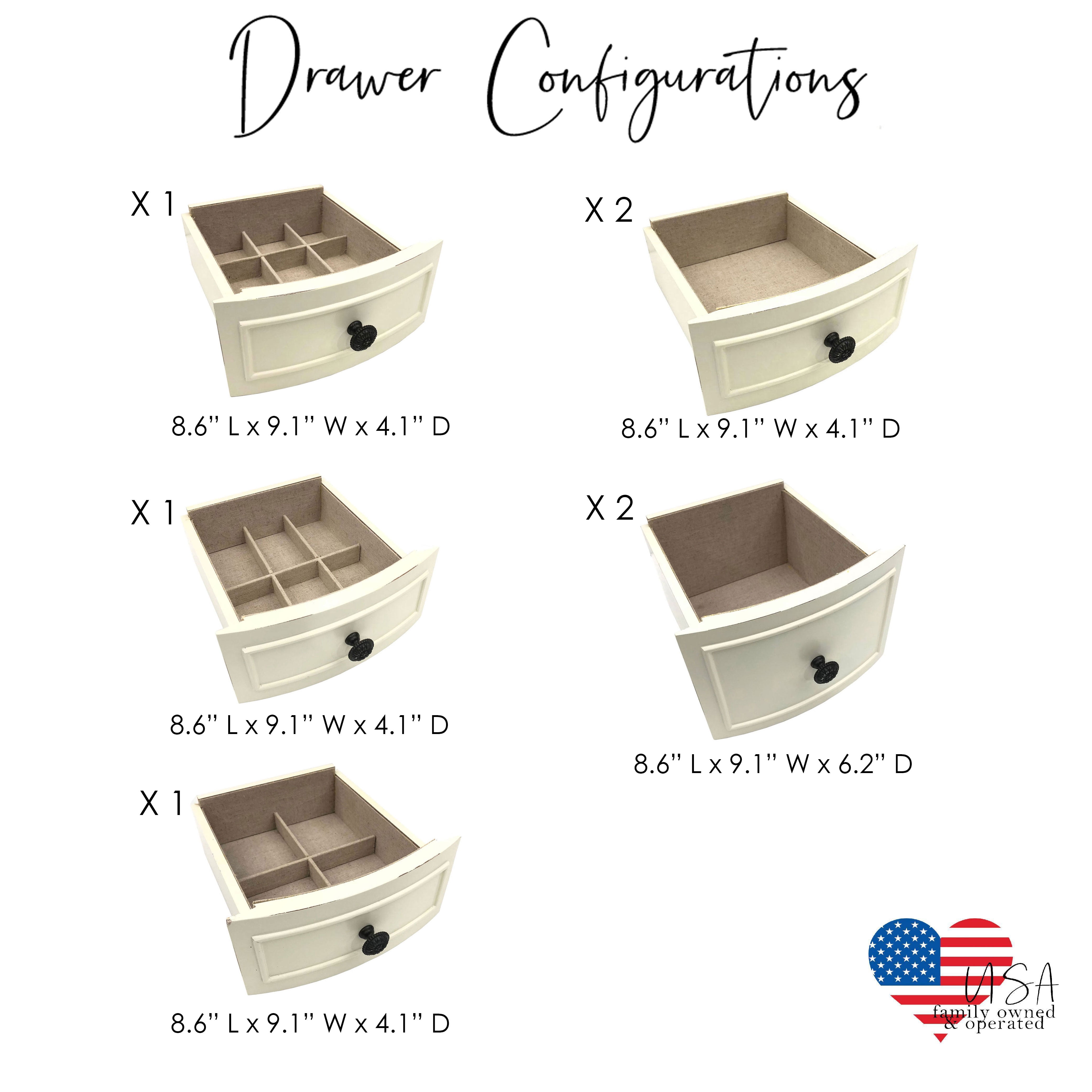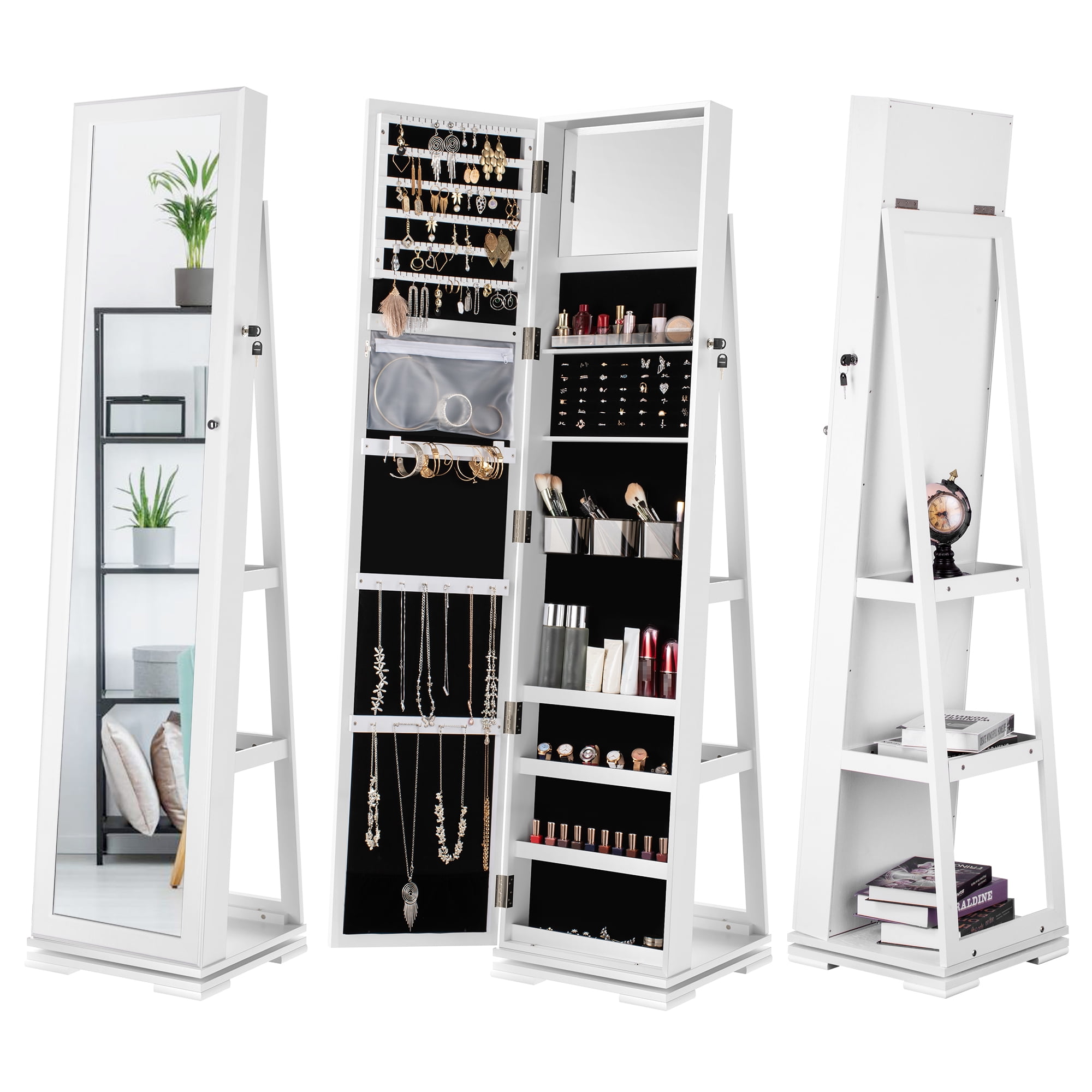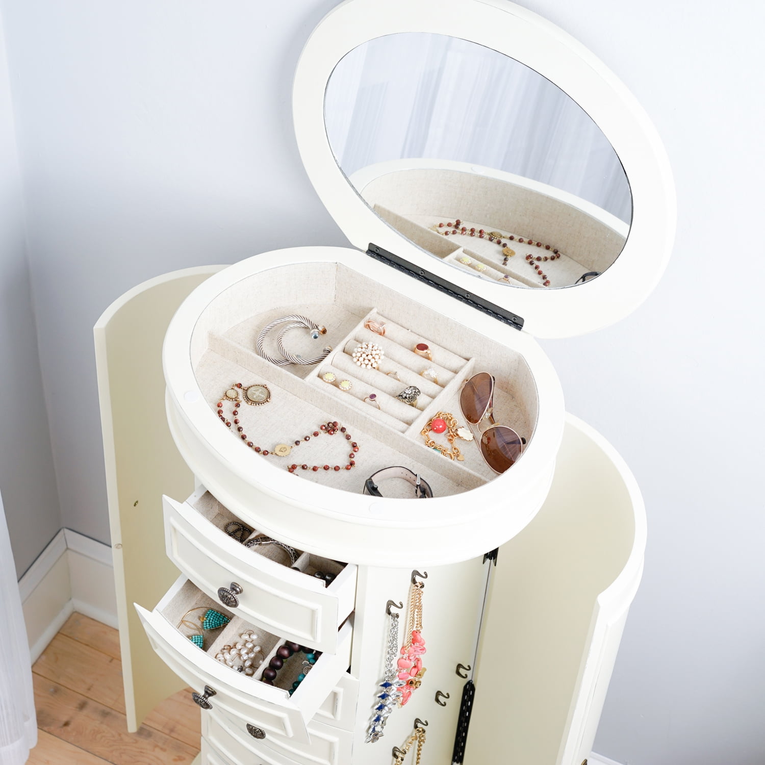 Strikingly unique oval shape. The hand-painted white finish is designed to achieve an antique appearance. 7 pull-out drawers, including 3 with divided compartments and 4 with open storage. Drawers are lined with anti-tarnish felt to protect your jewelry. Top lid compartment features a built-in vanity mirror. Built-in ring rolls in the top compartment. 10 double-prong necklace hooks in each side door. Product Dimensions: 18″ W x 13.75″ D x 41″ H