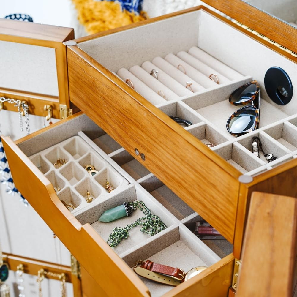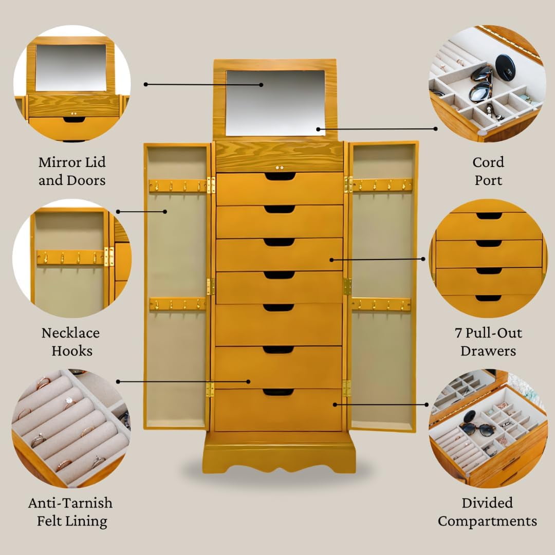 Elegant Design: Features mirrored French doors that add a touch of sophistication to any room. Ample Storage: Includes 7 spacious drawers to accommodate a variety of jewelry pieces. Necklace Organization: Each side door is equipped with 8 necklace hooks, perfect for keeping your necklaces tangle-free. Vanity Mirror and More: Open the top lid to reveal a vanity mirror, ring rolls, and additional storage compartments for easy access. Divided Compartments: Keep your jewelry collection neatly organized with thoughtfully designed compartments inside the drawers. Convenient Cord Management: A built-in port allows for easy storage and charging of electronic devices without messy wires. Protective Lining: Anti-tarnish felt lining ensures your jewelry stays pristine and protected. Compact Dimensions: Measures 40″ H x 18″ W x 13″ D, making it a perfect fit for various spaces.
