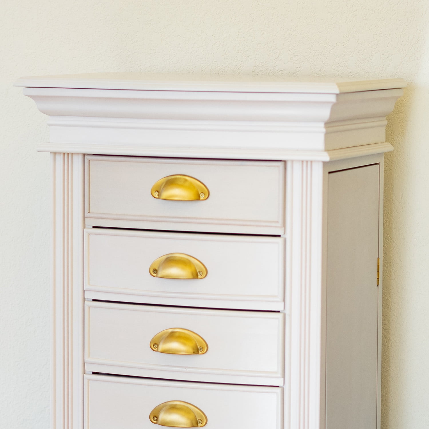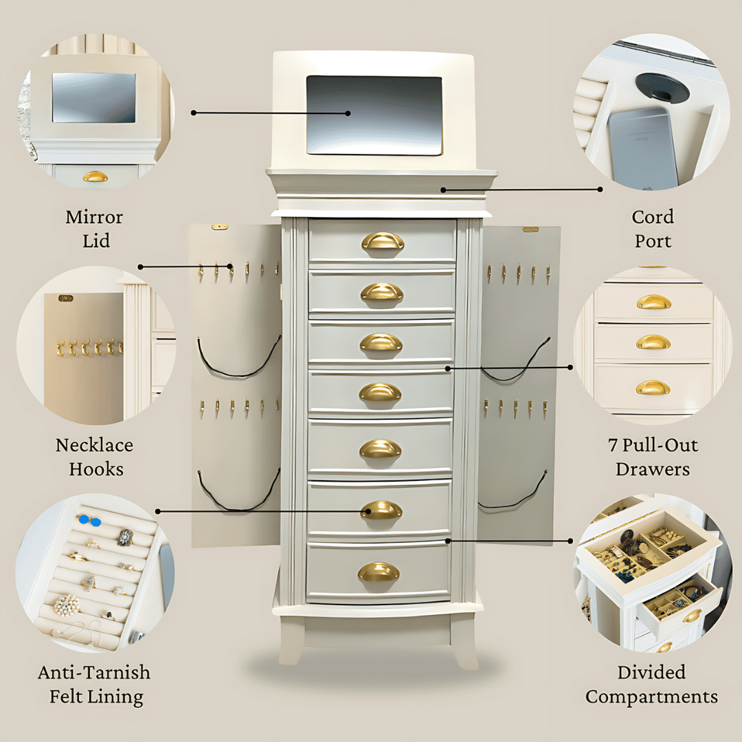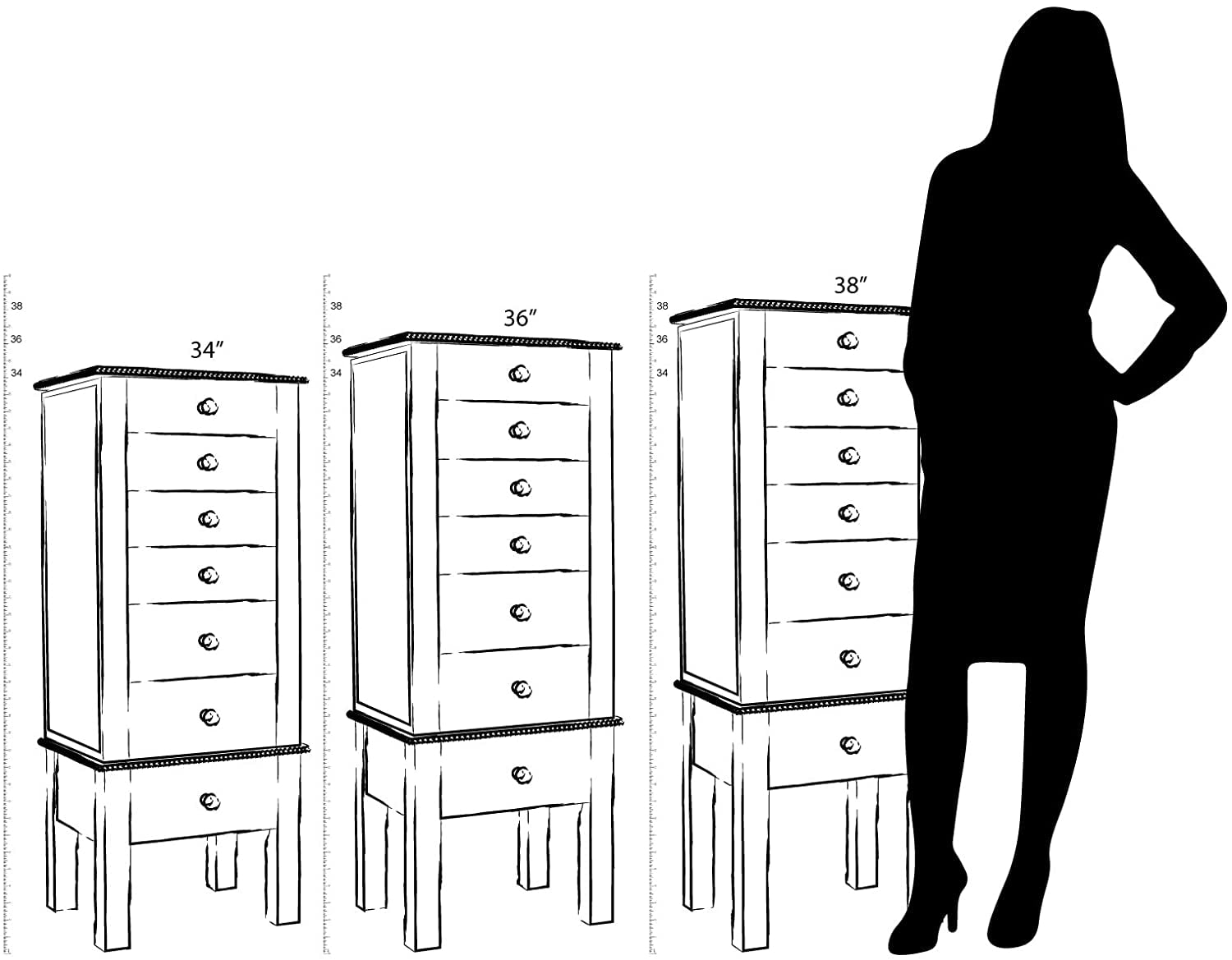 Open the top lid to reveal a mirror, divided compartments, and ring rolls. 12 double-prong necklace hooks on each side door. Antique finish with bronze shaker style hardware. 7 spacious drawers, 3 of which feature divided compartments. The 4 additional drawers provide open storage for larger items or accessories. Made of high-quality wood, high density fiberboard, and solid veneer. This armoire comes practically fully assembled, with only the feet needing to be screwed on. Drawers and lid are fully lined with anti-tarnish felt. Item dimensions: 18″ W x 12″ D x 40″ H