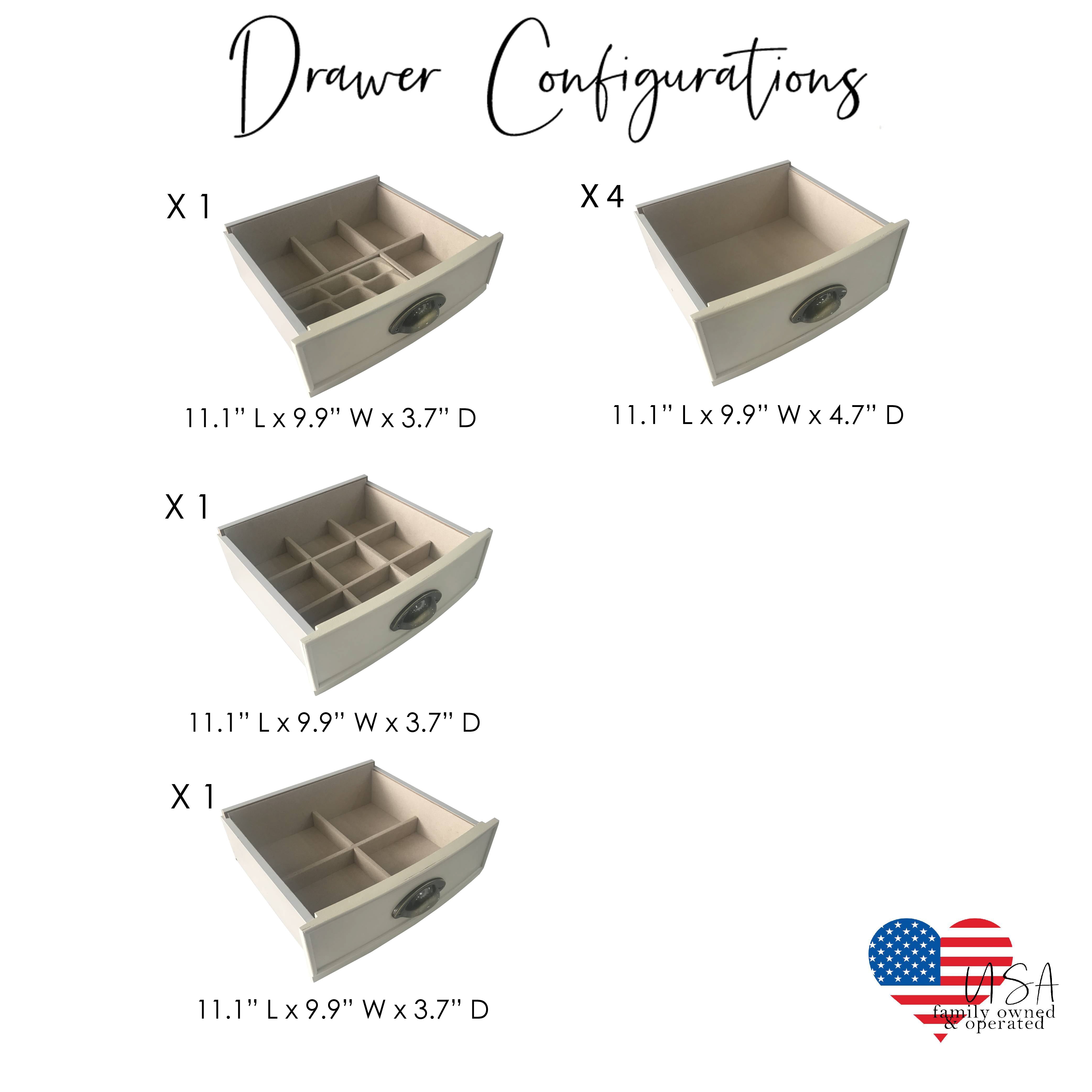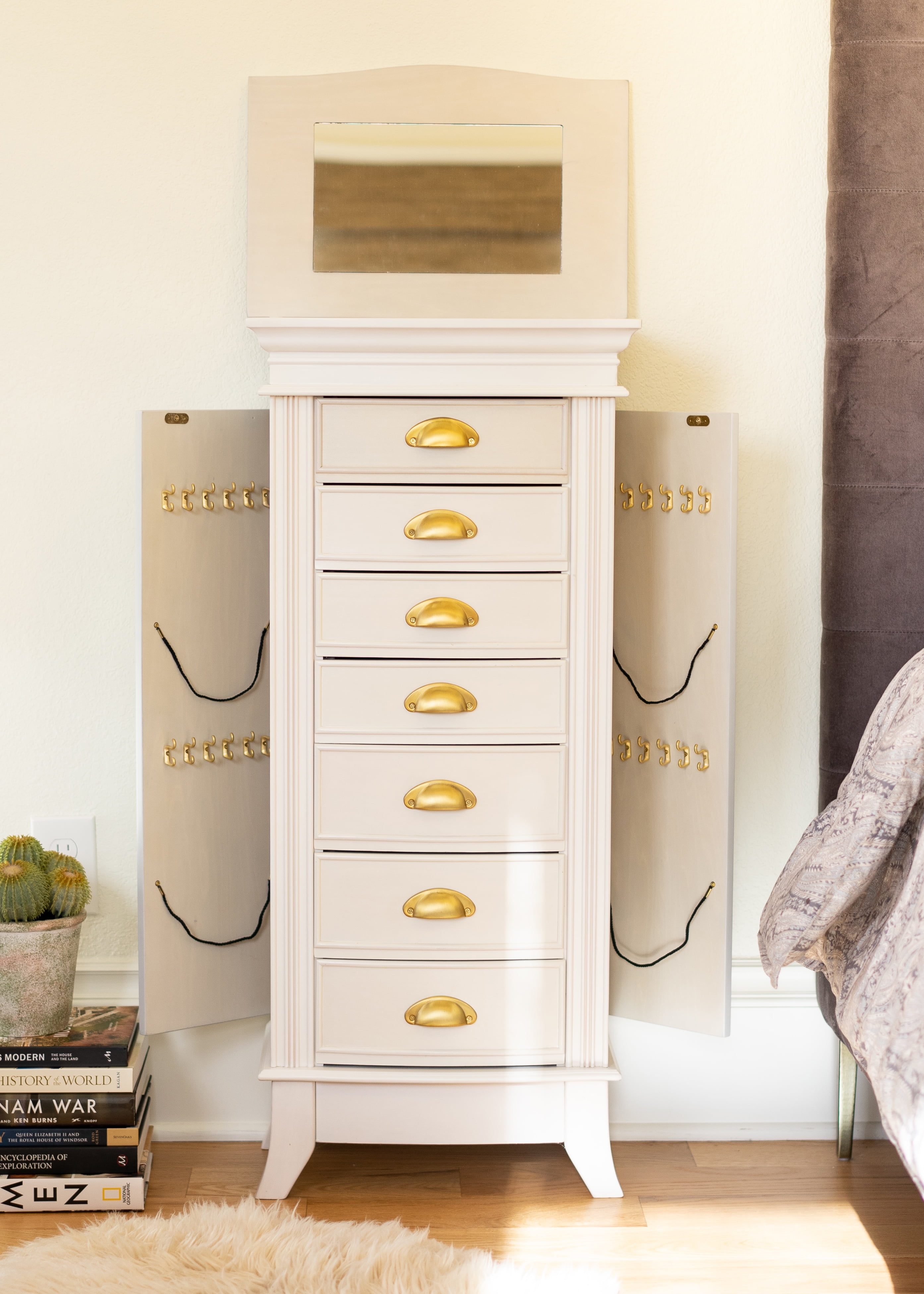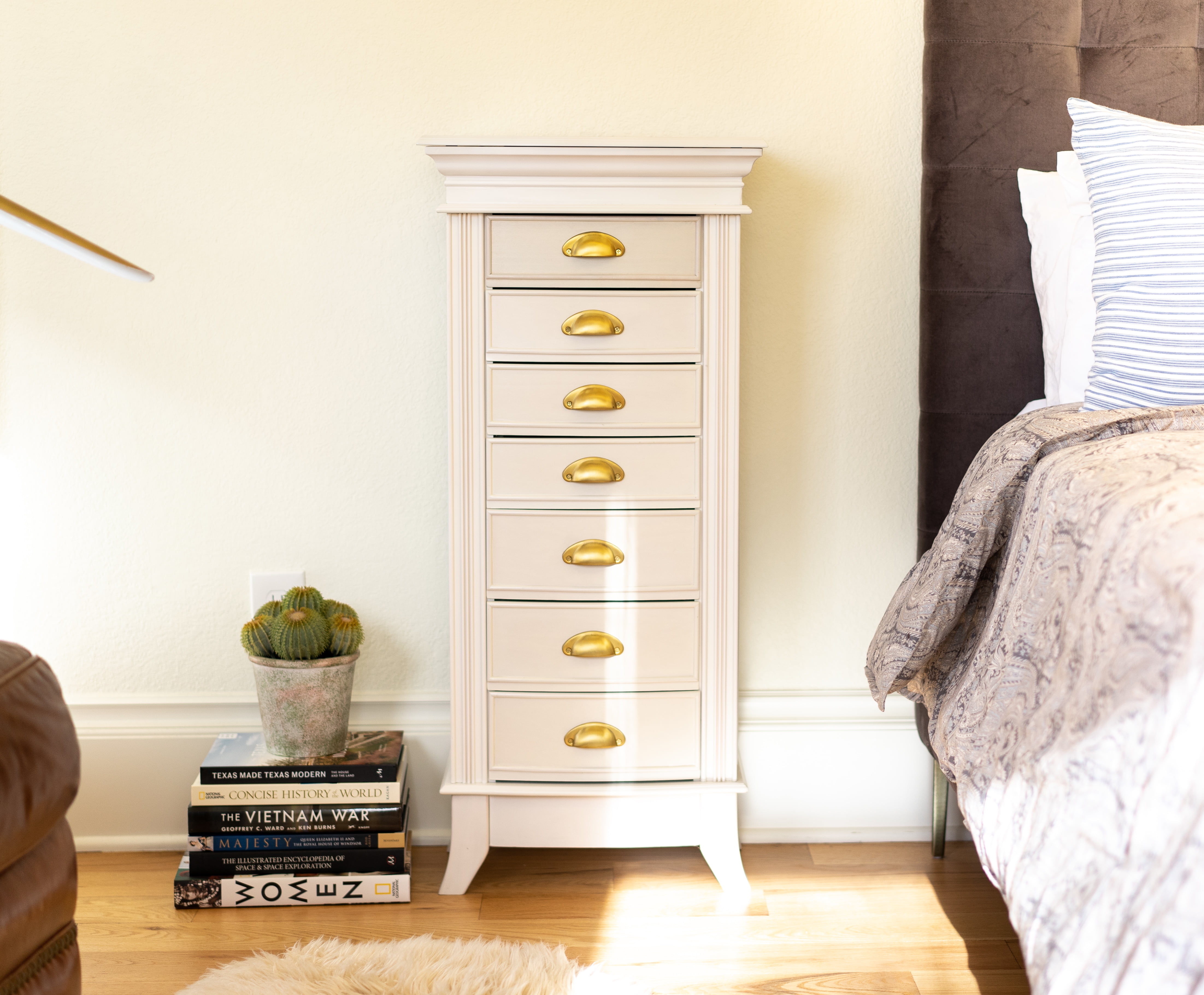 Open the top lid to reveal a mirror, divided compartments, and ring rolls. 12 double-prong necklace hooks on each side door. Antique finish with bronze shaker style hardware. 7 spacious drawers, 3 of which feature divided compartments. The 4 additional drawers provide open storage for larger items or accessories. Made of high-quality wood, high density fiberboard, and solid veneer. This armoire comes practically fully assembled, with only the feet needing to be screwed on. Drawers and lid are fully lined with anti-tarnish felt. Item dimensions: 18″ W x 12″ D x 40″ H