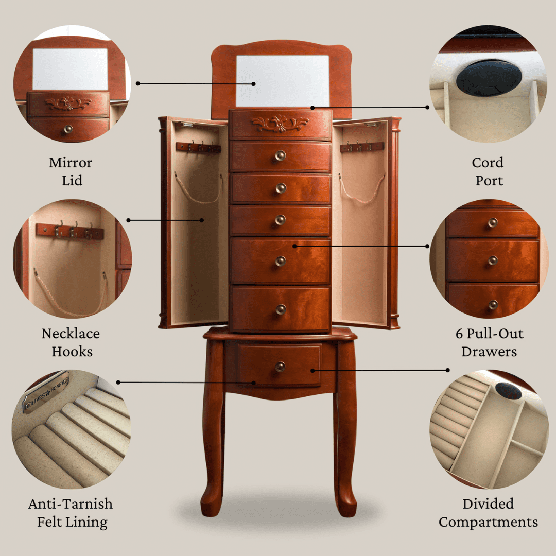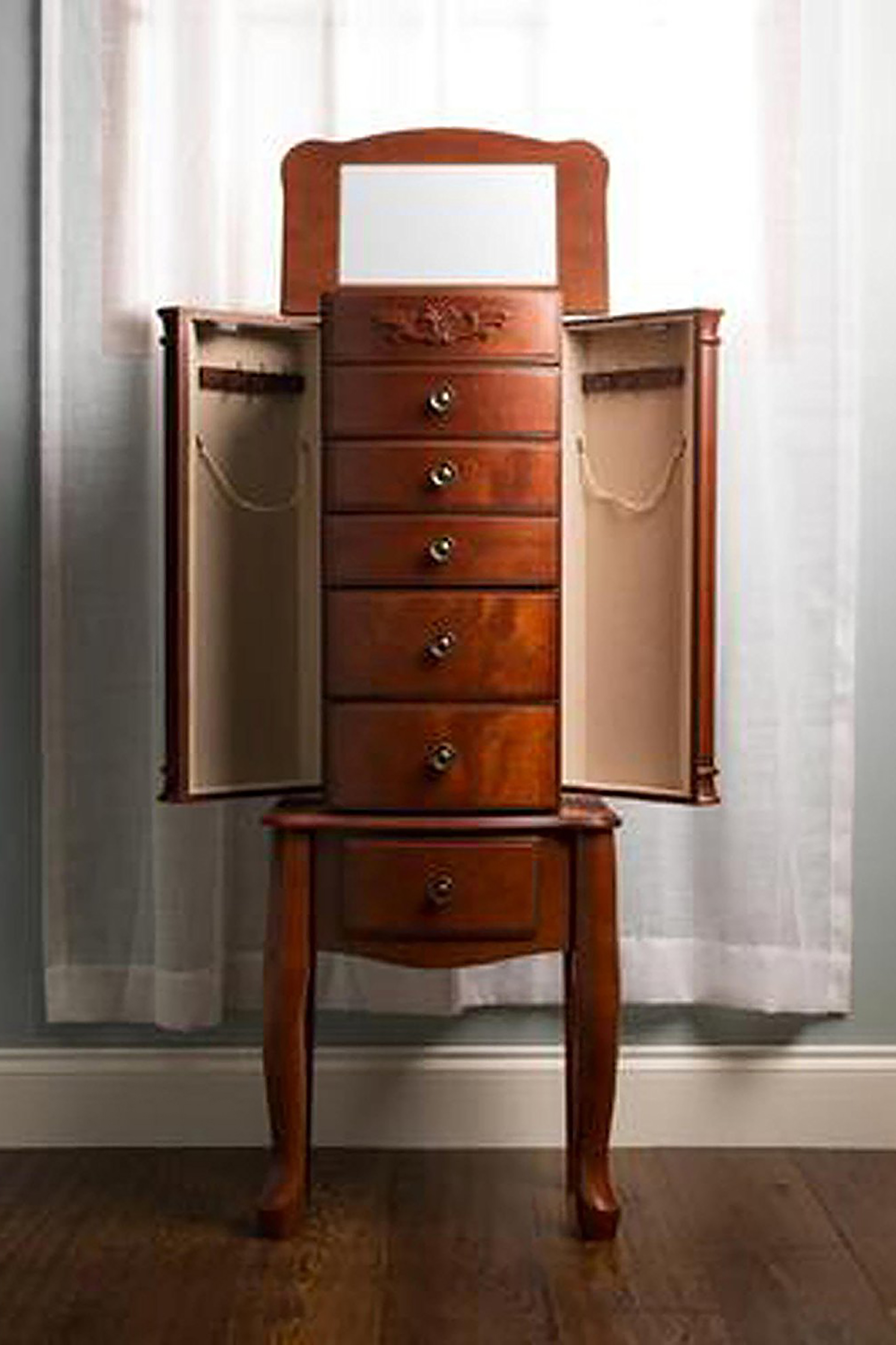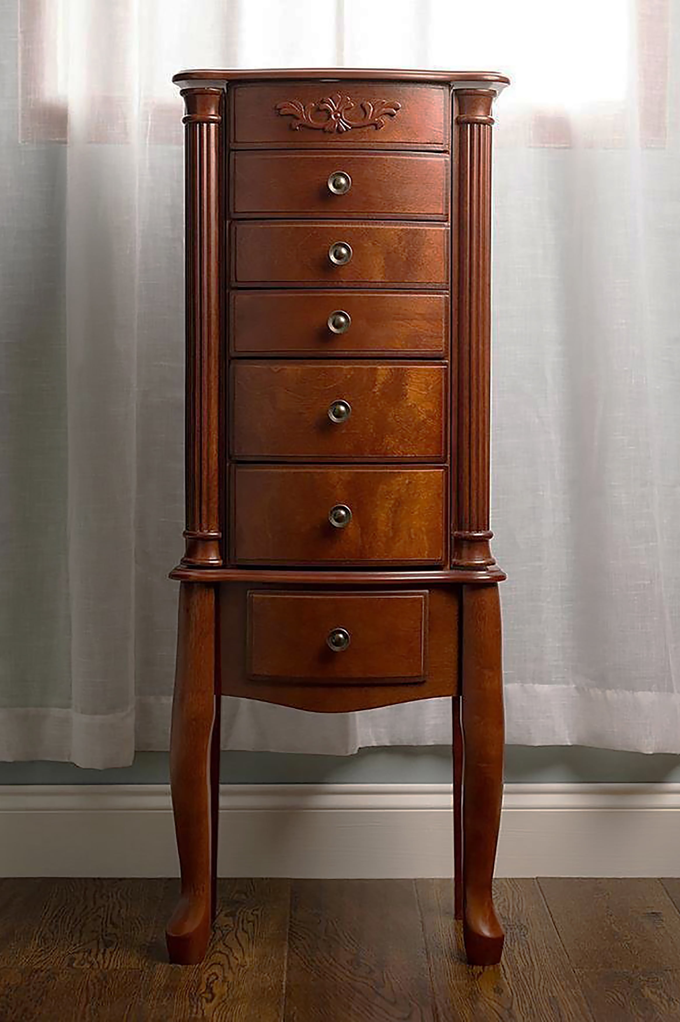 Add a Neoclassical touch to your room with the Morgan 6 Drawer Jewelry Armoire Stand. This jewelry armoire has a little something for everyone; starting with its auburn cherry finished wood hand applied in a multi-step process. Then structurally this jewelry armoire was created with the perfect touches â vertically grooved ‘columns and corbelsâ carved into the corners of the armoire, stunning bronze hardware, rounded feet and a beautiful carved raised detail in the center. Open the rounded lid to find a top compartment that includes a vanity mirror, multiple ring rolls, divided compartments and technology hole for cord management. Facing the front of the jewelry armoire are six pull out drawers fully lined with a plush anti-tarnish felt. The storage options are unique â two drawers are complete with divided compartments while three include open storage âideal for clutches, beauty accessories and mementos. The Morgan Jewelry Armoire is quaint enough for any space but packed with storage possibilities.