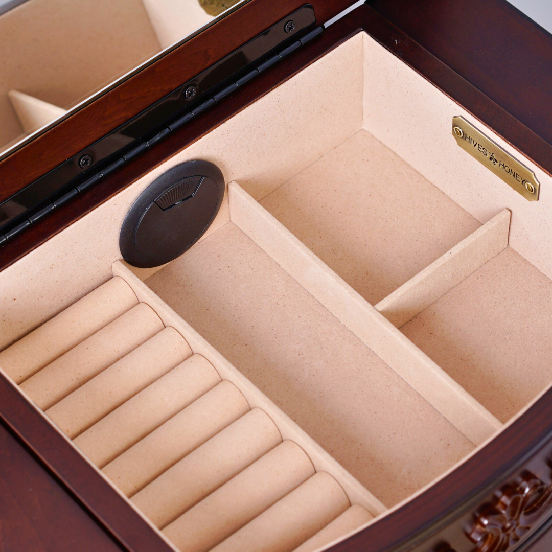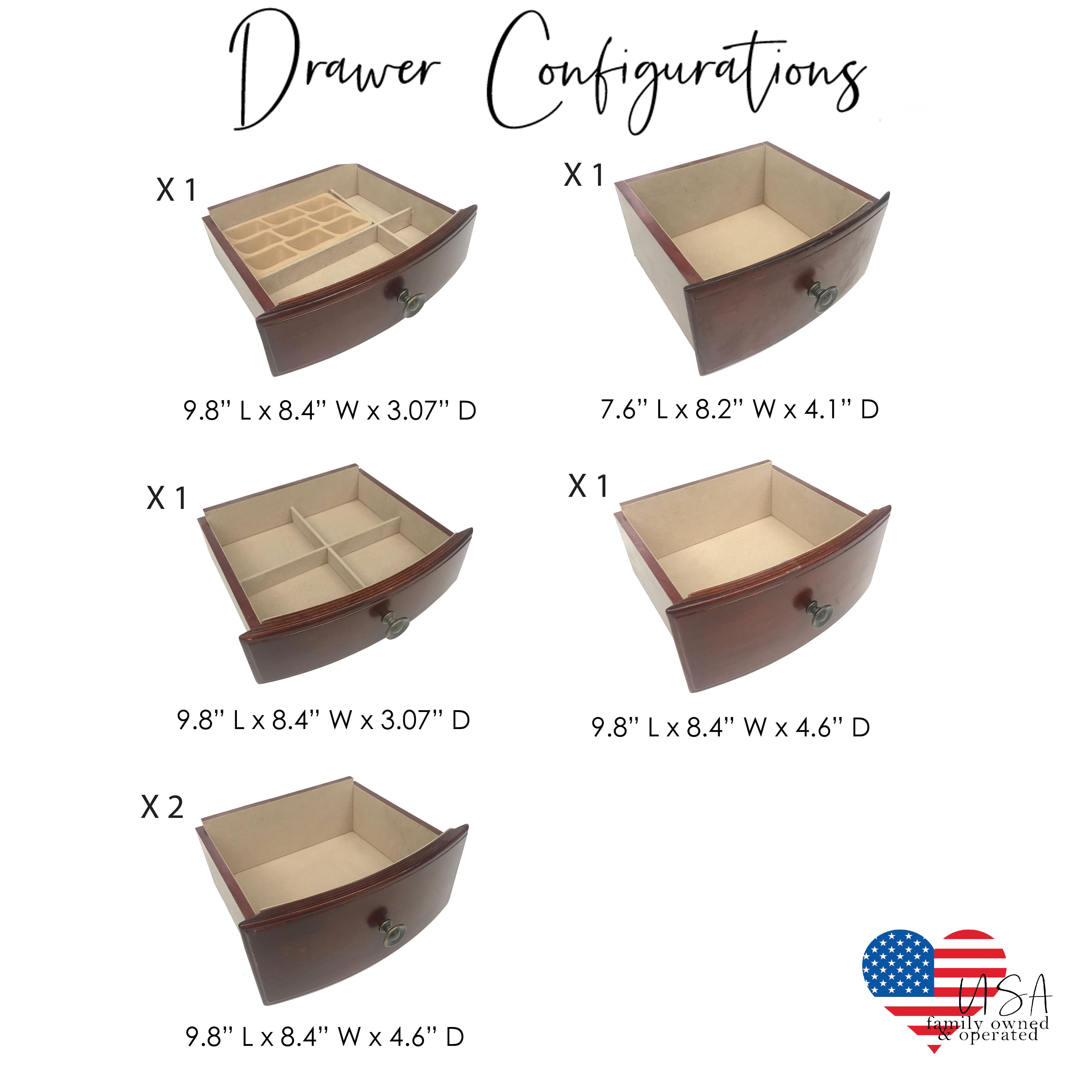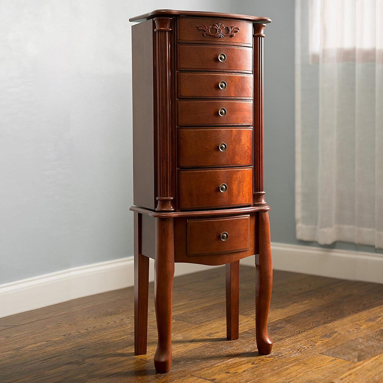 Add a Neoclassical touch to your room with the Morgan 6 Drawer Jewelry Armoire Stand. This jewelry armoire has a little something for everyone; starting with its auburn cherry finished wood hand applied in a multi-step process. Then structurally this jewelry armoire was created with the perfect touches â vertically grooved ‘columns and corbelsâ carved into the corners of the armoire, stunning bronze hardware, rounded feet and a beautiful carved raised detail in the center. Open the rounded lid to find a top compartment that includes a vanity mirror, multiple ring rolls, divided compartments and technology hole for cord management. Facing the front of the jewelry armoire are six pull out drawers fully lined with a plush anti-tarnish felt. The storage options are unique â two drawers are complete with divided compartments while three include open storage âideal for clutches, beauty accessories and mementos. The Morgan Jewelry Armoire is quaint enough for any space but packed with storage possibilities.
