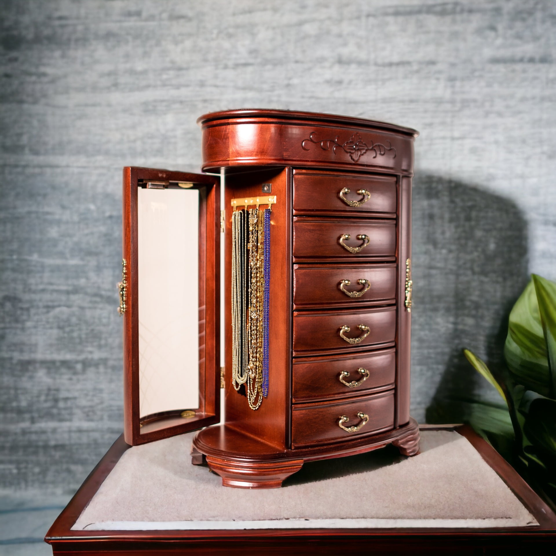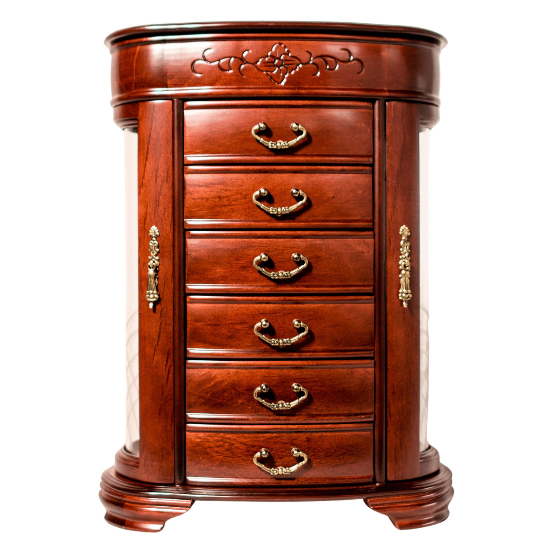 This True Heirloom Chest might be the largest jewelry box you can find. It features amazing details in the wood wook and tons of functional storage for your entire collection! Store your jewels and baubles in any of the six drawers or hang your necklaces behind the etched glass side doors. You will also fine a smartly organized top compartment complete with a full size mirror.
