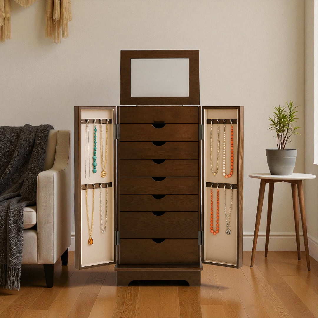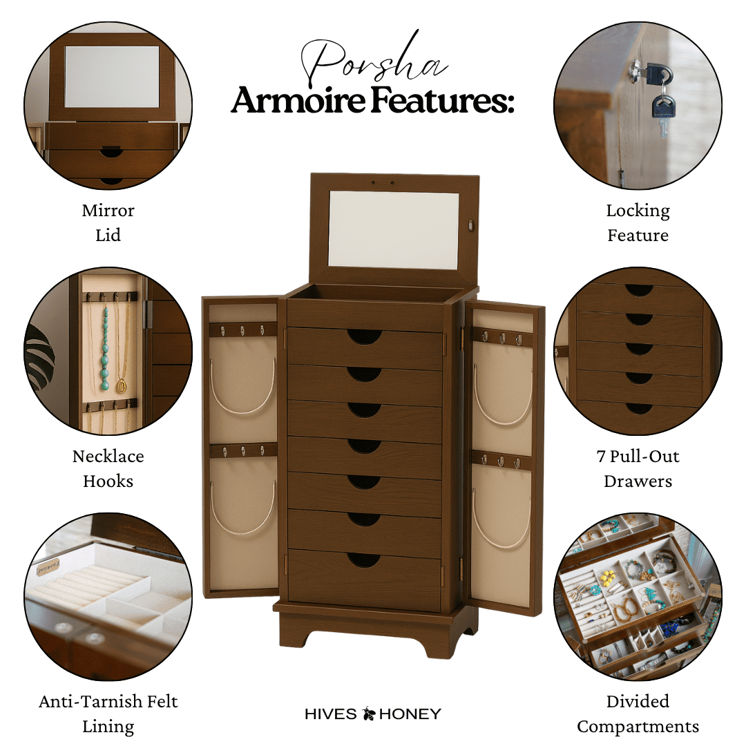 Hives & Honey Port Elegant Chocolate Jewelry Armoire: Freestanding, Lockable Wooden Cabinet for Women