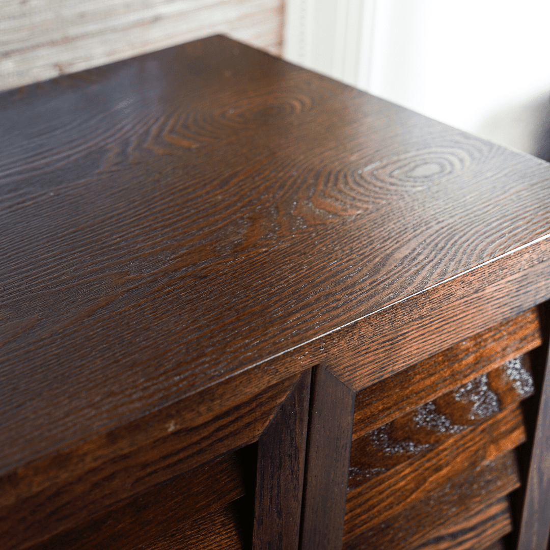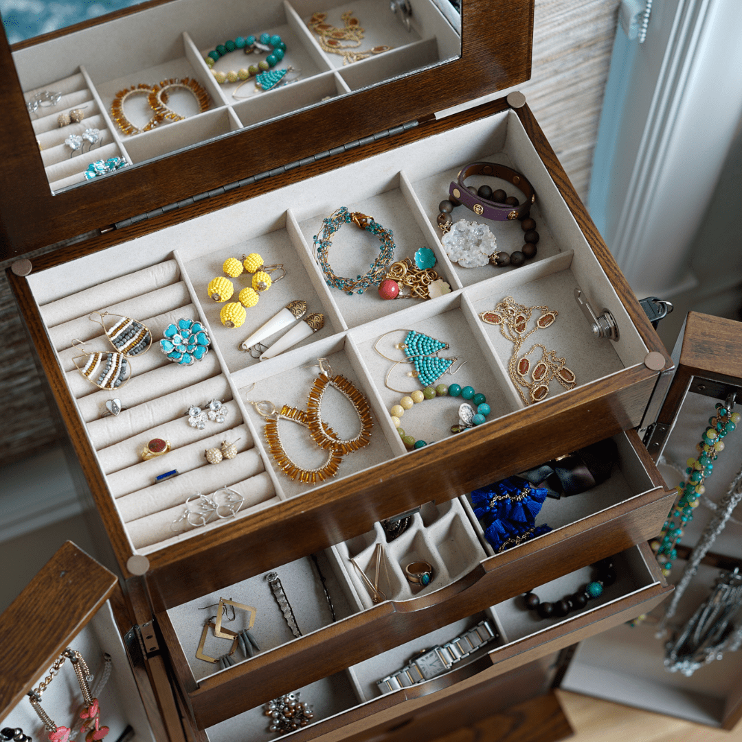 Made of solid wood veneer for durability Shutter doors with gold hardware for style Lockable for security Seven drawers for ample storage Divided compartments and open storage areas Includes hooks, rolls, and tray for organizing different jewelry types Built-in vanity mirror under the lid Anti-tarnish felt lining to protect jewelry