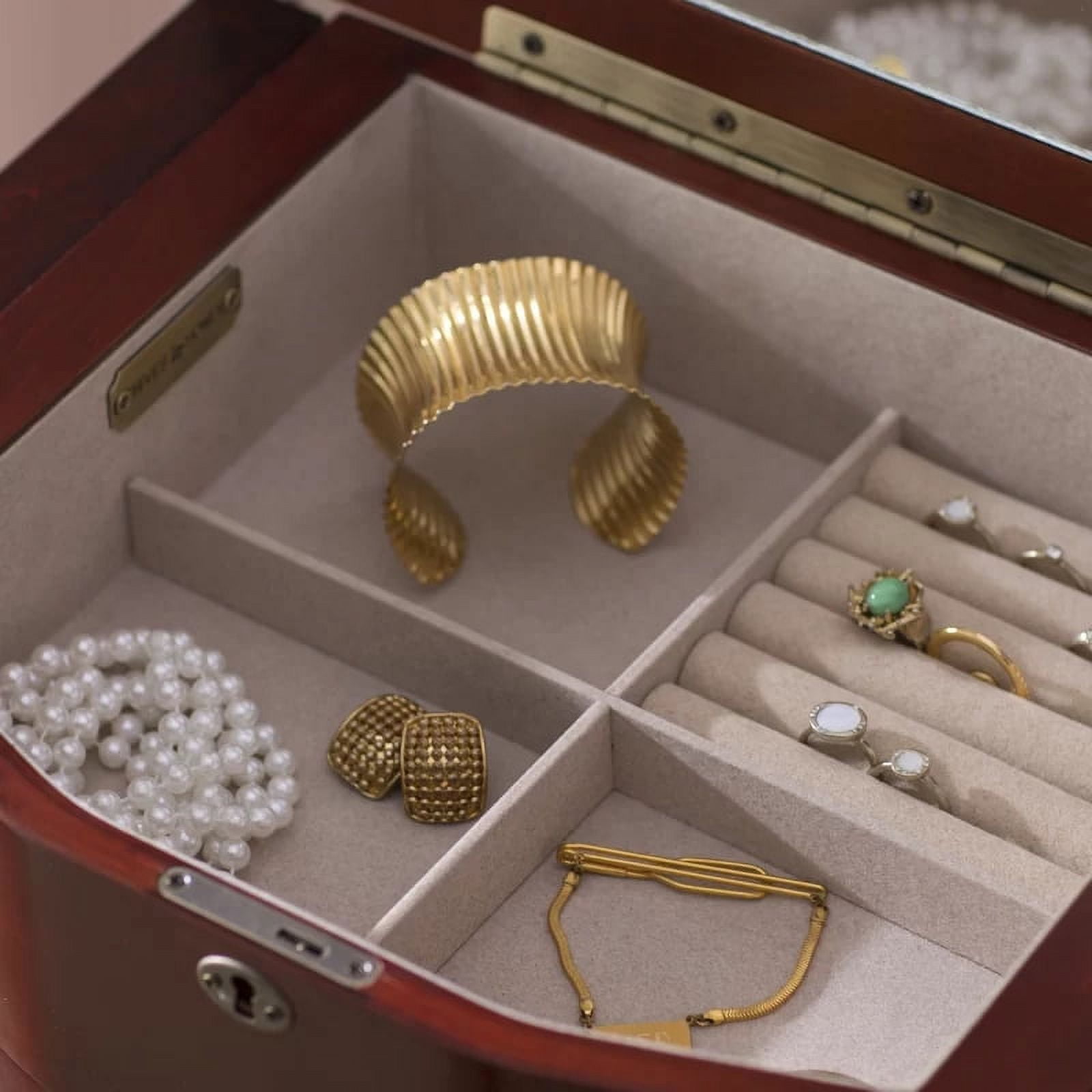 Elevate your jewelry collection with the timeless beauty of the Raelynn Jewelry Armoire. Boasting a classic design, this armoire features 8 drawers that offer generous space for your necklaces, bracelets, earrings, and more. The top compartment opens to reveal a vanity mirror, ring rolls, and divided compartments for easy access to your everyday essentials. Crafted with attention to detail, the stunning bronze hardware adds a touch of sophistication to its streamlined silhouette. Inspired by Dutch design, the curved front exudes elegance and grace. Plus, the lockable feature ensures that your precious pieces are kept safe and secure. Experience the perfect harmony of style and functionality with the Raelynn Jewelry Armoire.