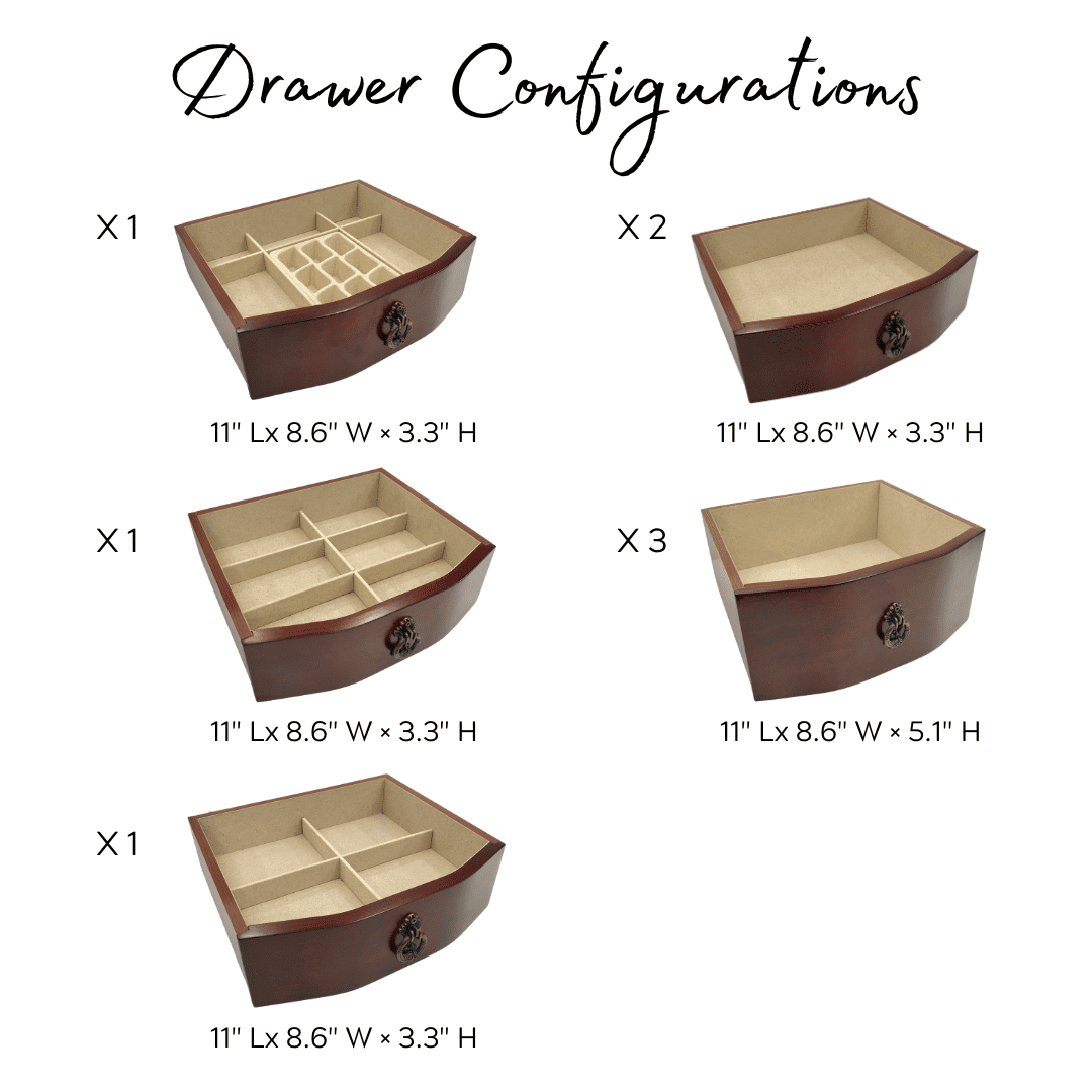 Elegant Design: Top compartment opens to reveal a vanity mirror, ring rolls, and divided compartments for organized storage. Secure Storage: Features a locking mechanism to keep your precious jewelry safe and secure. Dutch-Inspired Aesthetics: Curved front, streamlined design, and stunning bronze hardware evoke classic Dutch elegance. Quality Construction: Made from solid wood, high-density fiberboard, and solid wood veneers for durability. Convenient Organization: Includes 6 double-prong necklace hooks inside each door, with ropes to keep necklaces in place. Ample Storage: Offers 8 drawers—3 with divided storage and 5 with open storage options. Protective Lining: Lined with anti-tarnish felt to keep your jewelry in pristine condition. Hassle-Free Setup: Arrives fully assembled, ready to use. Compact Dimensions: Measures 9” D x 14” W x 38” H, perfect for any space.
