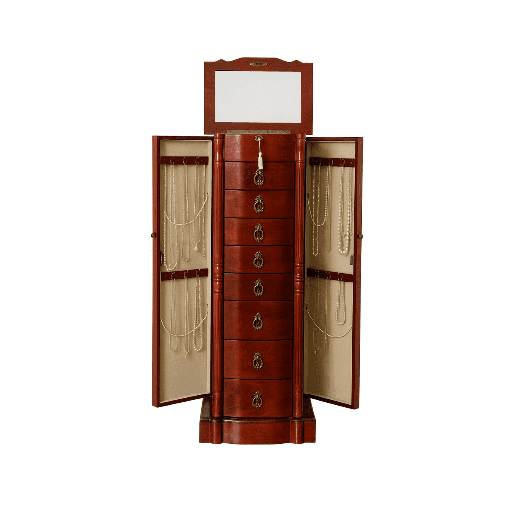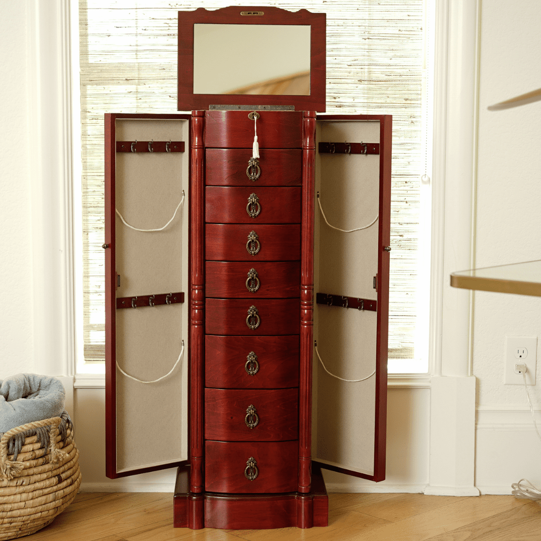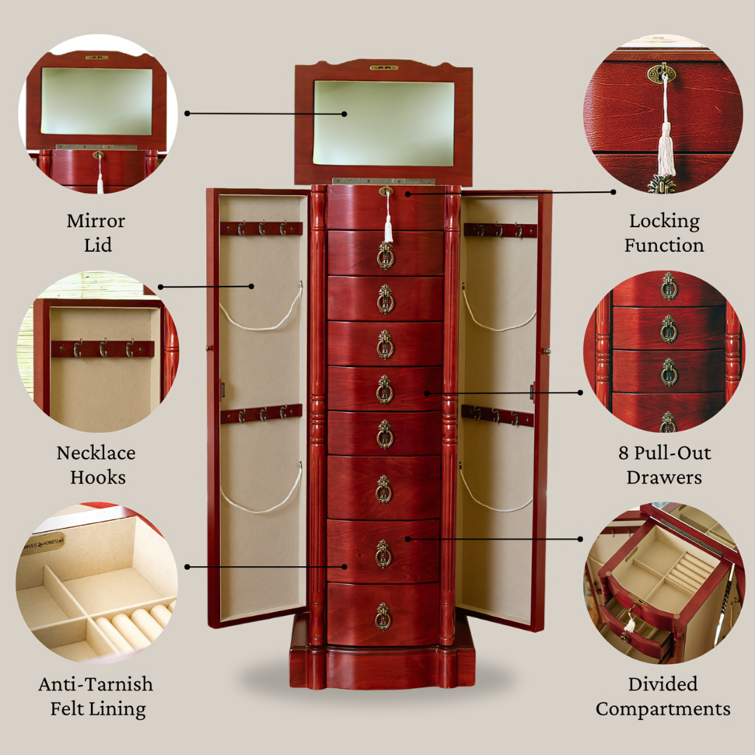 Hives & Honey – Raelynn Jewelry Armoire: Classic 8-Drawer Design with Vanity Mirror & Lockable Security, Cherry