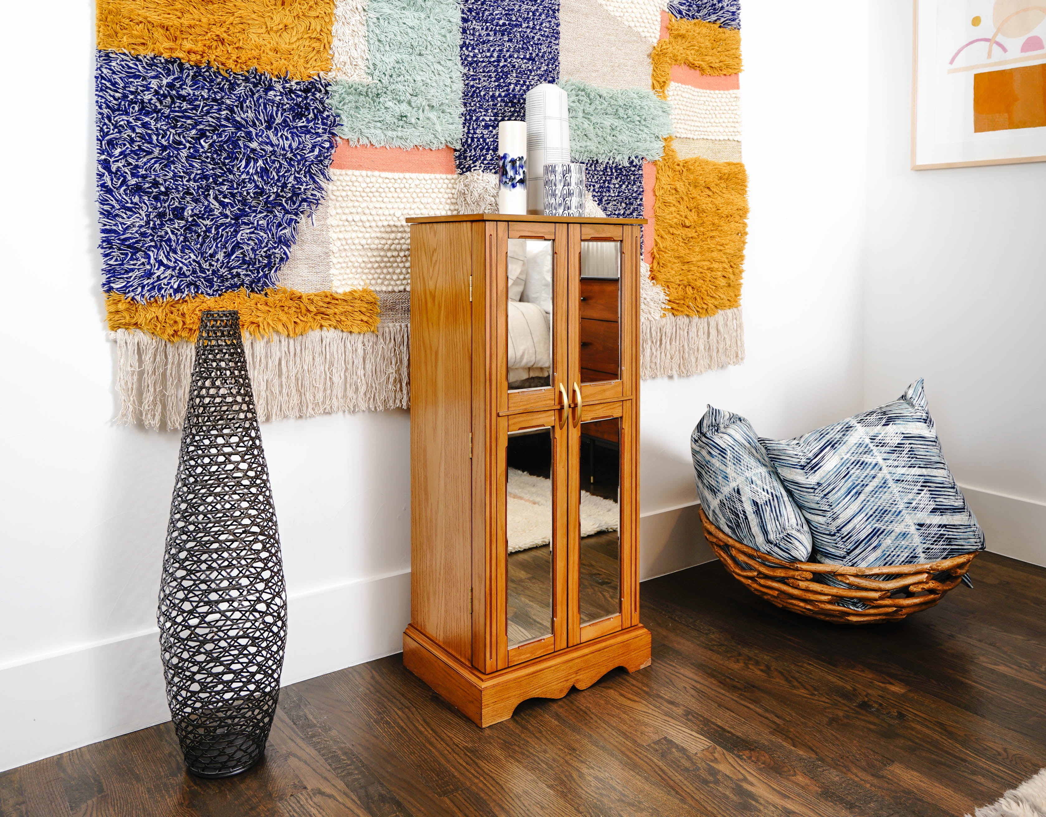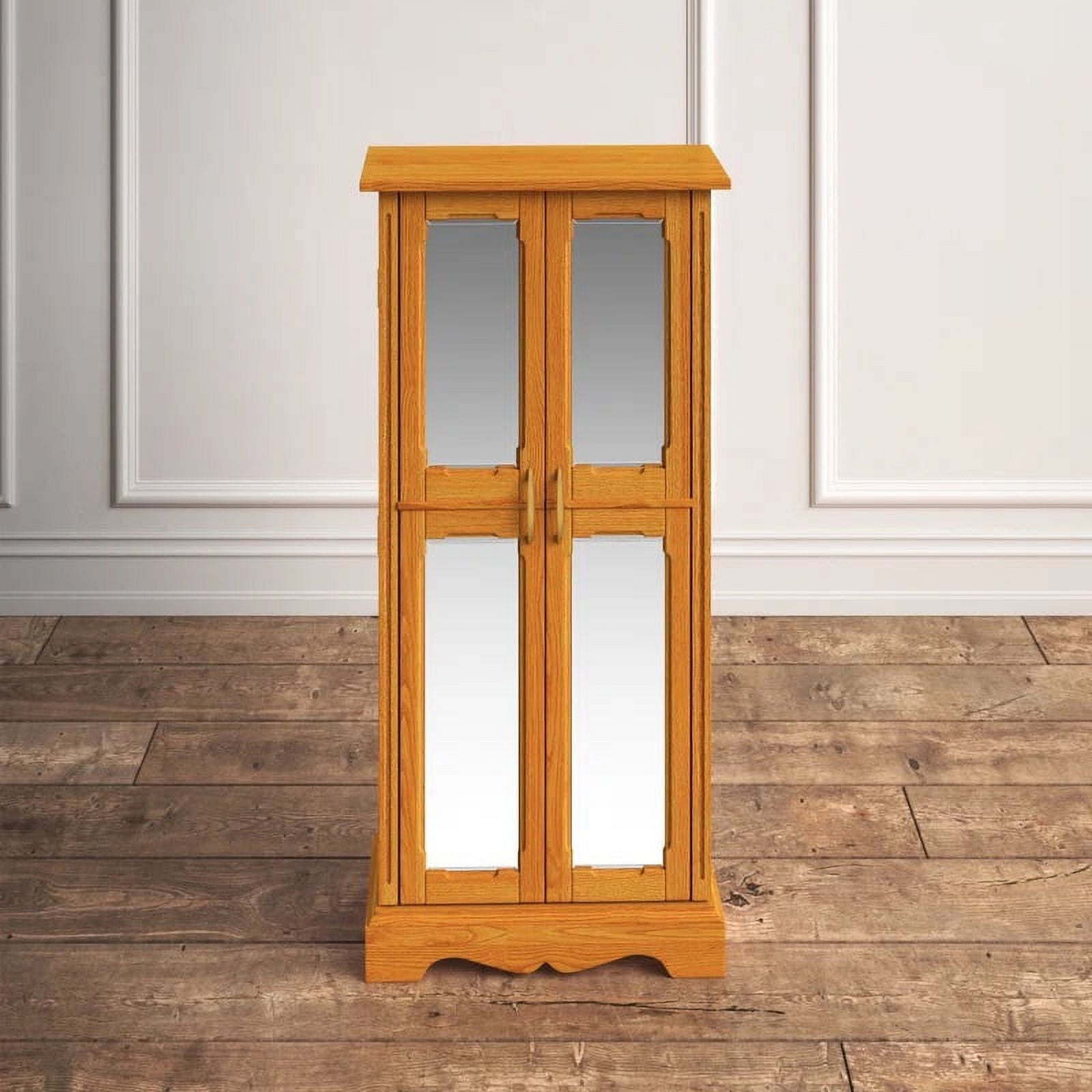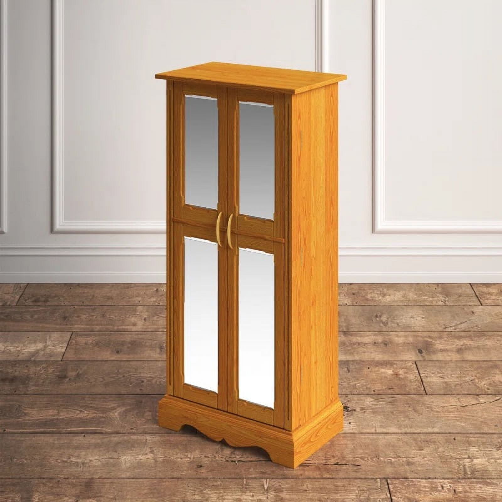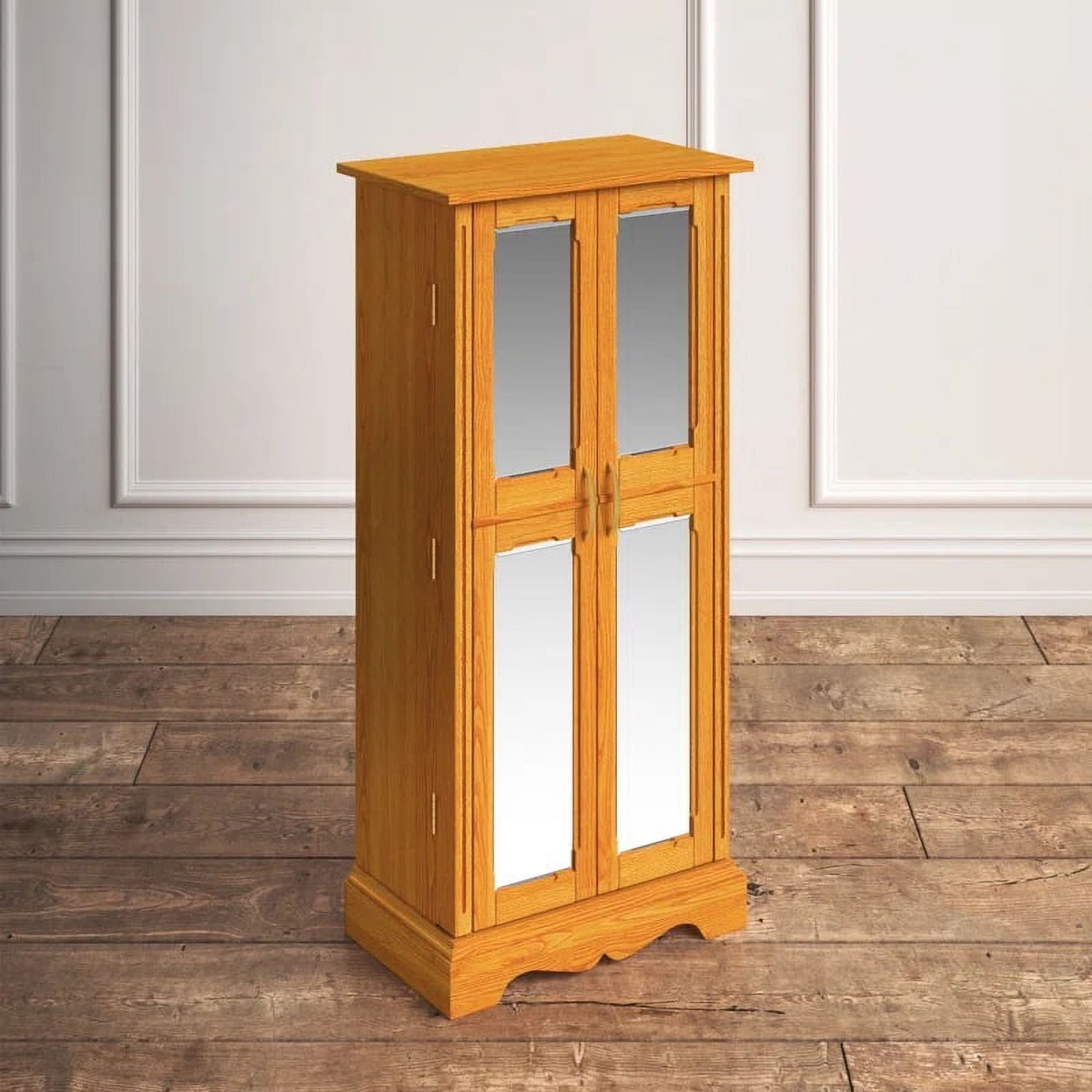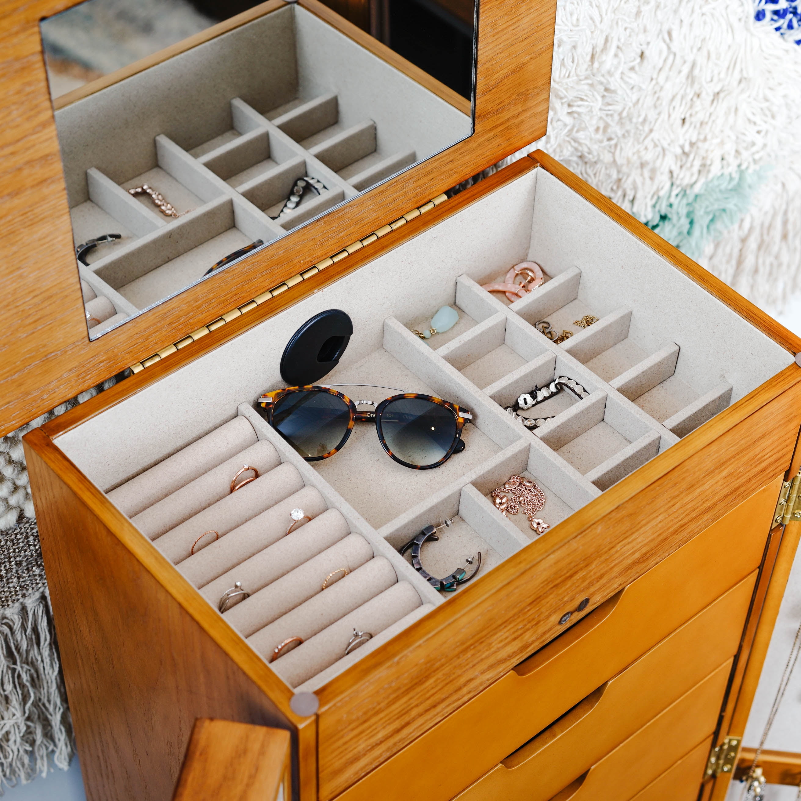 Mirrored cabinet doors 7 drawers 8 necklace hooks in each door Open the top lid of the armoire and be greeted by a vanity mirror, ring rolls, and additional storage compartments The cord management hole keeps charging cables out of sight Anti-tarnish felt lining Product Dimensions 40″ H x 18″ W x 13″ D