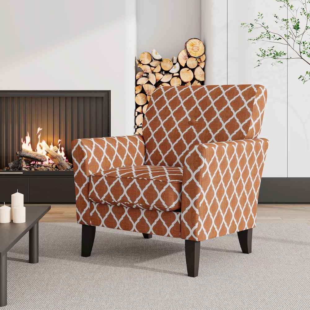 Alex Transitional Flared Arm Armchair in Orange Trellis Elevate your living space with our transitional flared arm armchair. Upholstered in an orange trellis fabric, the chair features a striking pattern that adds a touch of modern sophistication to your interior. This armchair combines sophisticated style with exceptional comfort, making it a perfect addition to any room. The flared arms and clean lines create a transitional silhouette that seamlessly blends with both traditional and contemporary décor. Covered in an easy to clean and maintain, 100% polyester trellis pattern, the chair offers a striking and inviting texture, adding a touch of opulence to your interior. The generously padded seat and backrest provide superior comfort and support, making it an ideal spot for relaxation, reading, or entertaining guests. Built with a sturdy wood frame and solid wood legs, tapered in front and angled in back, this armchair ensures long-lasting stability and durability. Perfect for living rooms, bedrooms, or home offices, this armchair adds a touch of elegance and comfort to any space. Seat Dimensions: 19.5 in. H x 21 in. W x 20 in. D Engineered mixed hardwood frame construction Tight square back with diamond-shaped button and removable seat cushion Solid wood legs in a dark brown finish for strength and style Conveniently designed, this chair includes all necessary hardware and clear step-by-step instructions for easy assembly Seats up to 300 lbs. – Number of Pieces: 1 – Collection: Alex – Item Depth: 32 – Item Height: 36 – Item Width: 32.5 – Item Weight: 39.6 – Package Includes: 1 Armchair – Outdoor (Y/N): No – Item Material: Wood, plywood, fabric, polyester, foam – Vendor Color: Orange