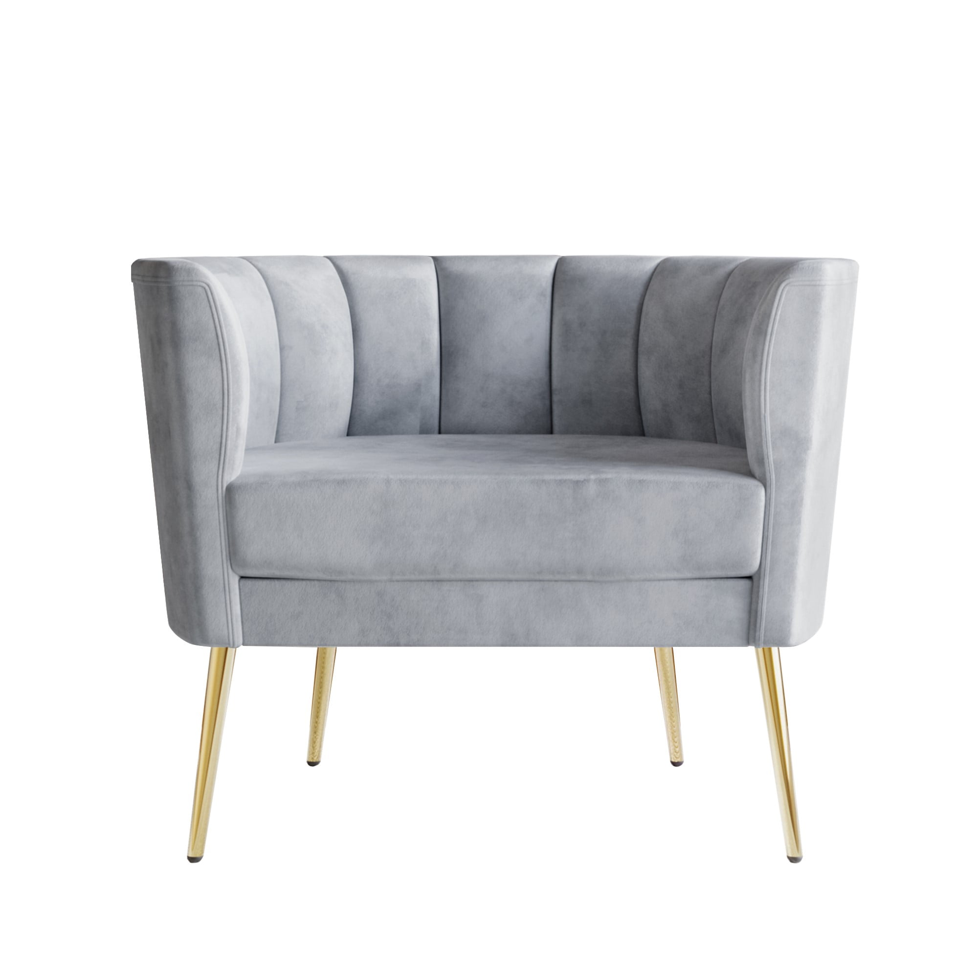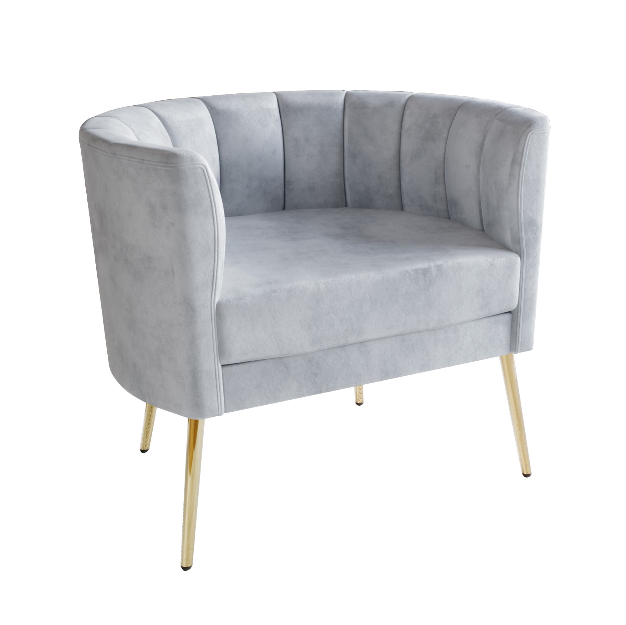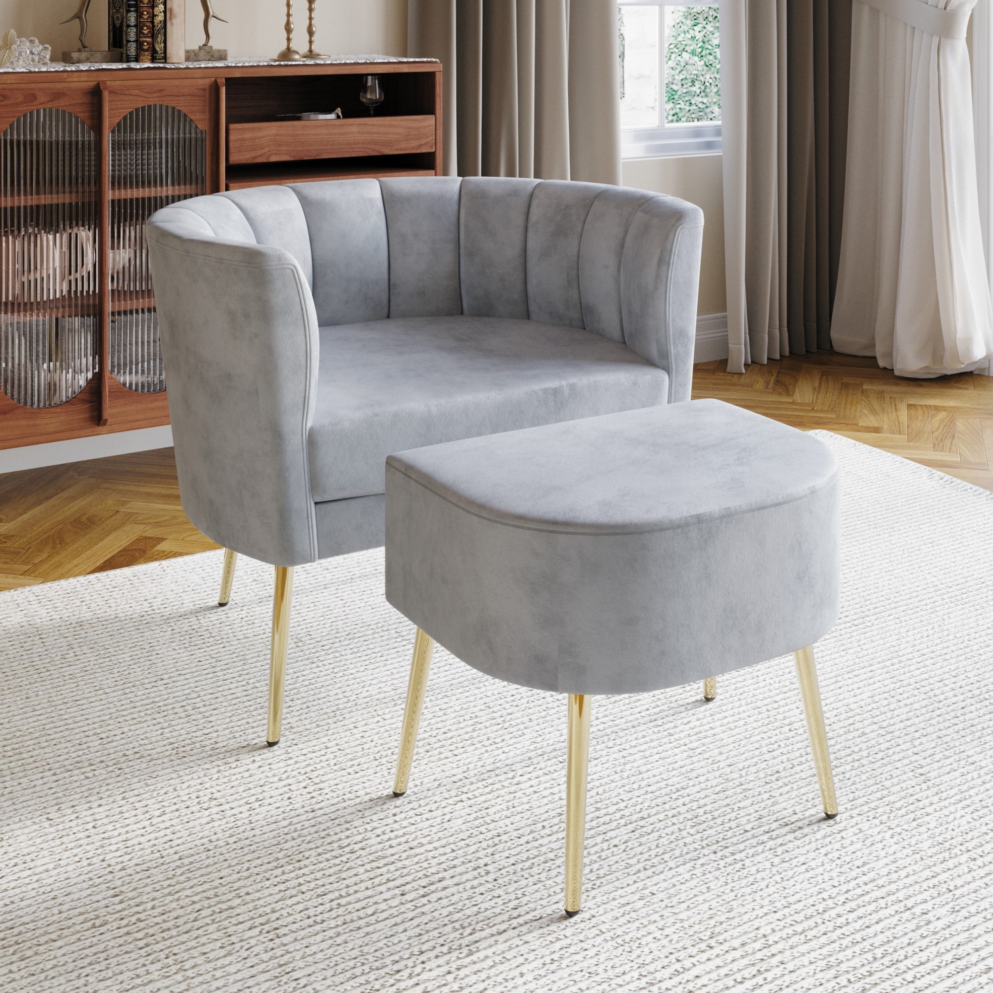 Home Design Moveis Velvet Flared Arm Chair with Stool, Channel-Tufted Back and Metal Legs, Modern Living Room Seating, Silver Gray