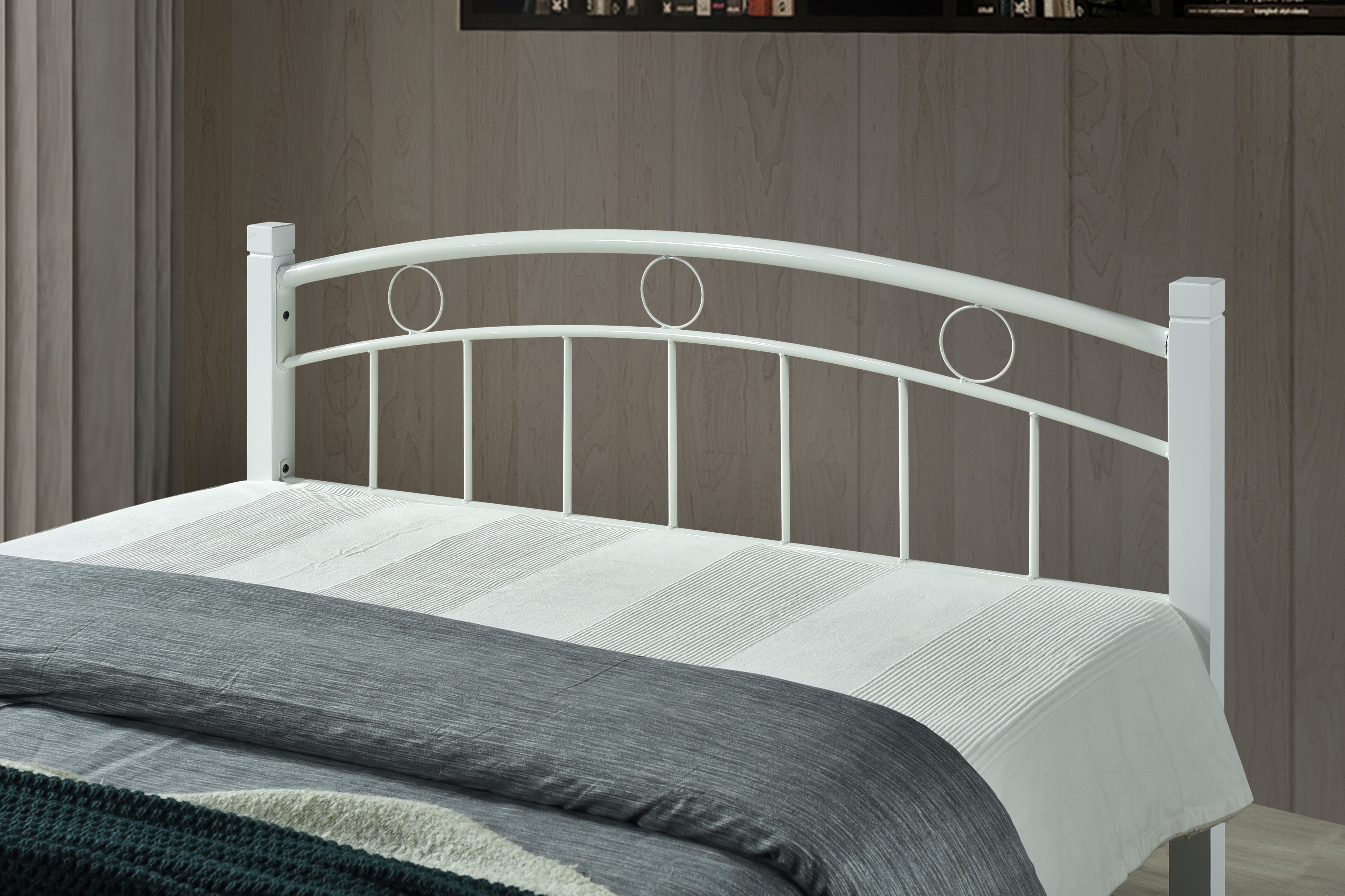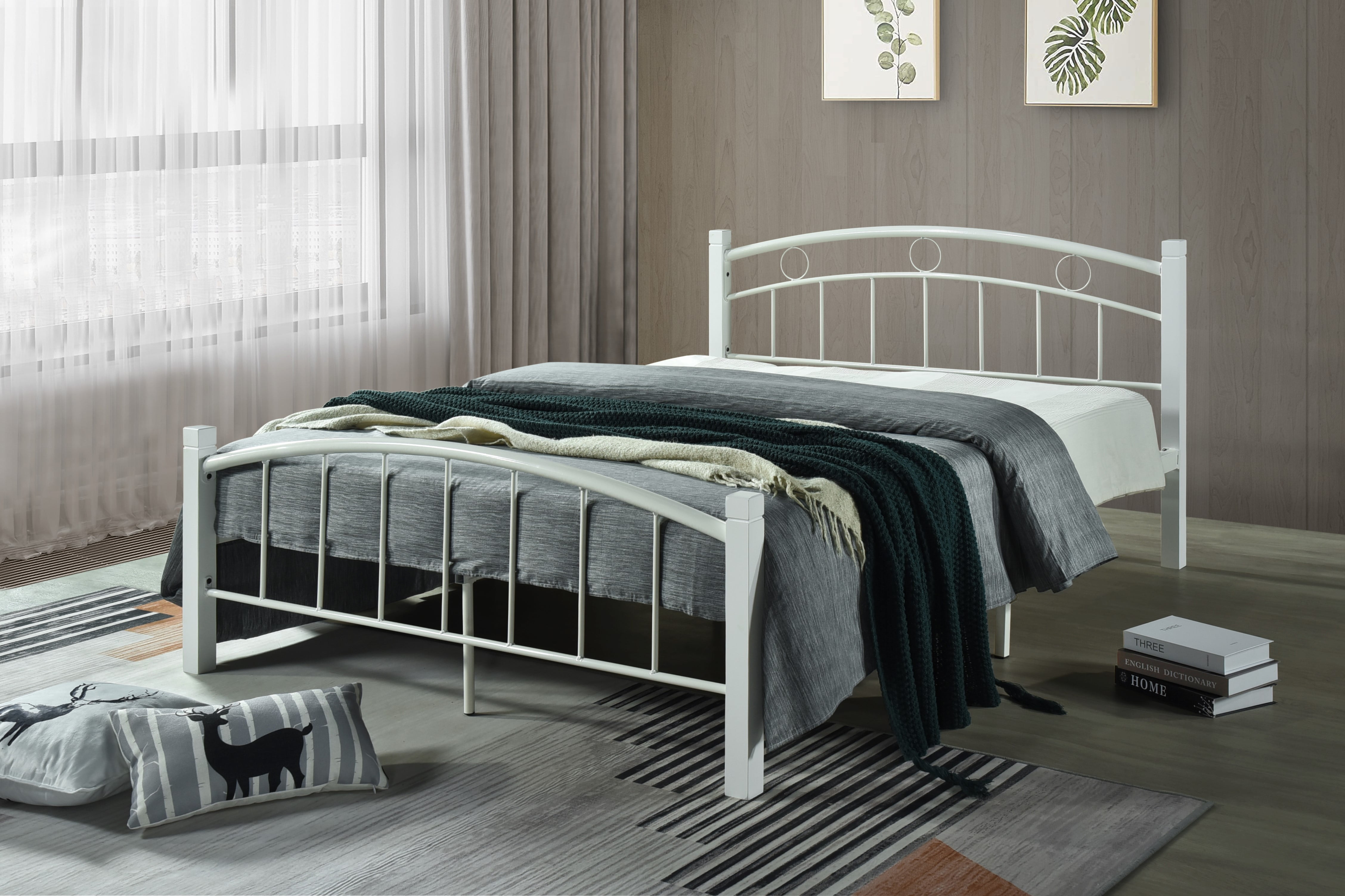 Includes headboard, footboard, platform, rails and leg supports Durable, robust metal frame to handle weights from Twin 250 lbs. and Full/Queen 500 lbs. No box spring needed, platform can fully support mattress White frame with Mahogany color post Low profile for easy getting on and off Contemporary design perfect for Modern and Transitional decors