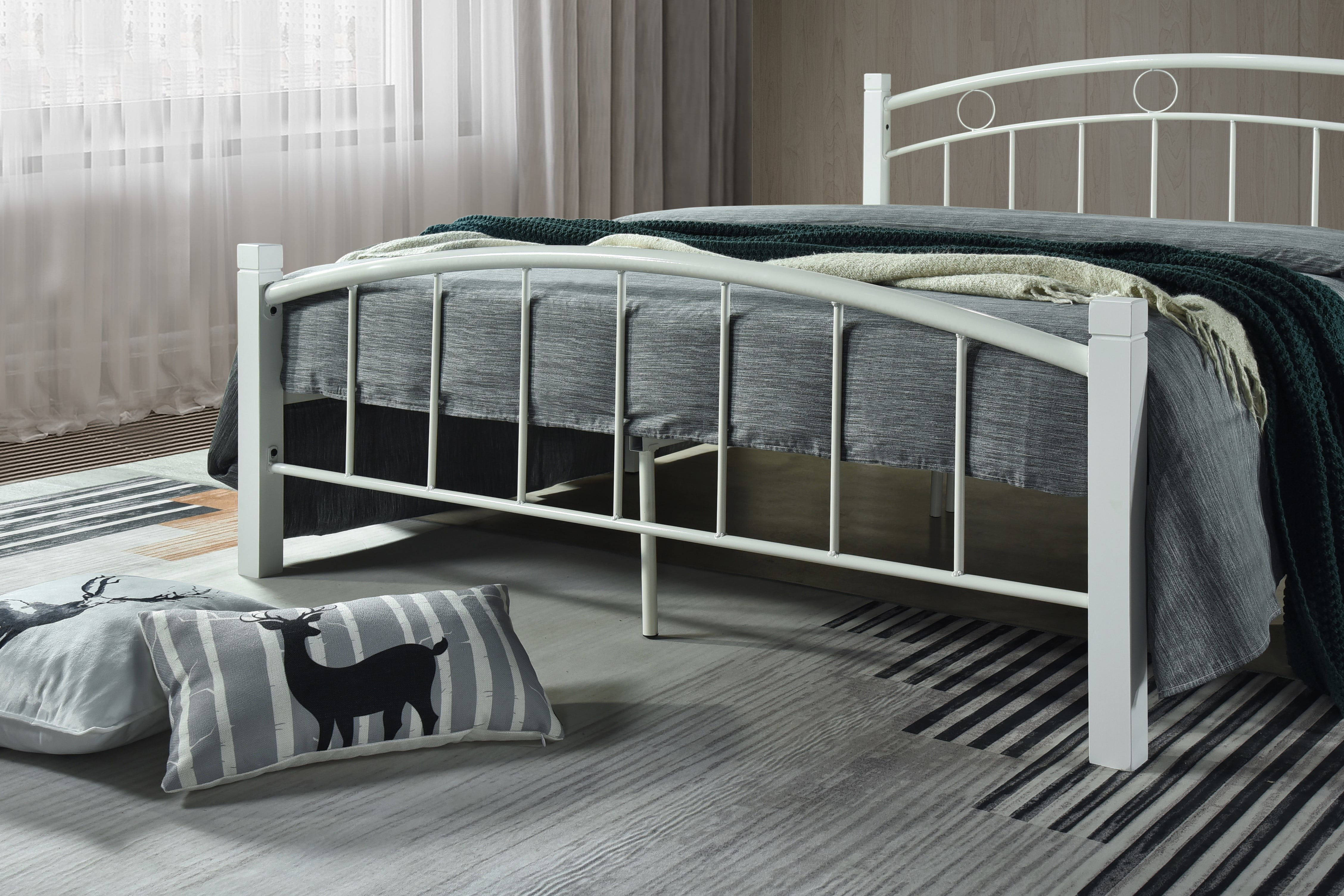 The Hodedah Complete Metal Platform Bed is constructed of a strong, robust metal bed frame. It fully supports your mattress with a complete platform separated into two parts preventing any sagging of your mattress. Reinforced with 2 side support legs and 4 center support legs which makes the platform solid and able to support weights of 250-500 lbs. Contemporary designed with a white frame and mahogany color post, this combination blends well with any room decor. Detailed circular carvings on the headboard contrast the straight lines on the footboard giving a play on shapes and dimension. This bed features a height that is just perfect for getting in and out of effortlessly. Whether your looking to transitional piece or a bed that is long lasting this is the right choice for you.