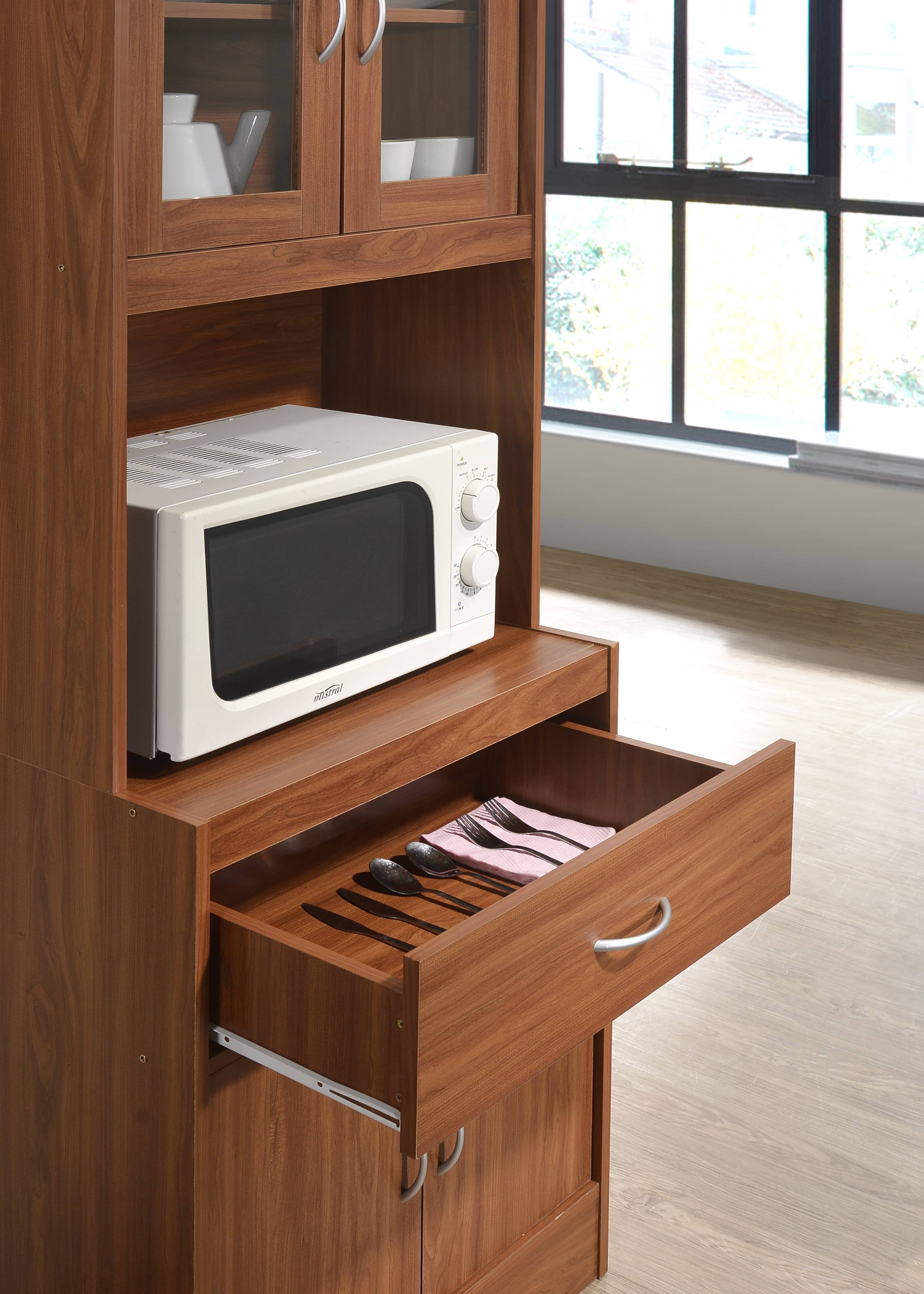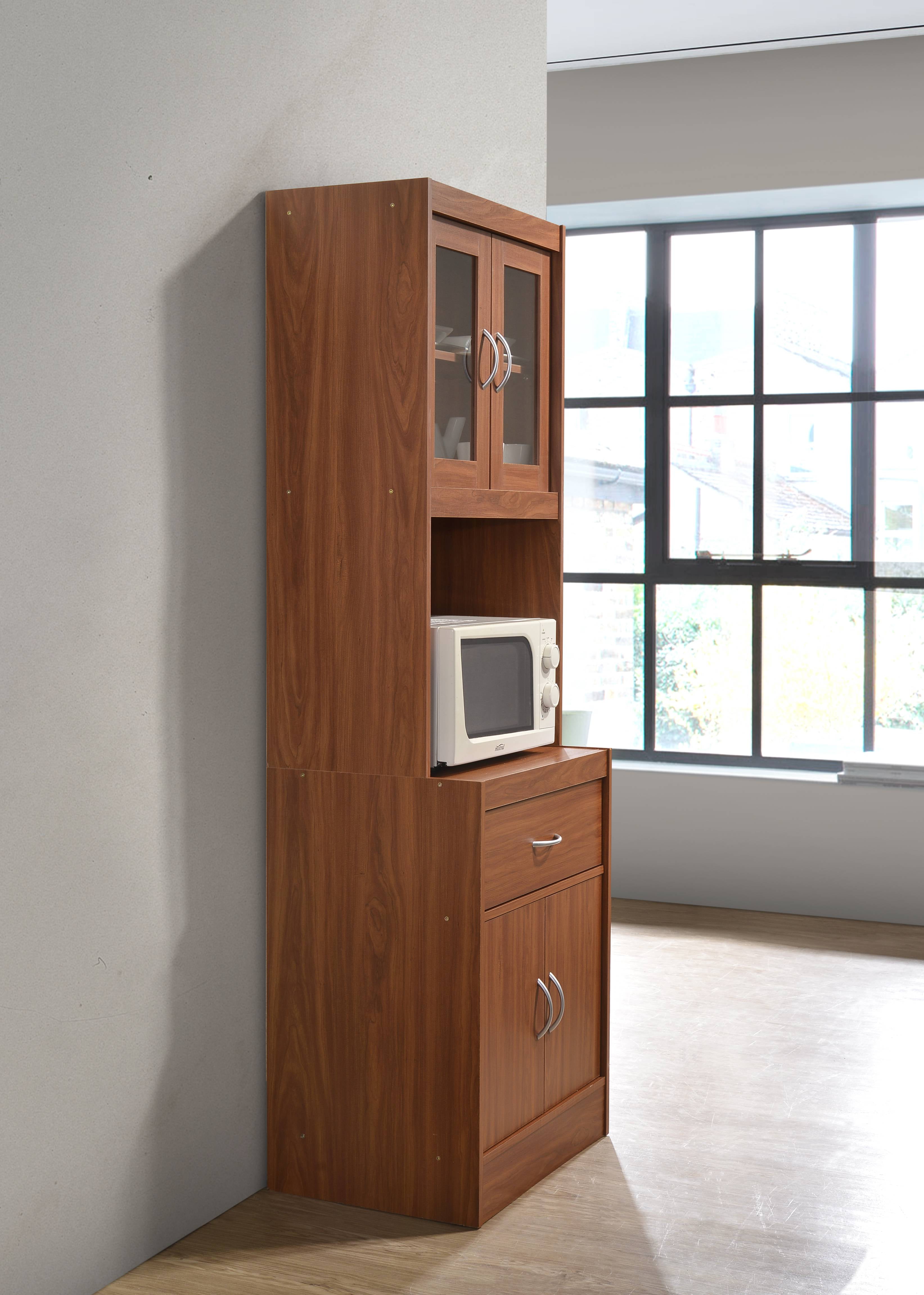 Convenient and accessible way to store your microwave, toaster and other small appliances Transparent doors on the top displays your fancy dinnerware Drawer to store kitchen utensils Constructed of durable engineered wood that will sure to last many years to come Enclosed cabinet on top and bottom of unit to house pots and pans Functional and attractive with its sleek contemporary styling Available in 6 color options: Beech, Black-Beech, Cherry, Chocolate-Grey, Grey-Oak and White