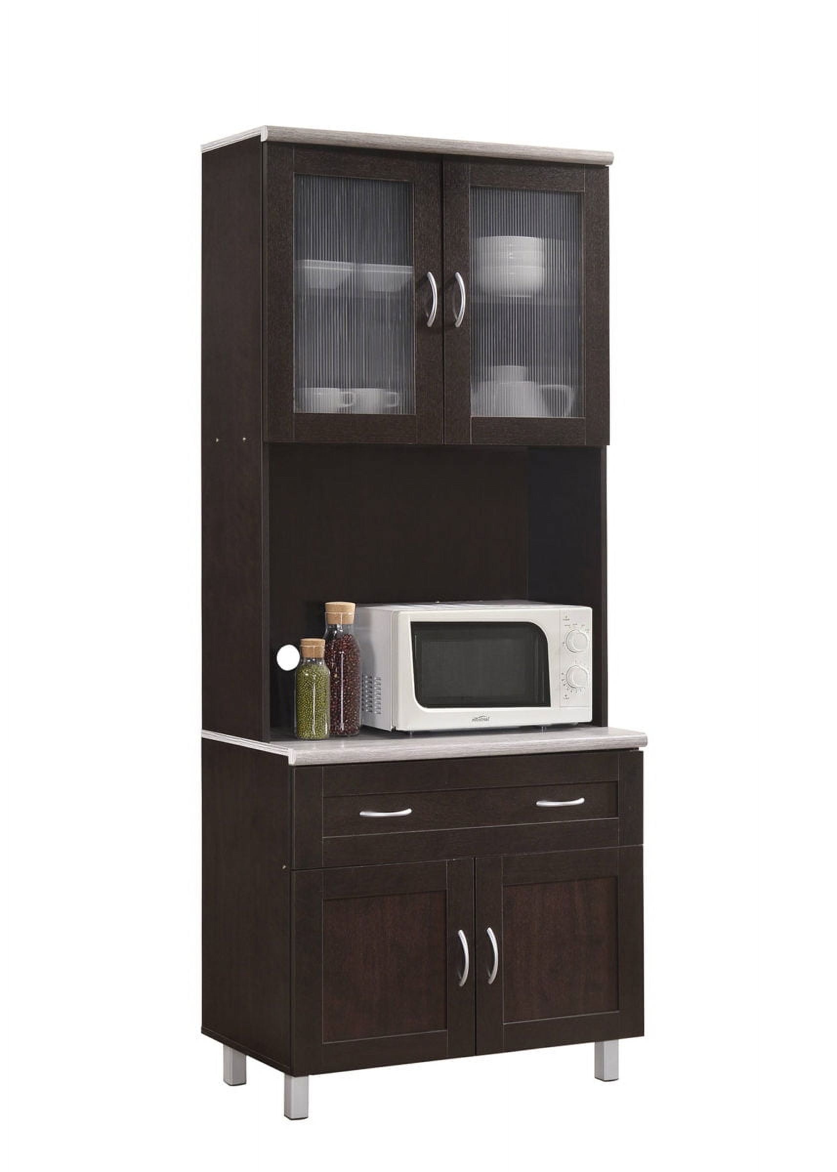 Hodedah Tall Kitchen Cabinet: Convenient and accessible way to store your microwave, toaster and other small appliances Transparent doors on the top displays your fancy dinnerware Drawer to store kitchen utensils Cabinet space to store small appliance, pots and pans and much more Great for home and office kitchen Assembled dimensions: 79 in. H x 32 in. W x 17 in. D Available in Beech, Cherry, White and Chocolate-Grey